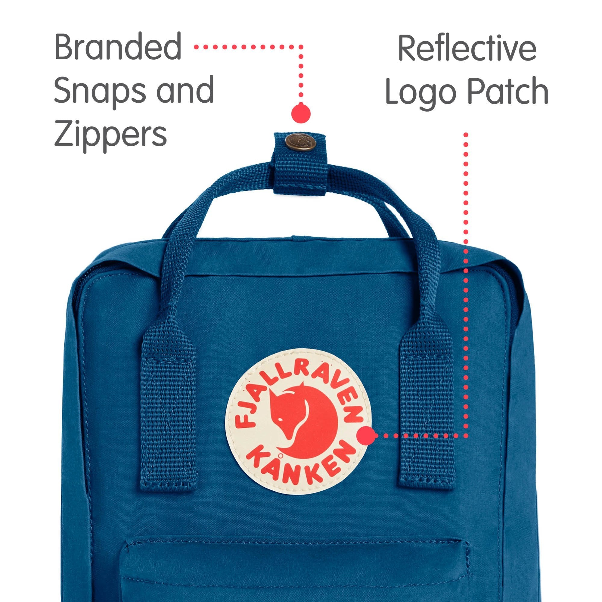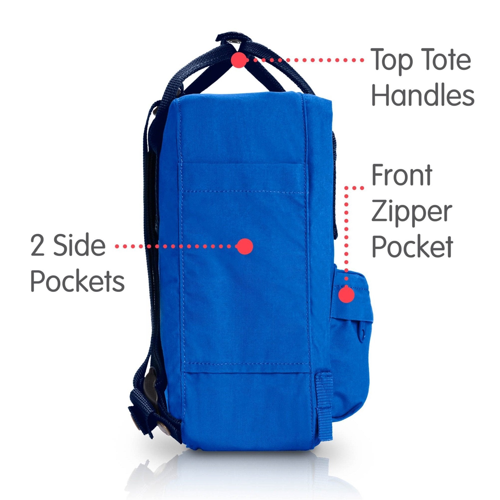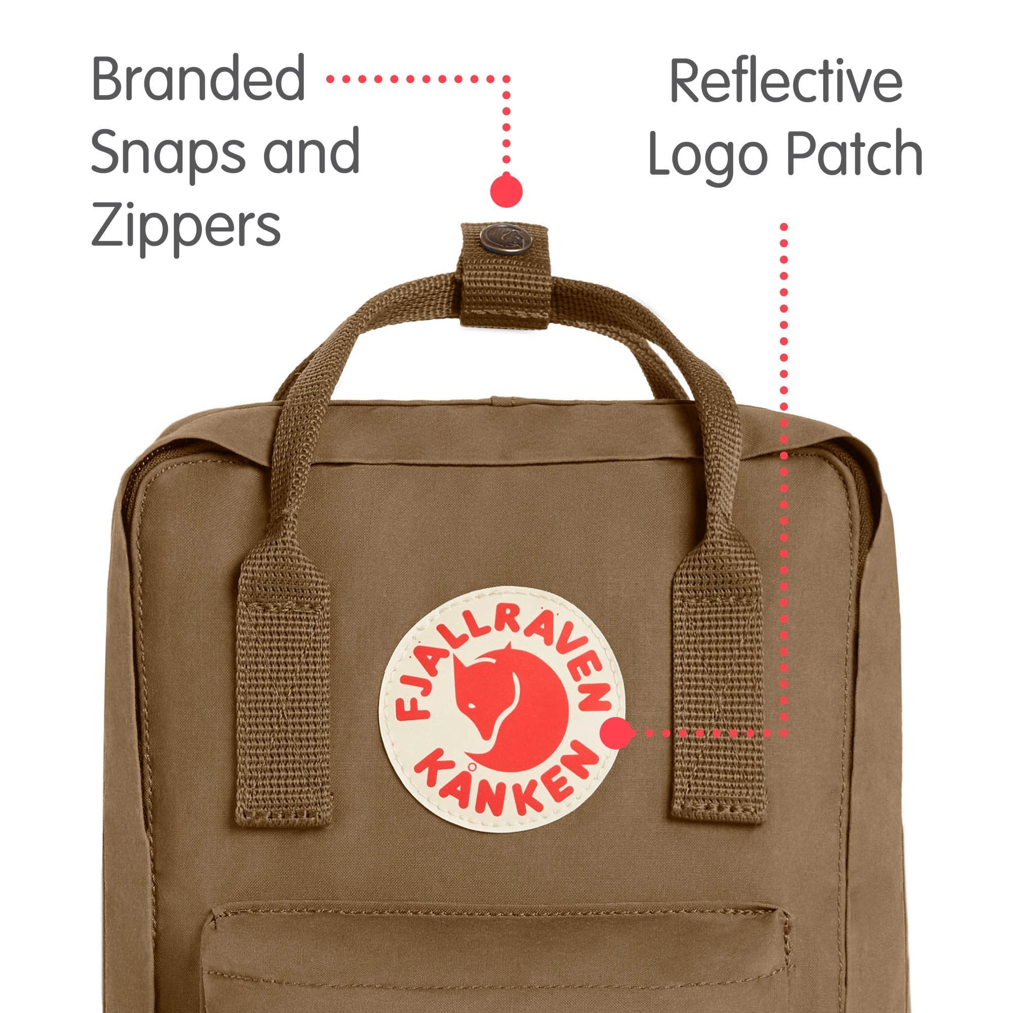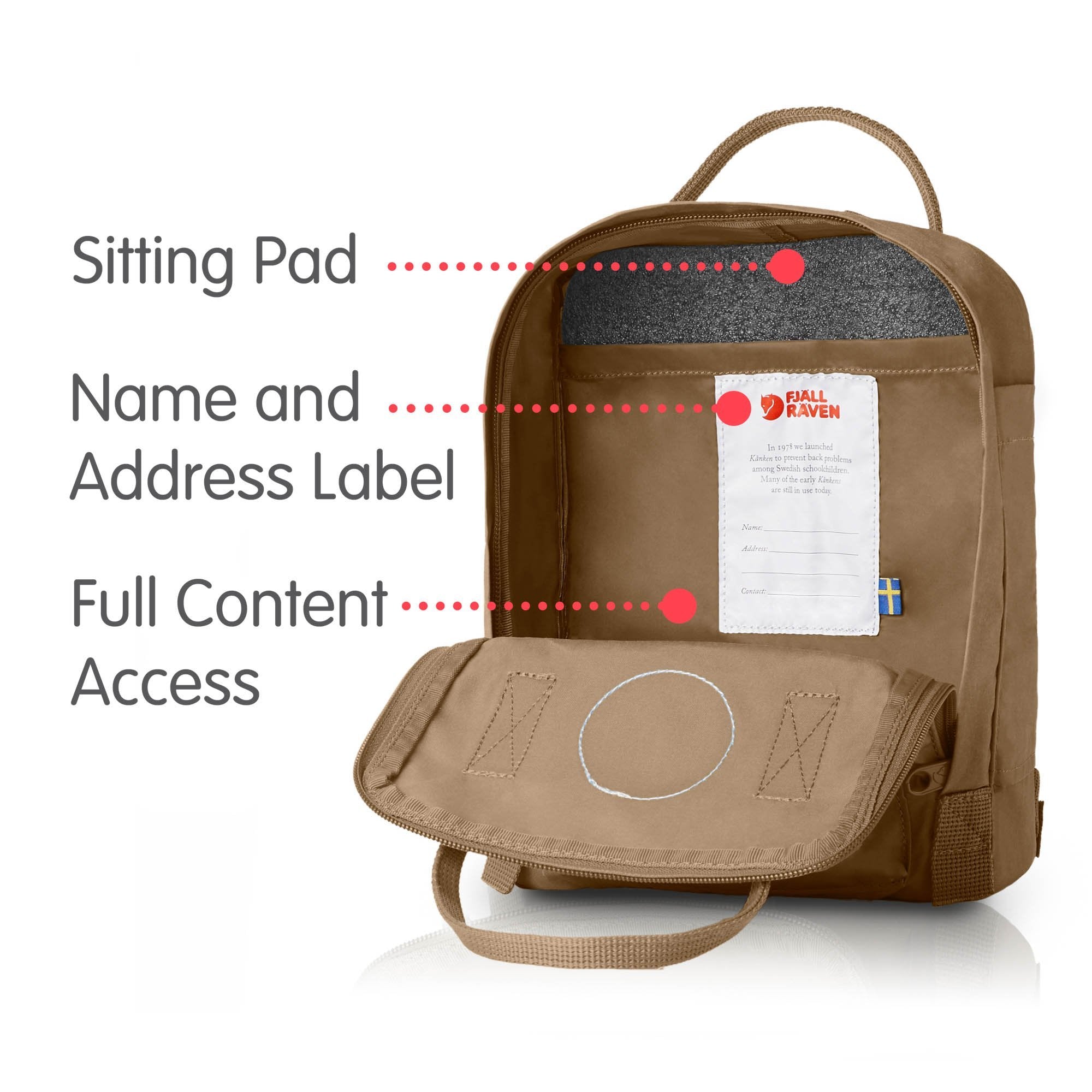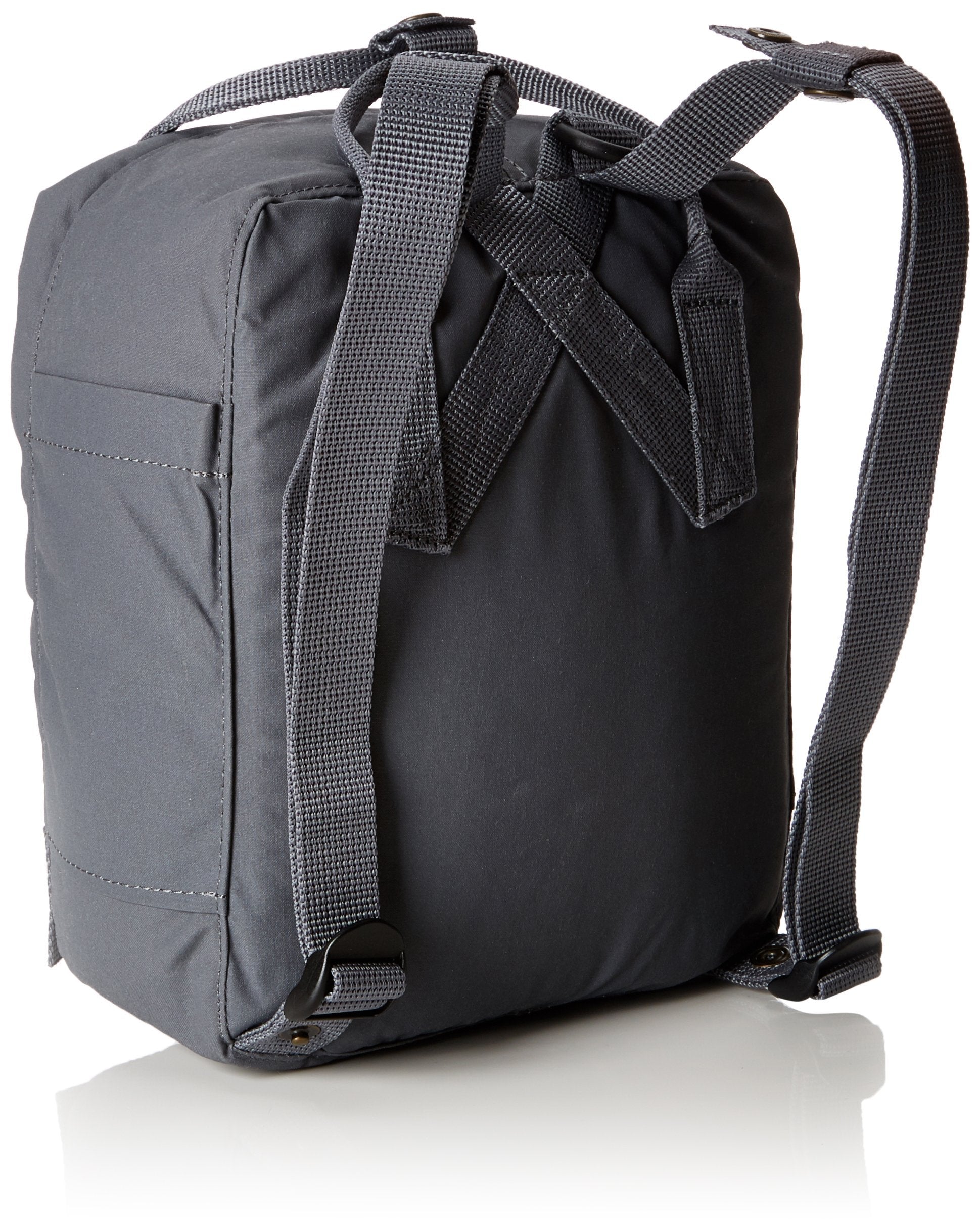 All the fun and practicality of the Kanken in a smaller bag. From kids toparents, the Kanken-Mini has a function for everyone. The Kanken-Mini is madeof durable, lightweight, water resistant Vinylon F. The main compartment has alarge opening making it easier to put in/take out items. Featuring two sidepockets and a zippered pocket in the front. Handle at the top, allowing thebag to be carried as a tote, narrow, flexible shoulder straps, sitting pad inthe pocket in the back and logo that doubles as a reflector.