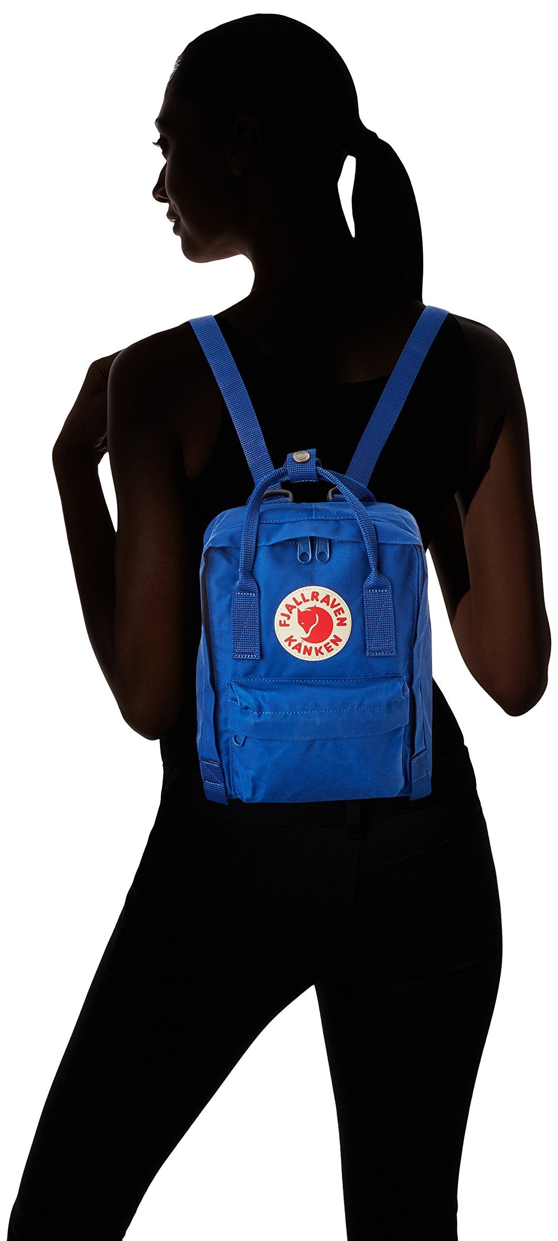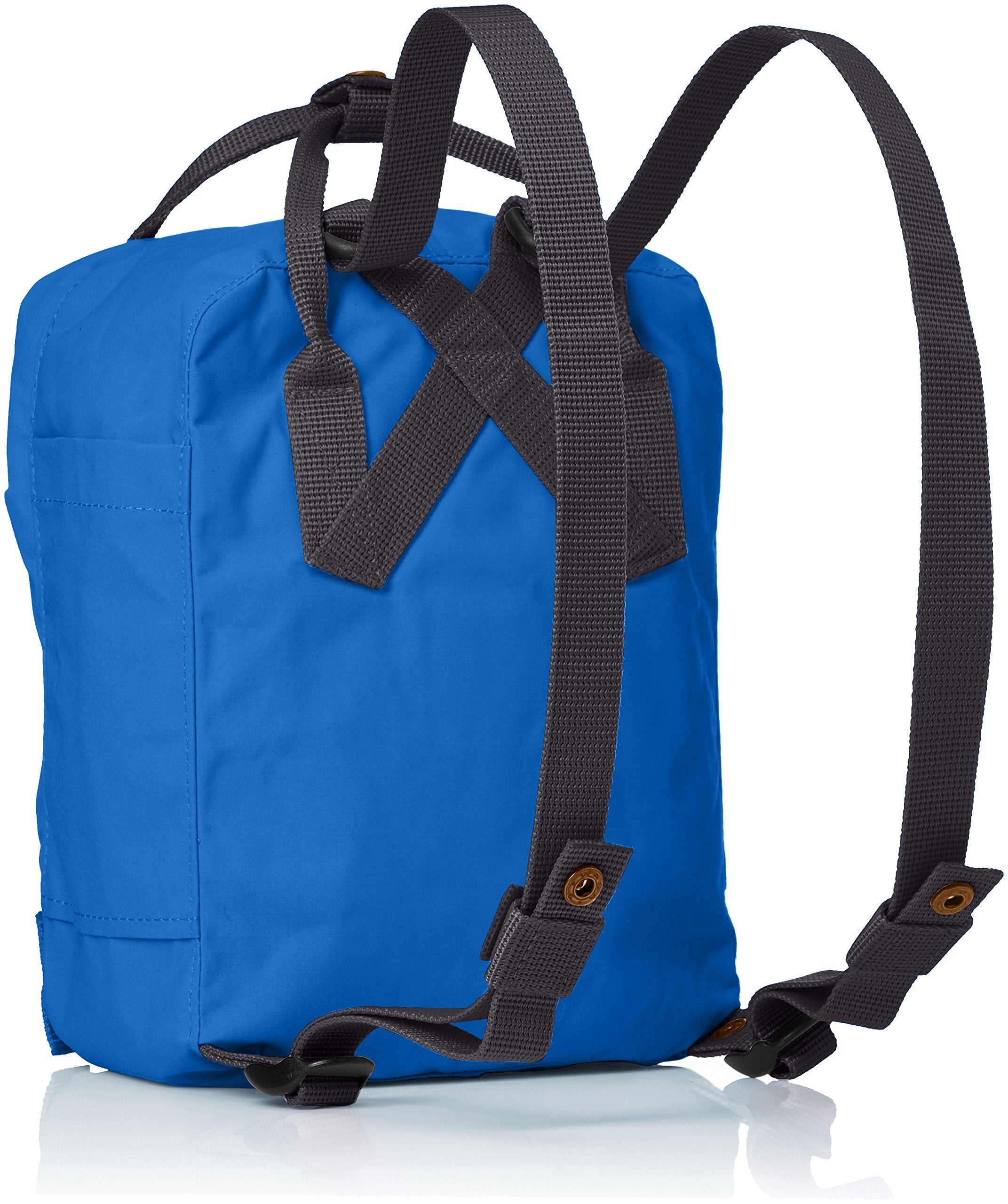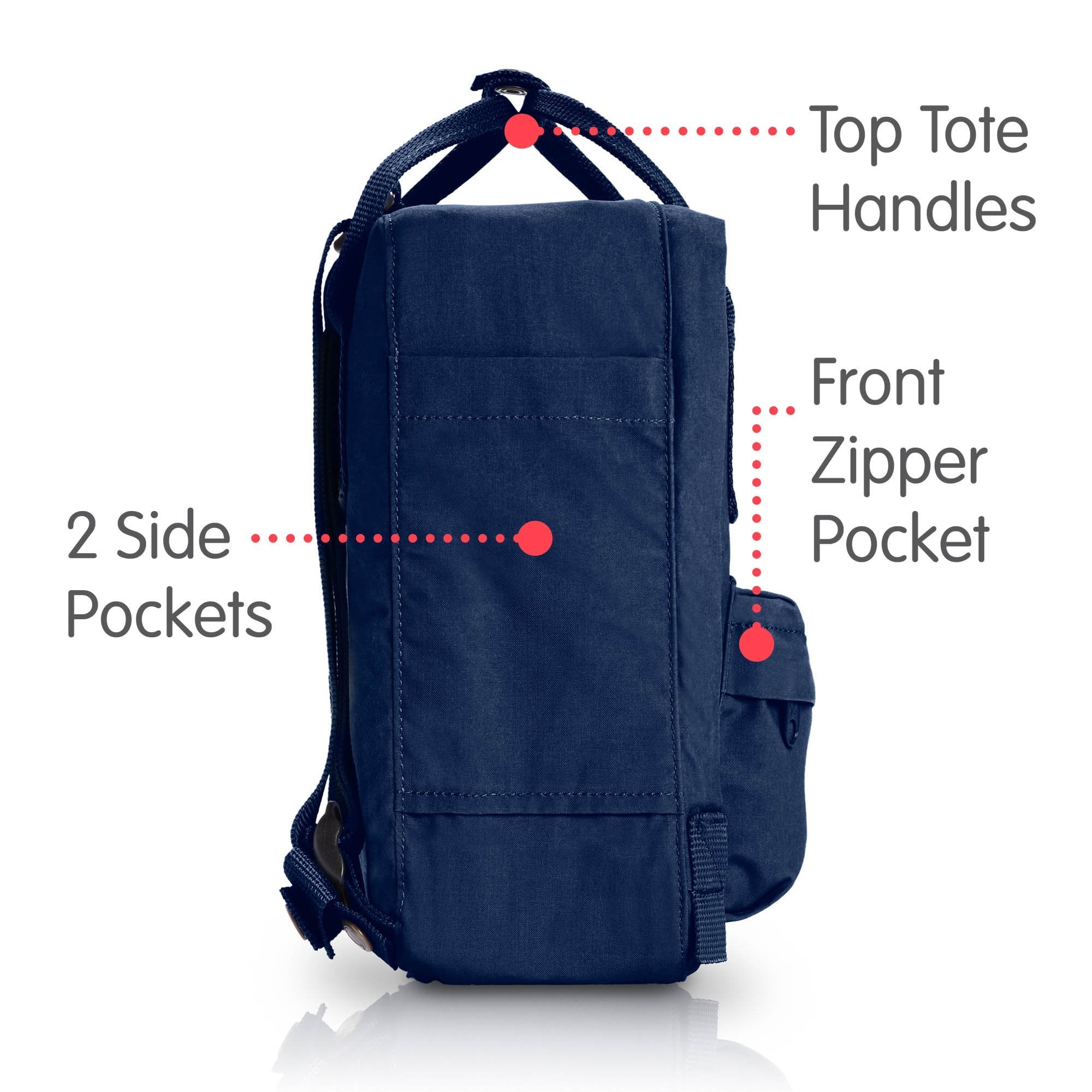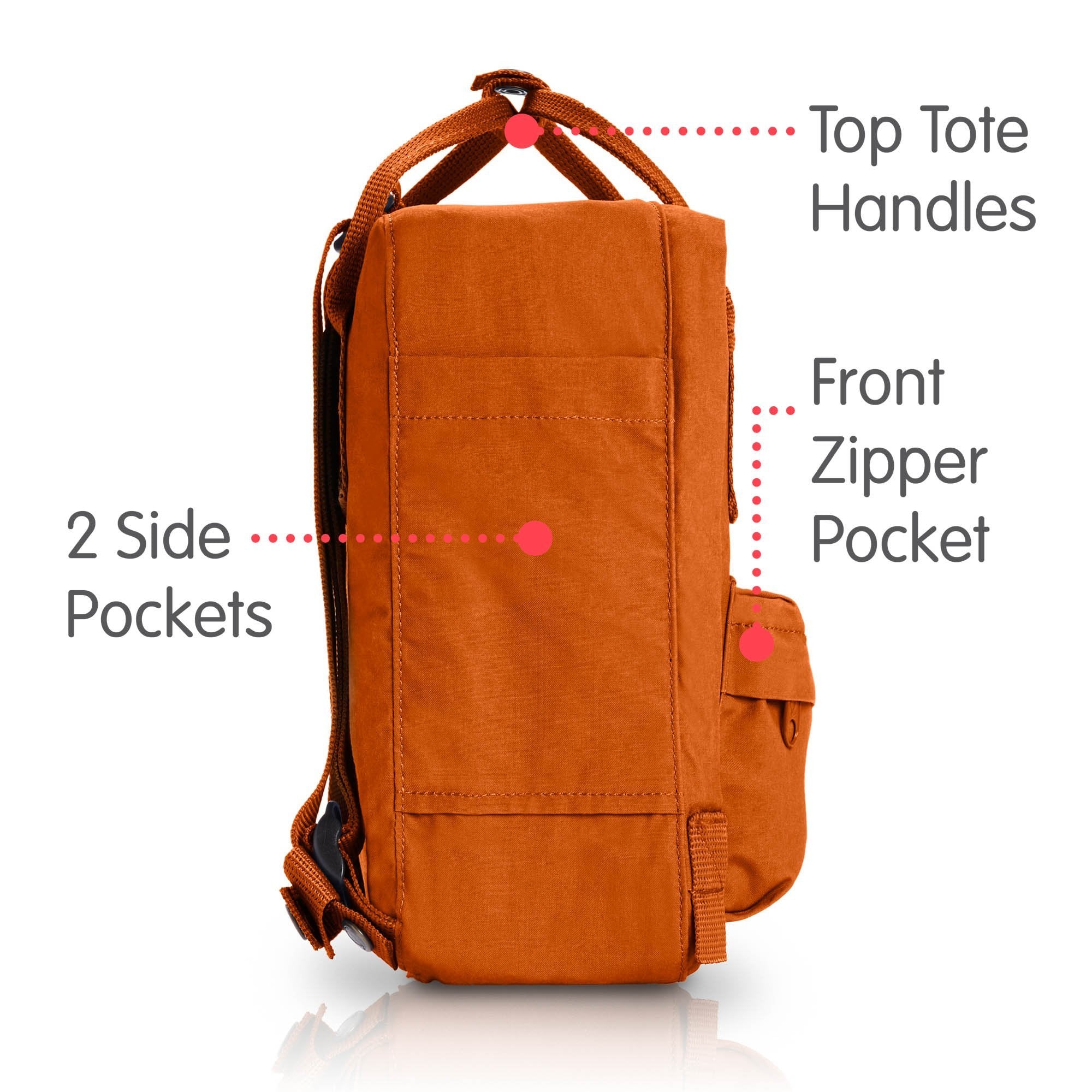 All the fun and practicality of the Kanken in a smaller bag. From kids toparents, the Kanken-Mini has a function for everyone. The Kanken-Mini is madeof durable, lightweight, water resistant Vinylon F. The main compartment has alarge opening making it easier to put in/take out items. Featuring two sidepockets and a zippered pocket in the front. Handle at the top, allowing thebag to be carried as a tote, narrow, flexible shoulder straps, sitting pad inthe pocket in the back and logo that doubles as a reflector.