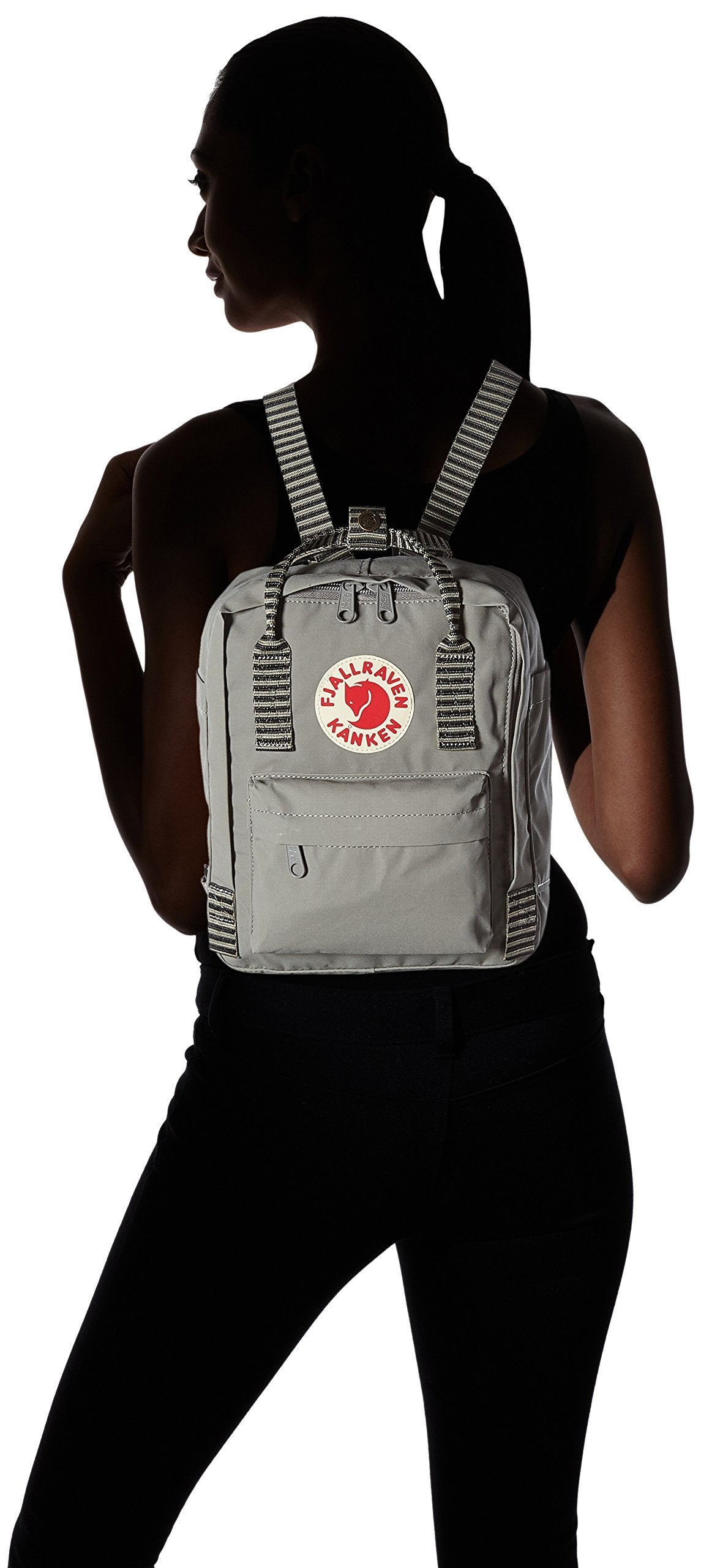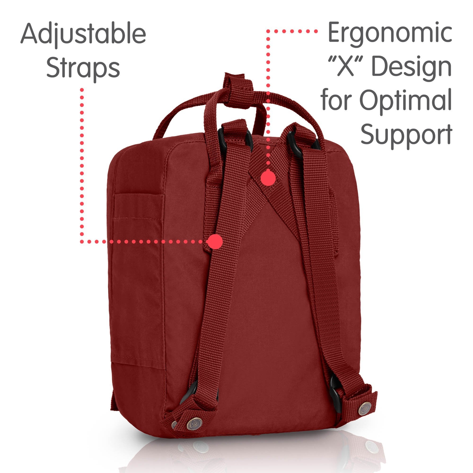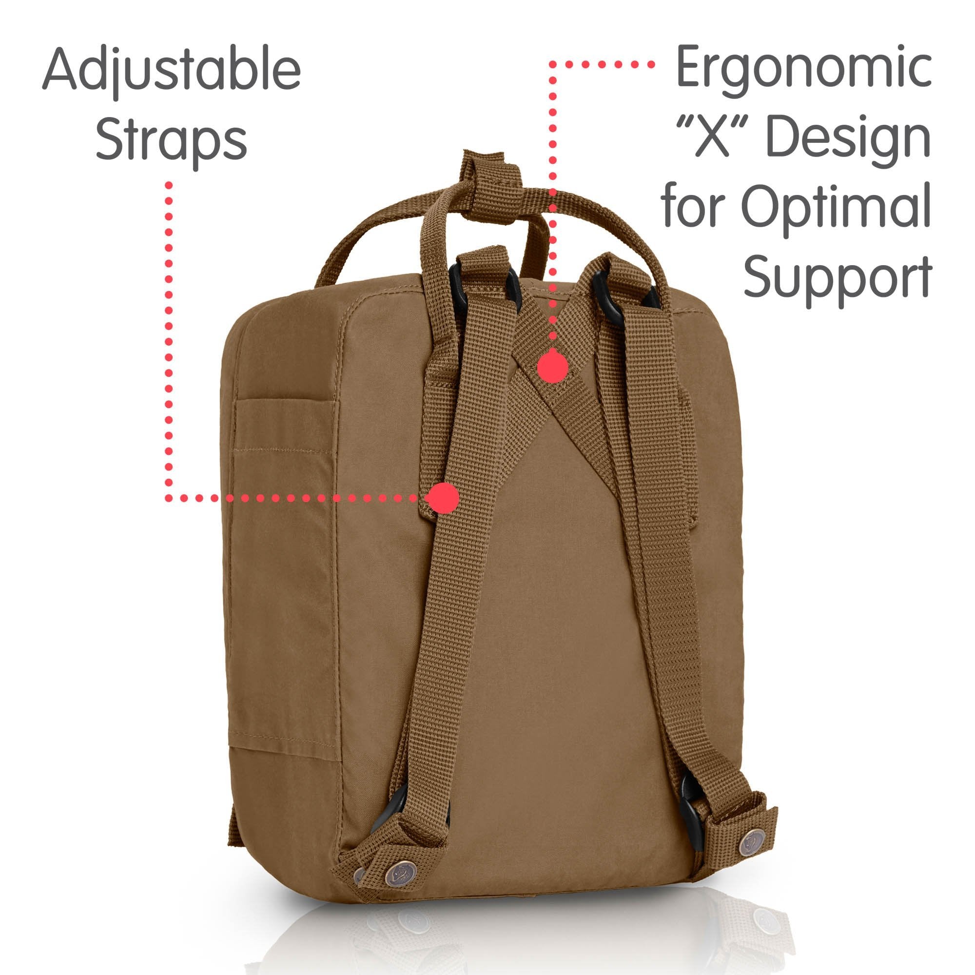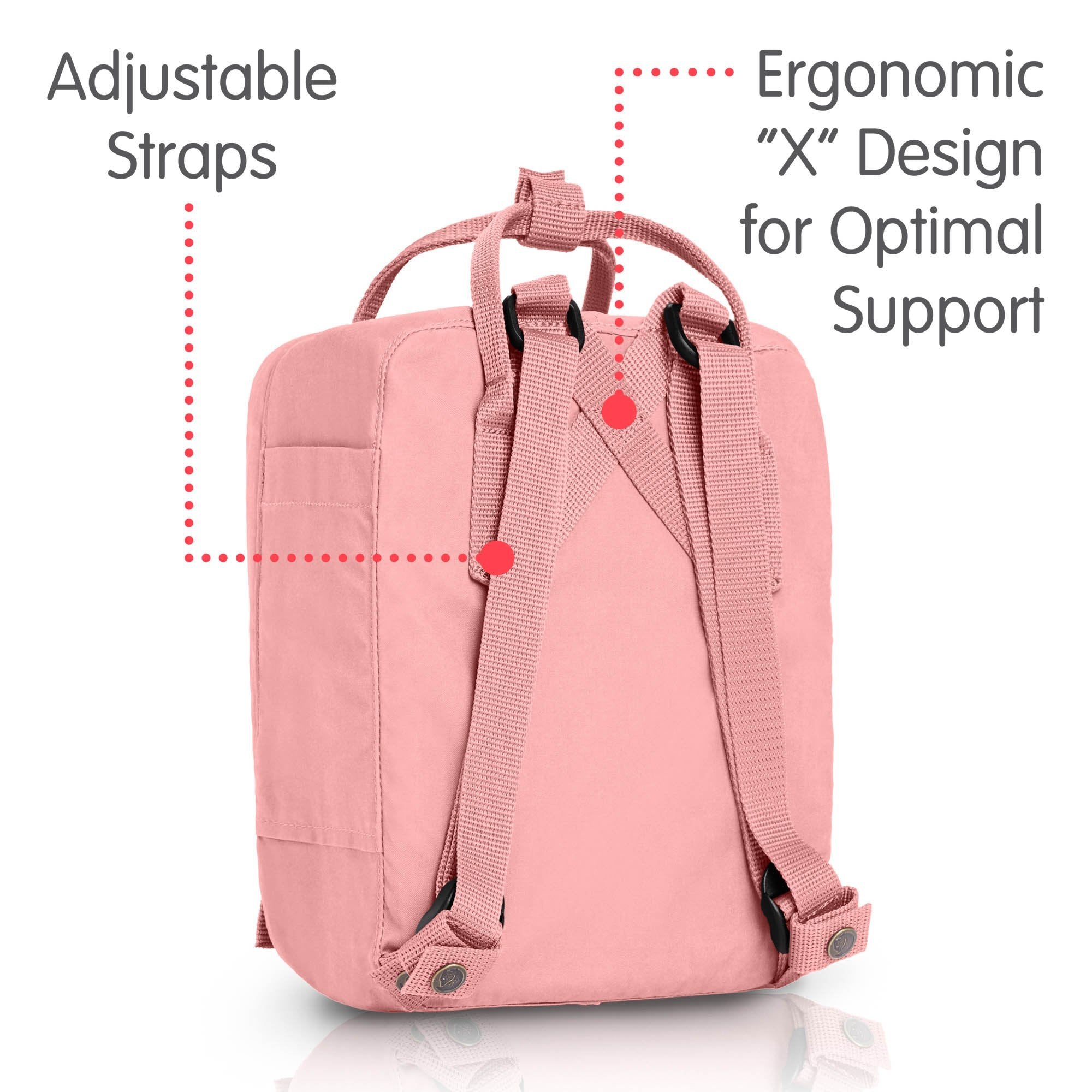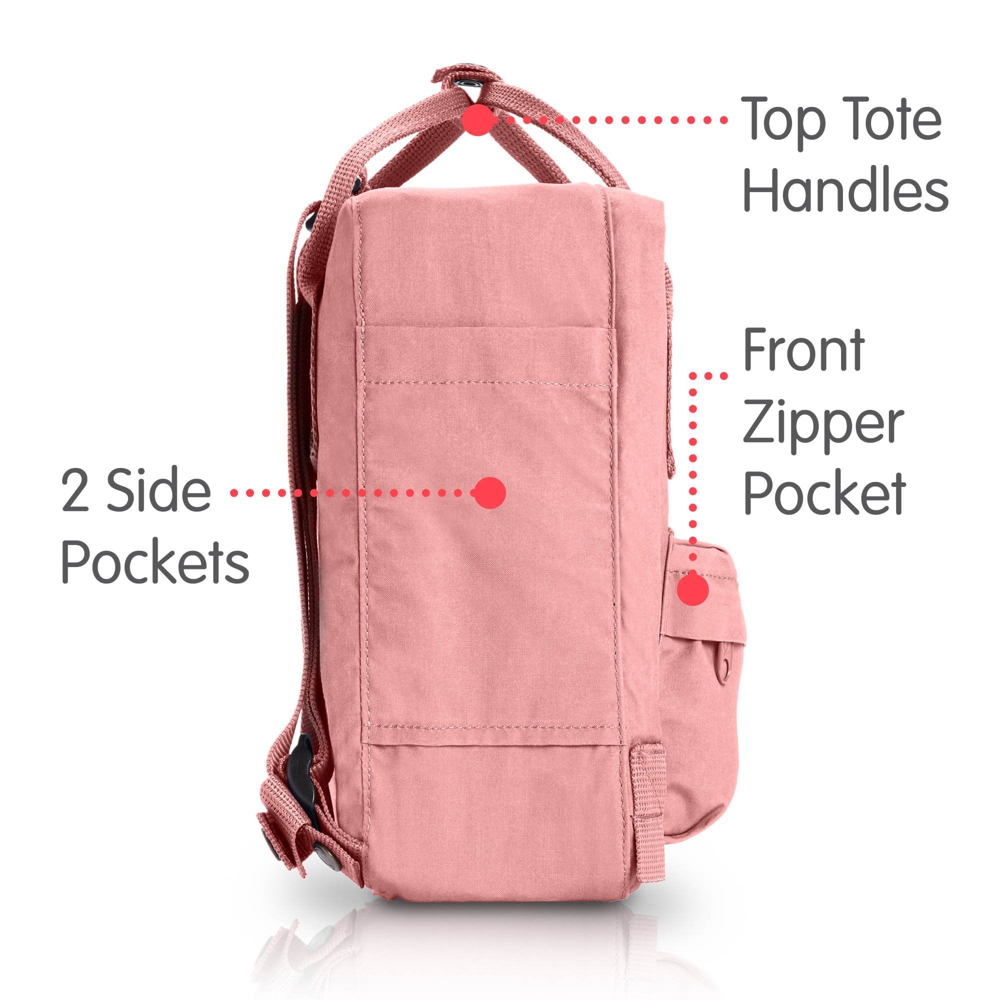 All the fun and practicality of the Kanken in a smaller bag. From kids toparents, the Kanken-Mini has a function for everyone. The Kanken-Mini is madeof durable, lightweight, water resistant Vinylon F. The main compartment has alarge opening making it easier to put in/take out items. Featuring two sidepockets and a zippered pocket in the front. Handle at the top, allowing thebag to be carried as a tote, narrow, flexible shoulder straps, sitting pad inthe pocket in the back and logo that doubles as a reflector.