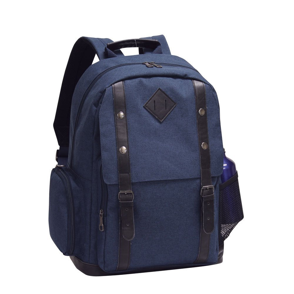 This stylish, handsome backpack is decorated with dual belt straps with magnetic snaps that makes it stand out from the crowd! This backpack is packed with pockets and features. The front zipper pocket includes a padded tablet pocket and a full organizer for accessories. A zip pocket underneath the flap stores your valuable items. The main compartment features a padded sleeve that fits up to a 15.4 laptop. The sides of this backpack feature a zipper compartment and a mesh pocket.