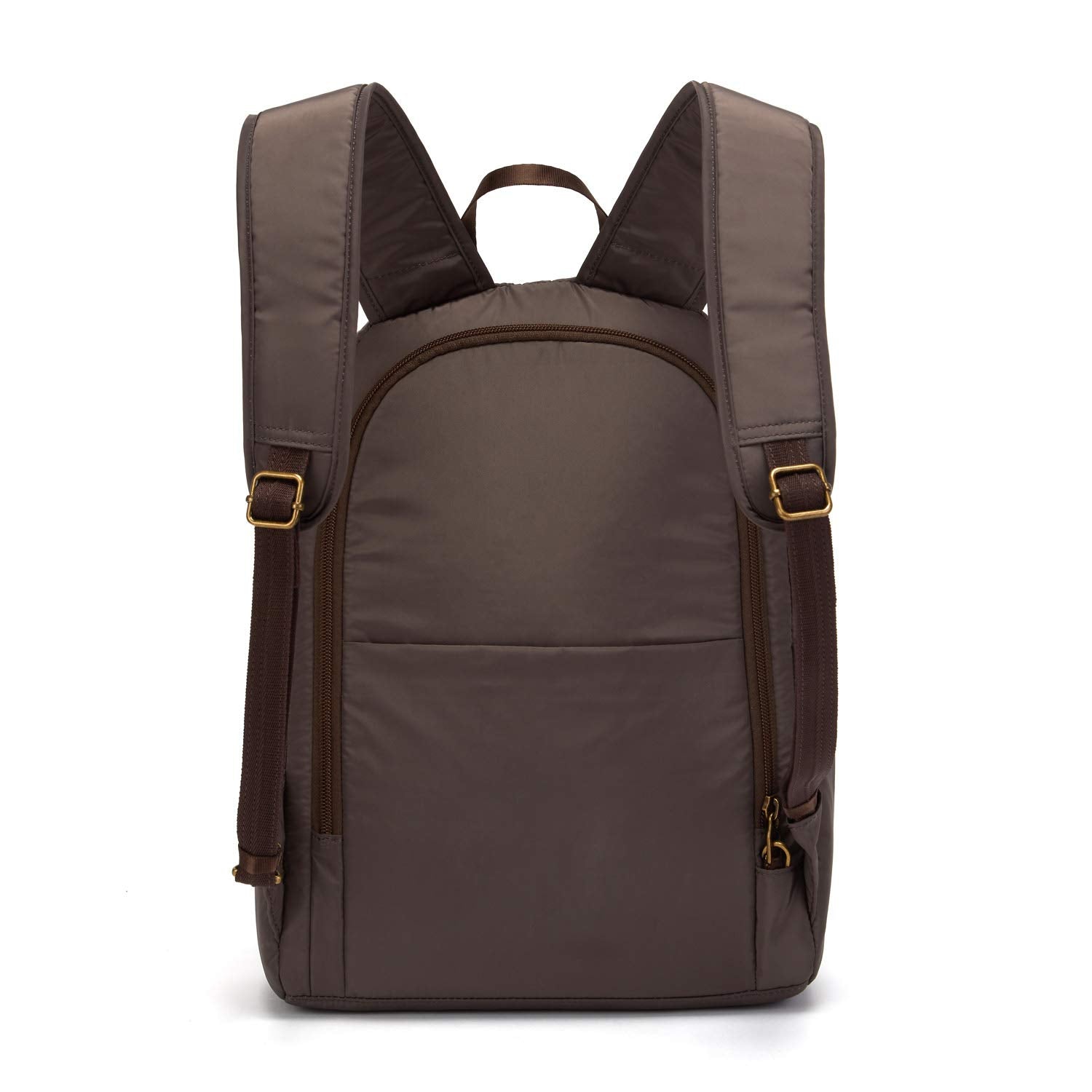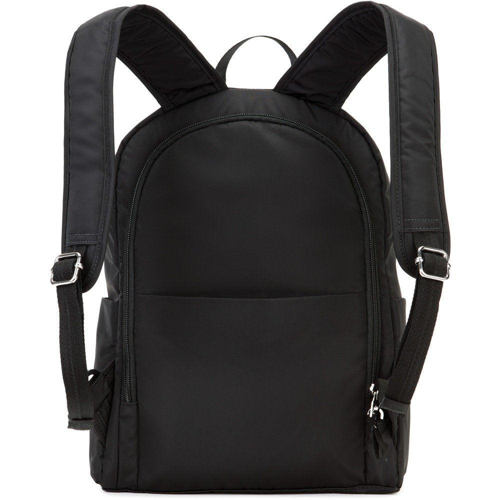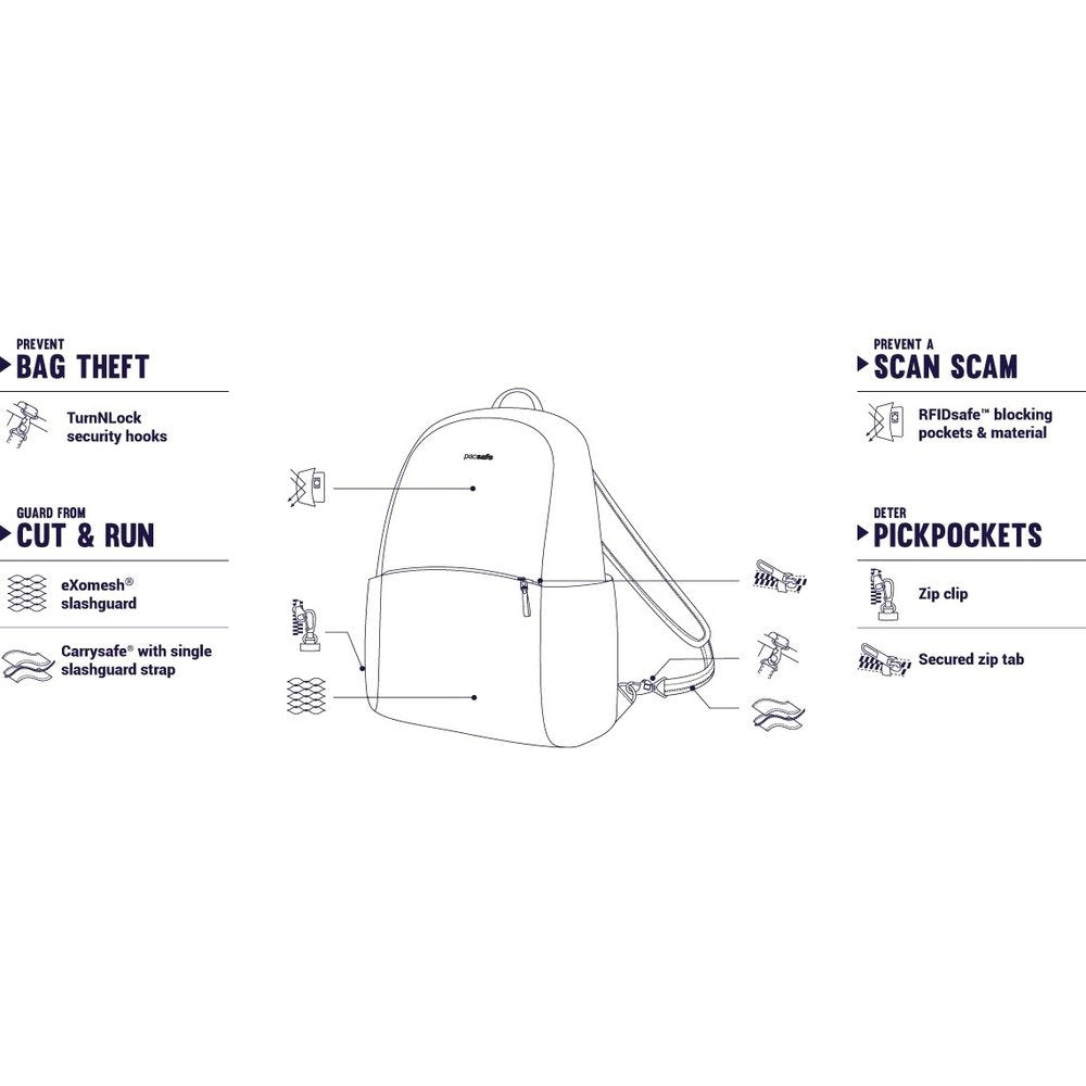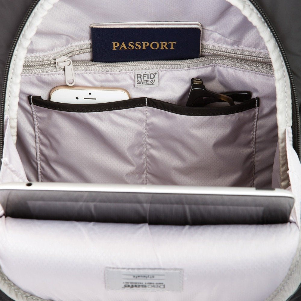 The Pacsafe Stylesafe Backpack features a main compartment zipper accessed from the back making it even harder to for pickpockets to access; Fits a 10 inch tablet; Hidden pocket; Phone pocket; Internal pockets to keep your gear organized; Internal attachment point for wallets and keys; Pen loop; Water bottle pocket