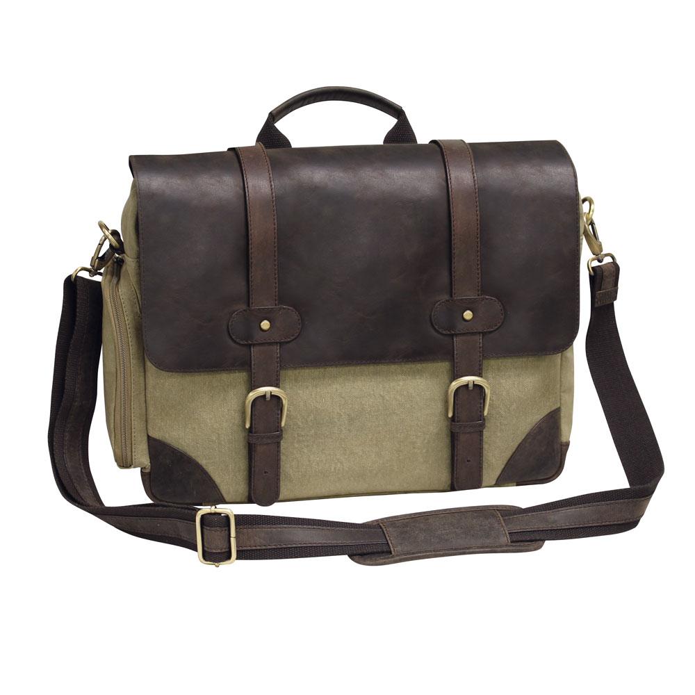 This chic flap-over brief is built to last with an ageless appeal. Made of heavy-duty 20 oz. Canvas and full grain leather. It features dual belt straps with magnetic snap closure on the flap. Beneath the flap reveals a large open pocket with 2 open pockets, 3 card pockets and 2 pen loops inside. The main compartment has a zipper top and inside, there is a zipper pocket and a 15.4" padded laptop sleeve. On the back, there is a large zipper pocket for documents and a zip pocket on the side for small items. It is finished with a top carry handle and a removable shoulder strap.