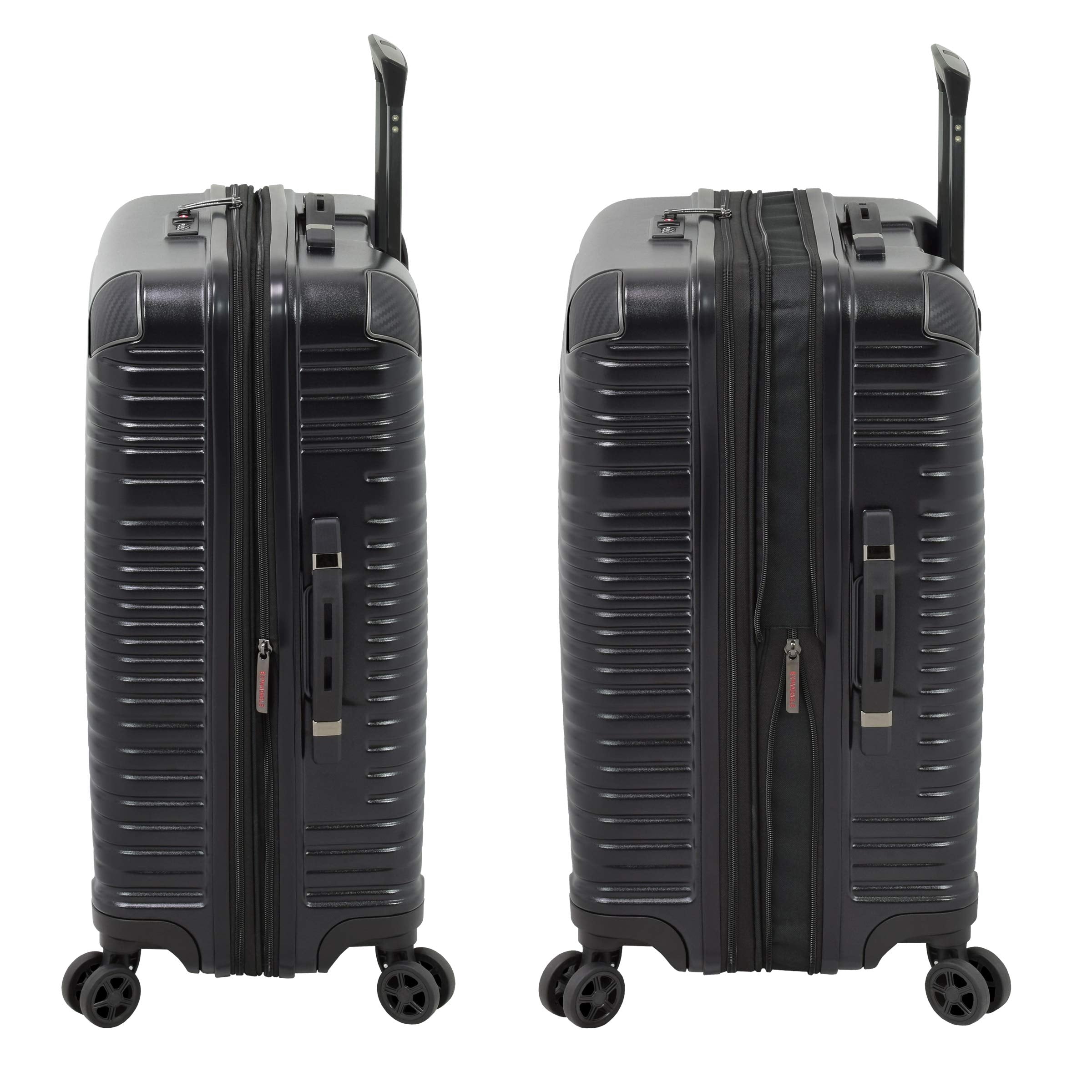 • Interior has two zippered dividers, two shoe pockets & zippered mesh pocket. Packing cradle for organization & securing packed items. Spinner cases expand 2" for additional packing capacity.