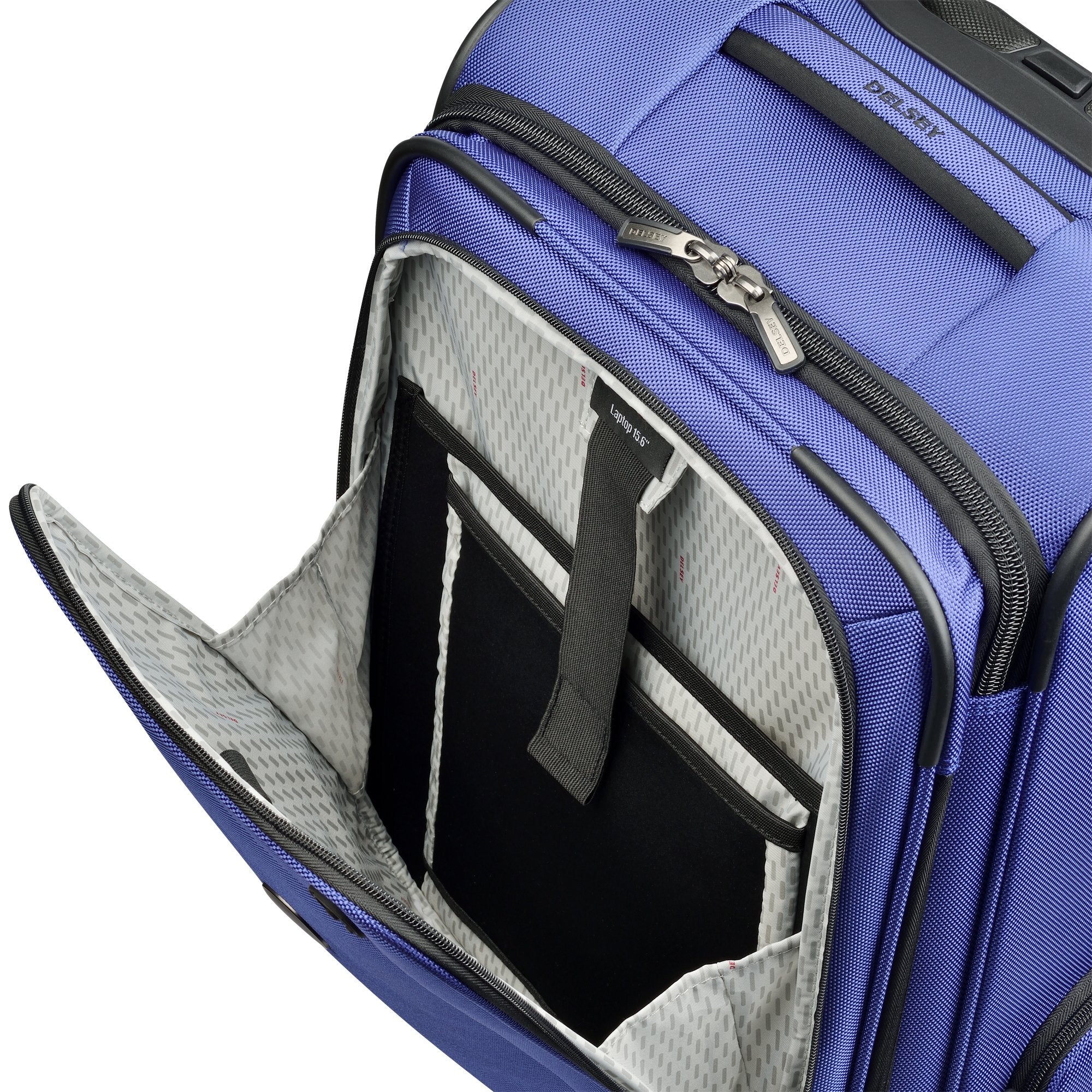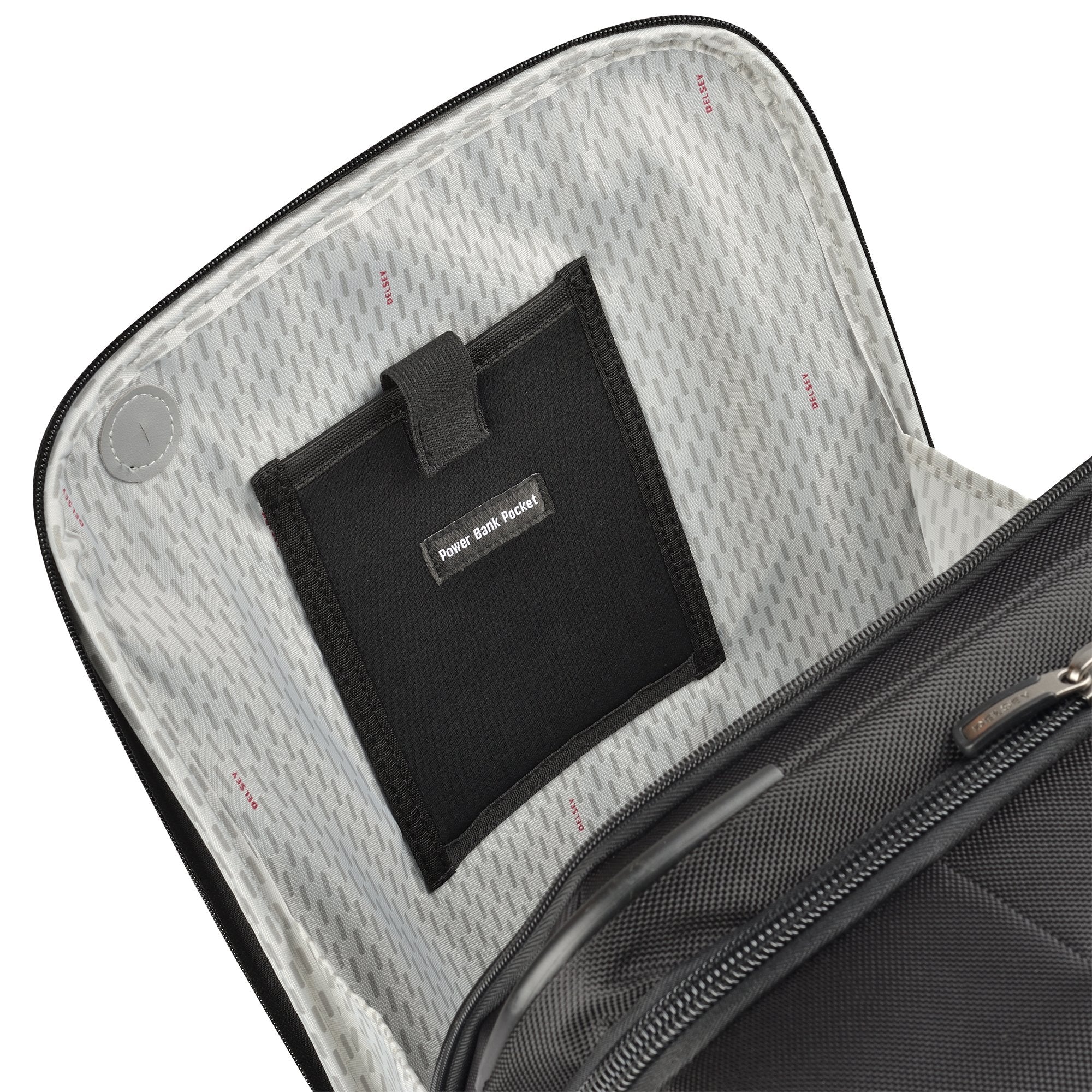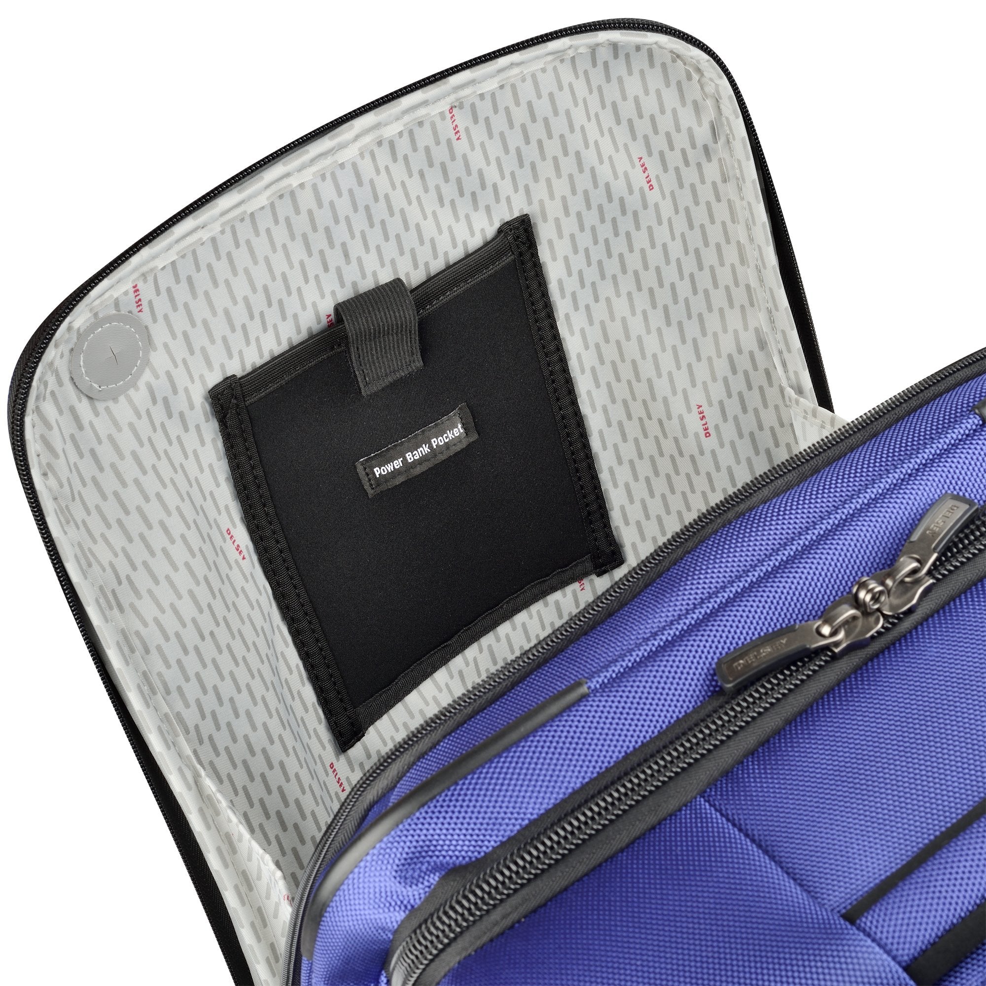 Constructed of durable ballistic nylon to resist wear, moisture, dirt and abrasion. Double protective neoprene sleeves for a tablet and up to a 15.6" laptop. Side easy-access compartment for shoes, toiletries or return home laundry. Injected kick plate and reinforced corners for additional protection. Rubberized, TPR non slip grip on trolley handle. Interlocking sliders on main compartment to secure contents with a lock. Interlocking sliders on fron pocket to secure electronics. Removable 3-1-1 pouch for toiletries. Dedicated neoprene pocket for power bank and cable port to charge electronics on the go. Dual-position trolley system for 2 or 4 wheel use. Double spinner wheels. Recessed neoprene top and side carry handles for comfort when lifting a fully packed case. Easy to grab bottom handle. Large outside pocket for organization. Integrated ID Tag. Interior elastic tie-down straps. Three interior zippered pockets. Zippered divider in lid for maximum organization. Expandable main compartment.