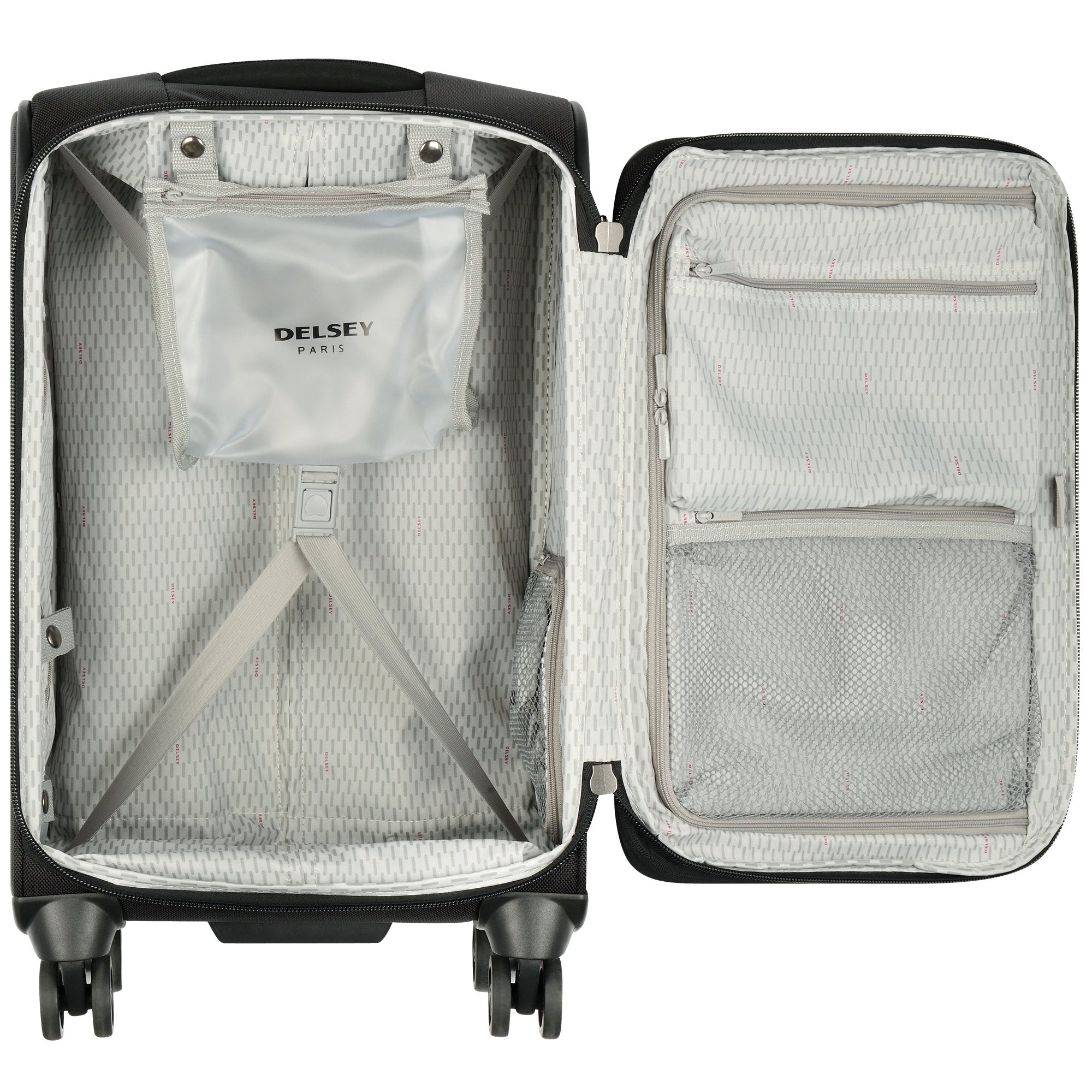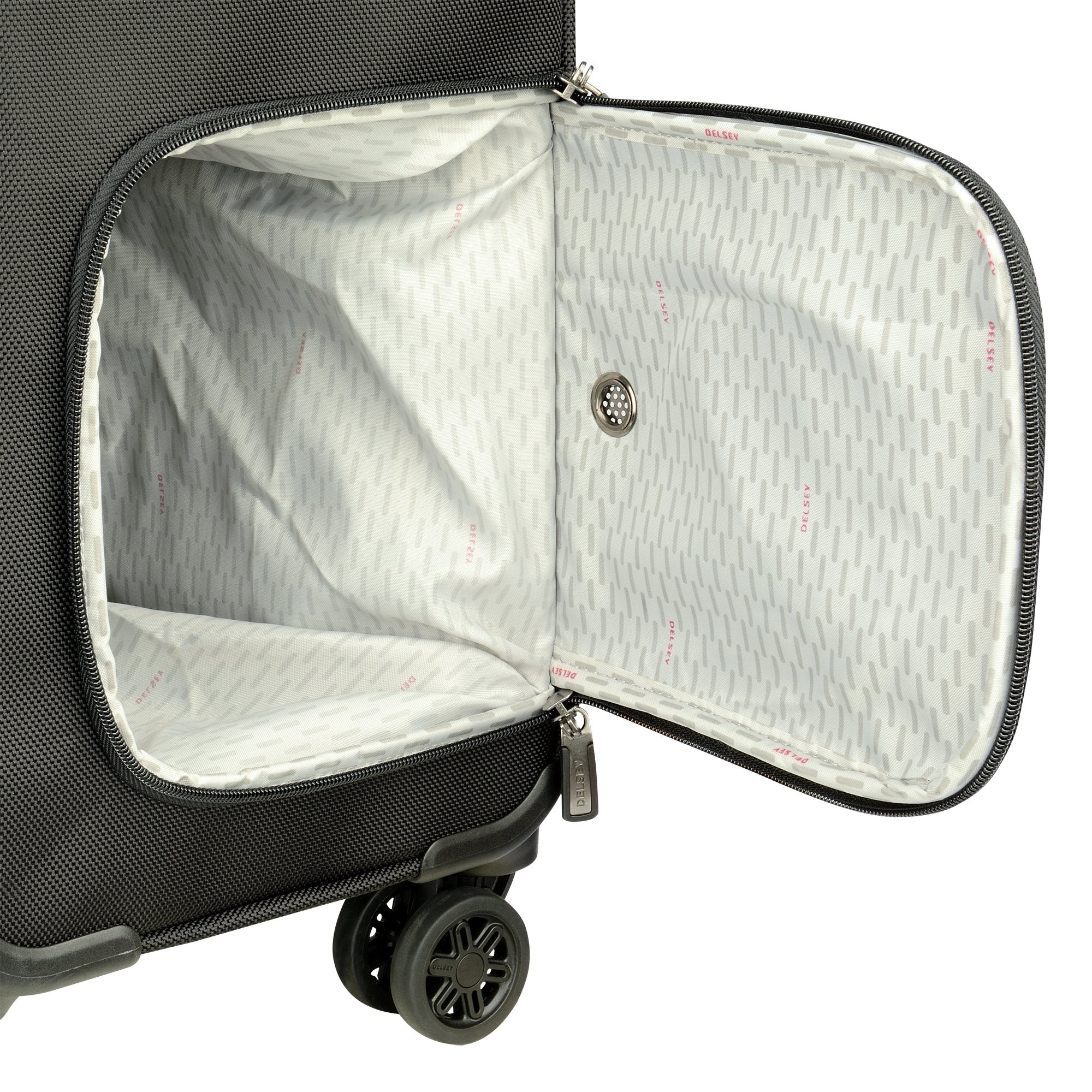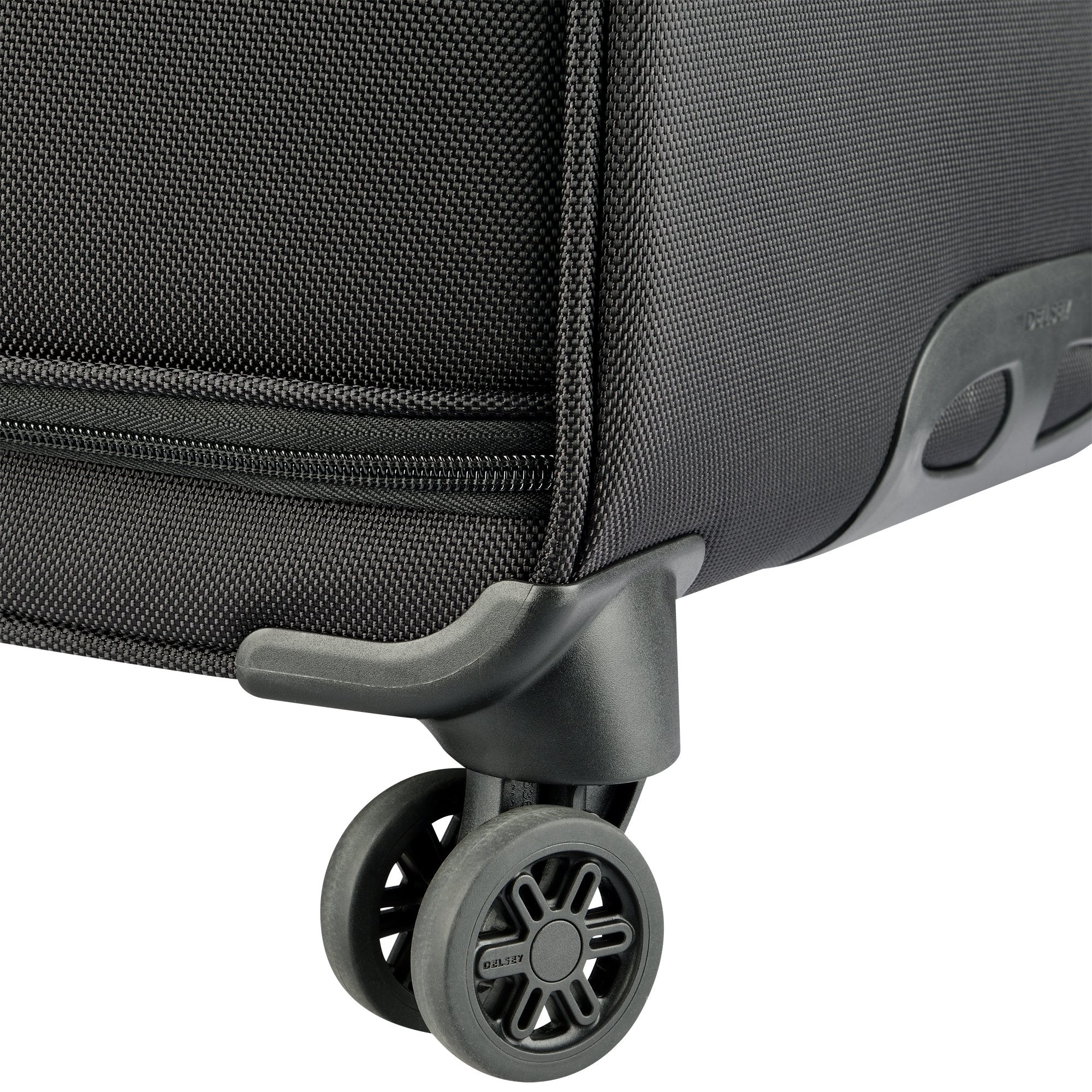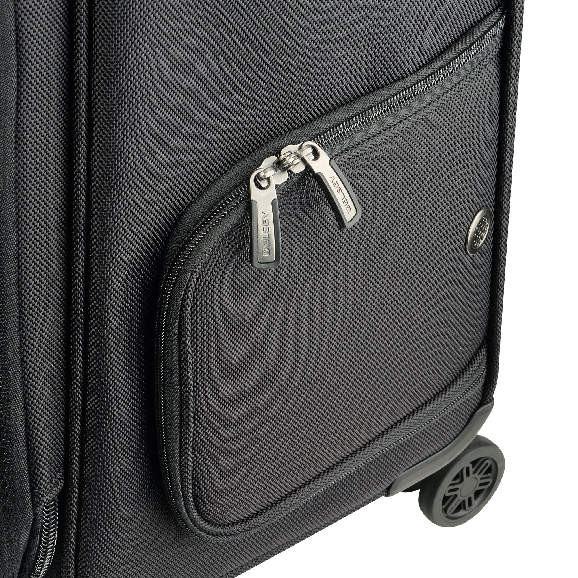 Constructed of durable ballistic nylon to resist wear, moisture, dirt and abrasion. Double protective neoprene sleeves for a tablet and up to a 15.6" laptop. Side easy-access compartment for shoes, toiletries or return home laundry. Injected kick plate and reinforced corners for additional protection. Rubberized, TPR non slip grip on trolley handle. Interlocking sliders on main compartment to secure contents with a lock. Interlocking sliders on fron pocket to secure electronics. Removable 3-1-1 pouch for toiletries. Dedicated neoprene pocket for power bank and cable port to charge electronics on the go. Dual-position trolley system for 2 or 4 wheel use. Double spinner wheels. Recessed neoprene top and side carry handles for comfort when lifting a fully packed case. Easy to grab bottom handle. Large outside pocket for organization. Integrated ID Tag. Interior elastic tie-down straps. Three interior zippered pockets. Zippered divider in lid for maximum organization. Expandable main compartment.