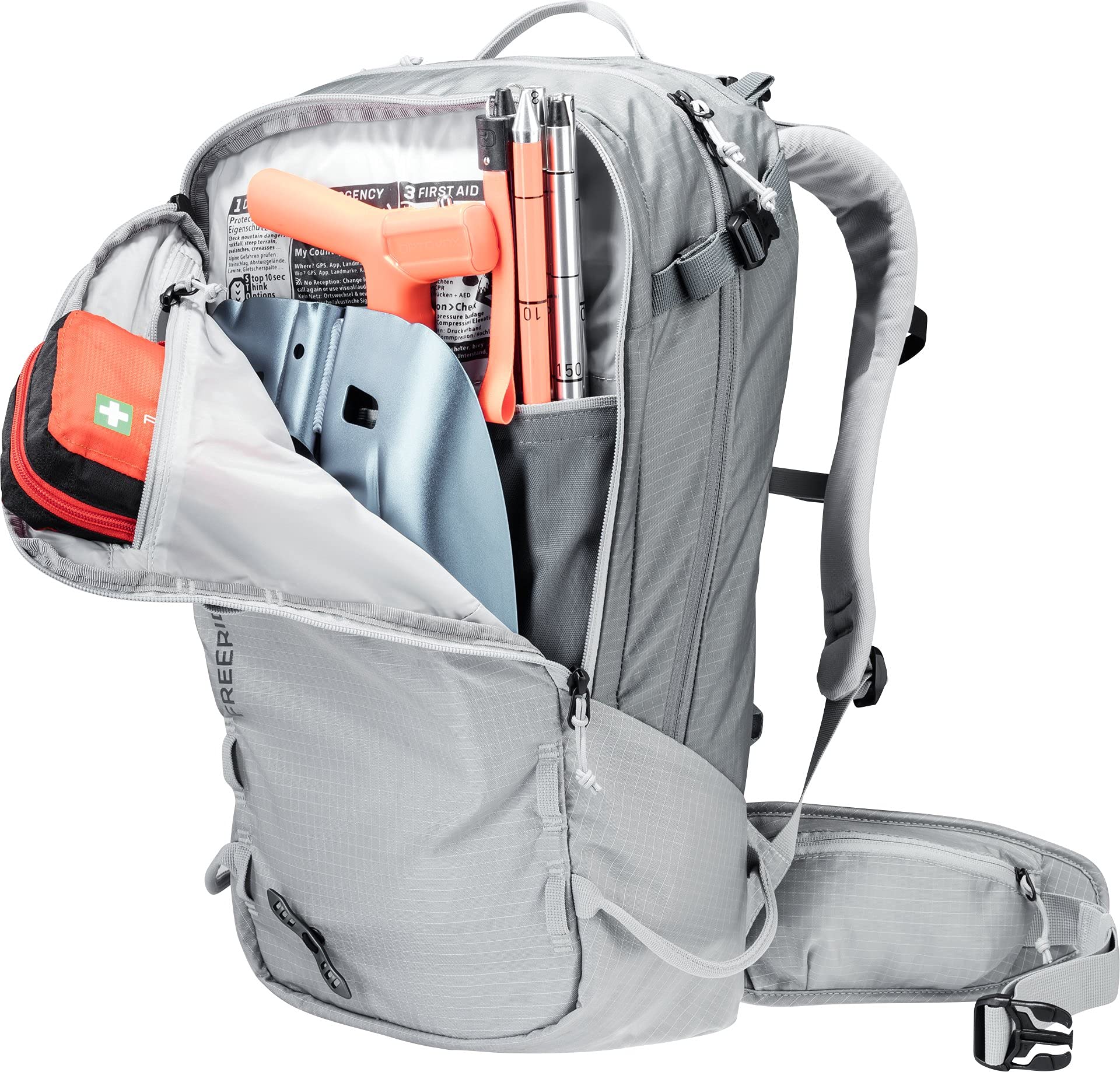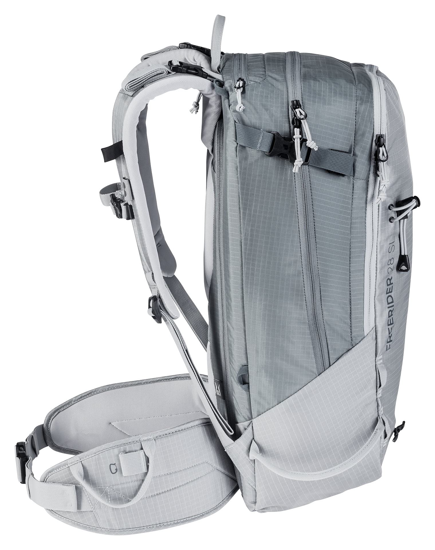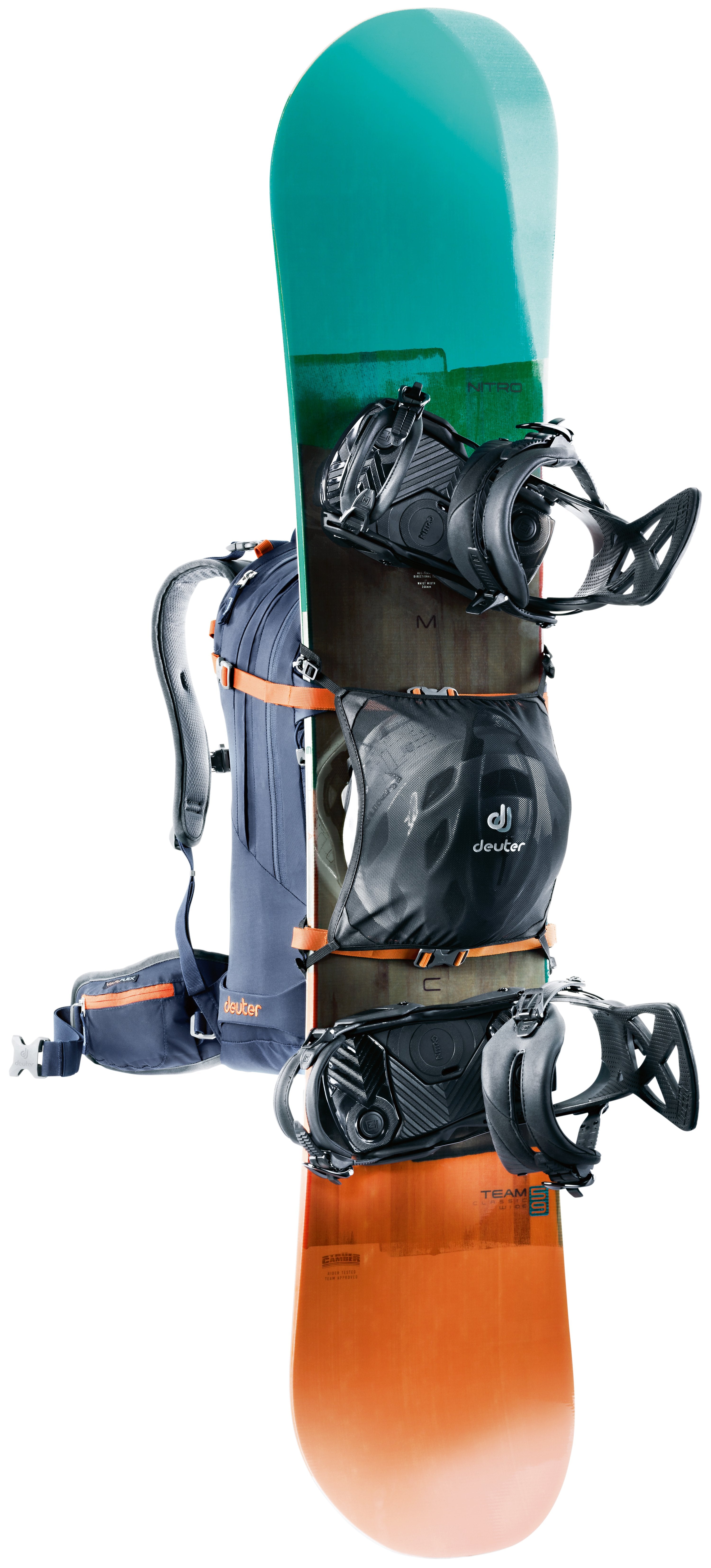 The Freerider pack has clever winter-specific details like access to the main compartment via a fully opening back panel. This gives you good oversight of the contents and it also means the carry system stays dry. But even if a little snow does get onto the carry system, our new hard-wearing, breathable, snow-resistant fabric will keep your back dry. And when it comes to safety, the Freerider has it all worked out. It features a separate, easy-to-access compartment for your probe and shovel so that your avalanche equipment is quick to access in an emergency. Weve also equipped it with our new modular attachment set-up. Two dedicated straps that attach to the gear loops on the pack allow you to affix skis, a snowboard or snowshoes to the pack in no time at all skis diagonally across the back or in an A-frame, a snowboard or snowshoes in an upright position. These versatile gear straps can also be used as compression straps.