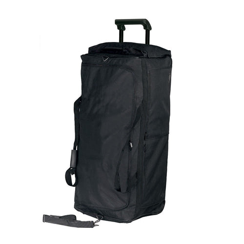 Features a sturdy pull-up handle and dual wheels on the bottom. 2-3 heavy-duty bottom rails help support weight. They also have two zip pockets in front, a zip pocket on one end, a spacious main compartment, top buckled strap, and detachable shoulder strap.