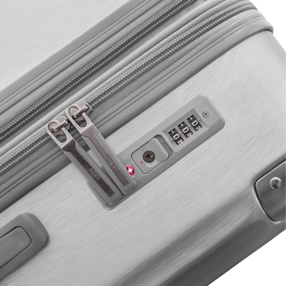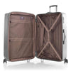 Made of a lightweight polycarbonate composite with a brushed metal textureDurable and stylish metal corner guards Metal corner guards Features a fully-lined interior with zippered divider, buckled compression straps and zipperedpockets Flush mounted built-in TSA combination lock Zipper-released expansionsystem allows for an extra 20% in packing capacity Gel-cushioned top and sidehandles Lightweight colour-matching aluminum push-button telescopic handlesystem with multi-stage locking heights 360 spinner wheels allow foreffortless motion in different terrains