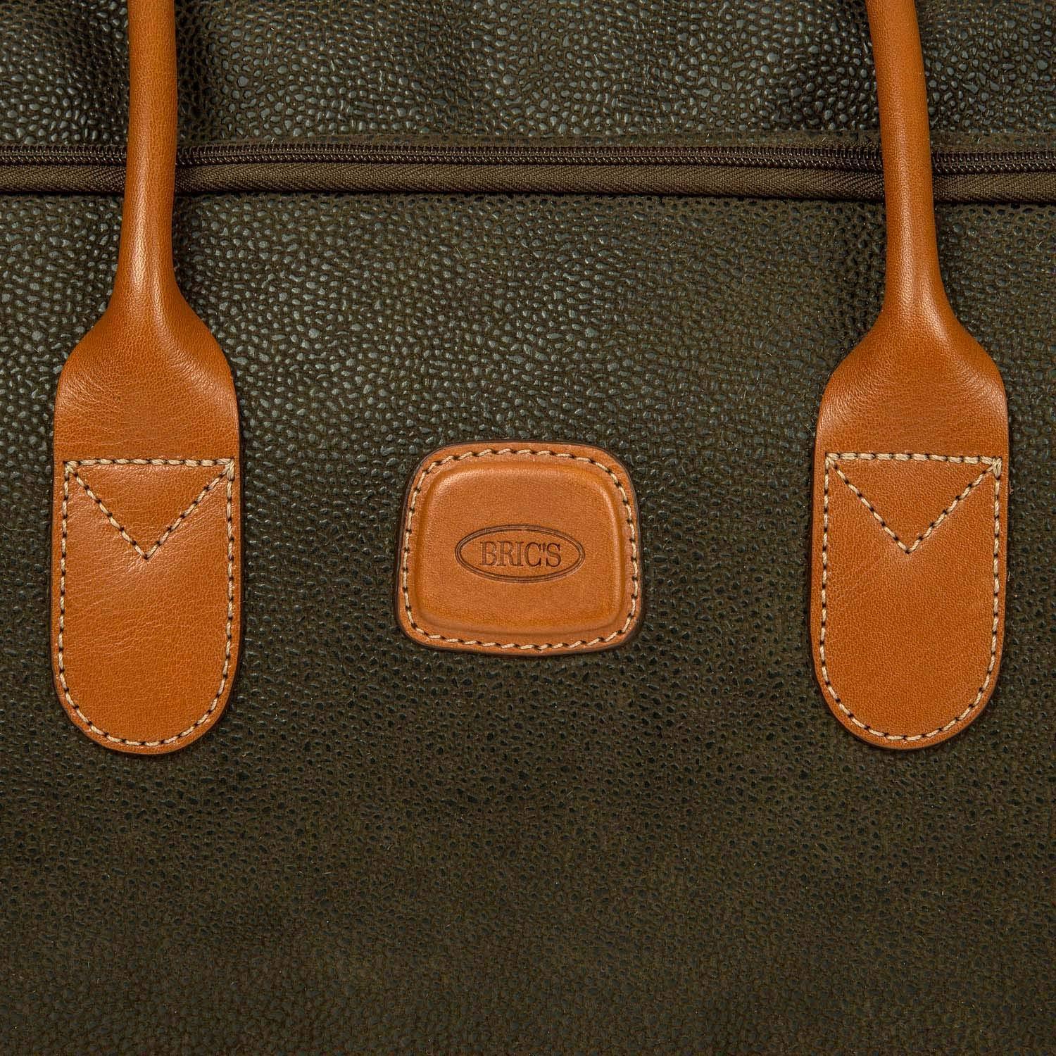 Color:OLIVE The life collection offers a classic, comprehensive assortmentthat looks good and travels even better; handcrafted using a PVC base coatedin cotton and viscose flock, giving it a unique suede-like finish that isdurable and easy to clean, further enhanced by full-grain Tuscan leatherdetails. -- the 21 inch carry on rolling duffle is made with a spacious, openinterior and large exterior pocket to easily organize and access your chosennecessities. packs for 2-4 day trips.