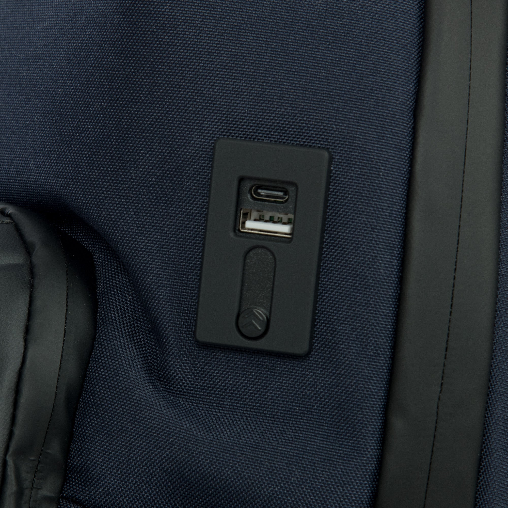 Main compartment with zippered pocket, slip pocket and USB plug, separate notebook compartment up to 15" in back.
