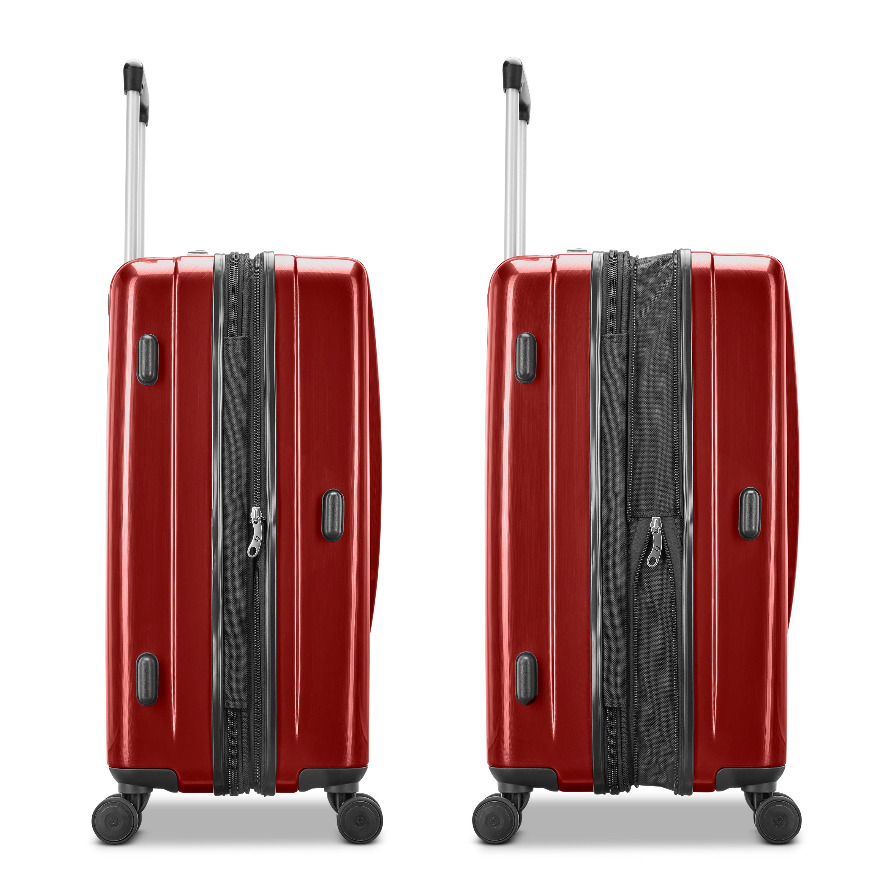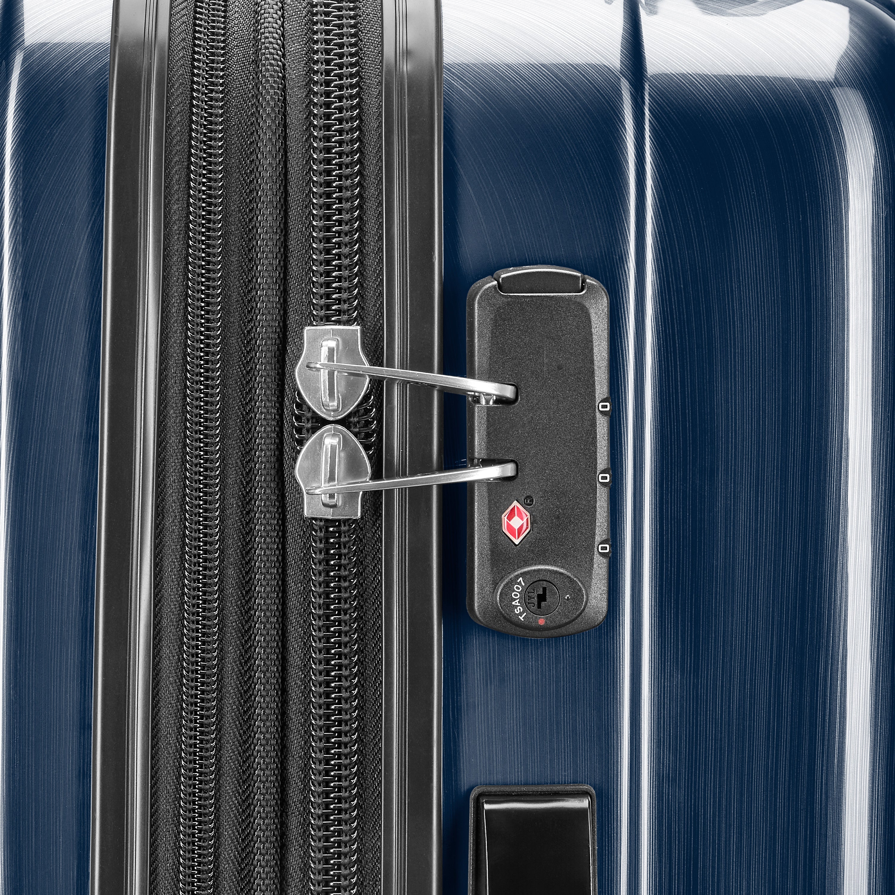 Transport your travel essentials effortlessly and stylishly. This extremely lightweight and durable spinner features 100 percentage polycarbonate construction with sharp molded details. Made to absorb impact by flexing while under stress then popping back to its original shape, eliminating dents and dings while protecting its contents. An elegant brushed pattern hides any potential scratches or scuffs from your journeys. The fully-lined interior has cross-straps, a privacy curtain with its own zippered organizational pockets. Tsa approved combination lock for security and peace of mind.