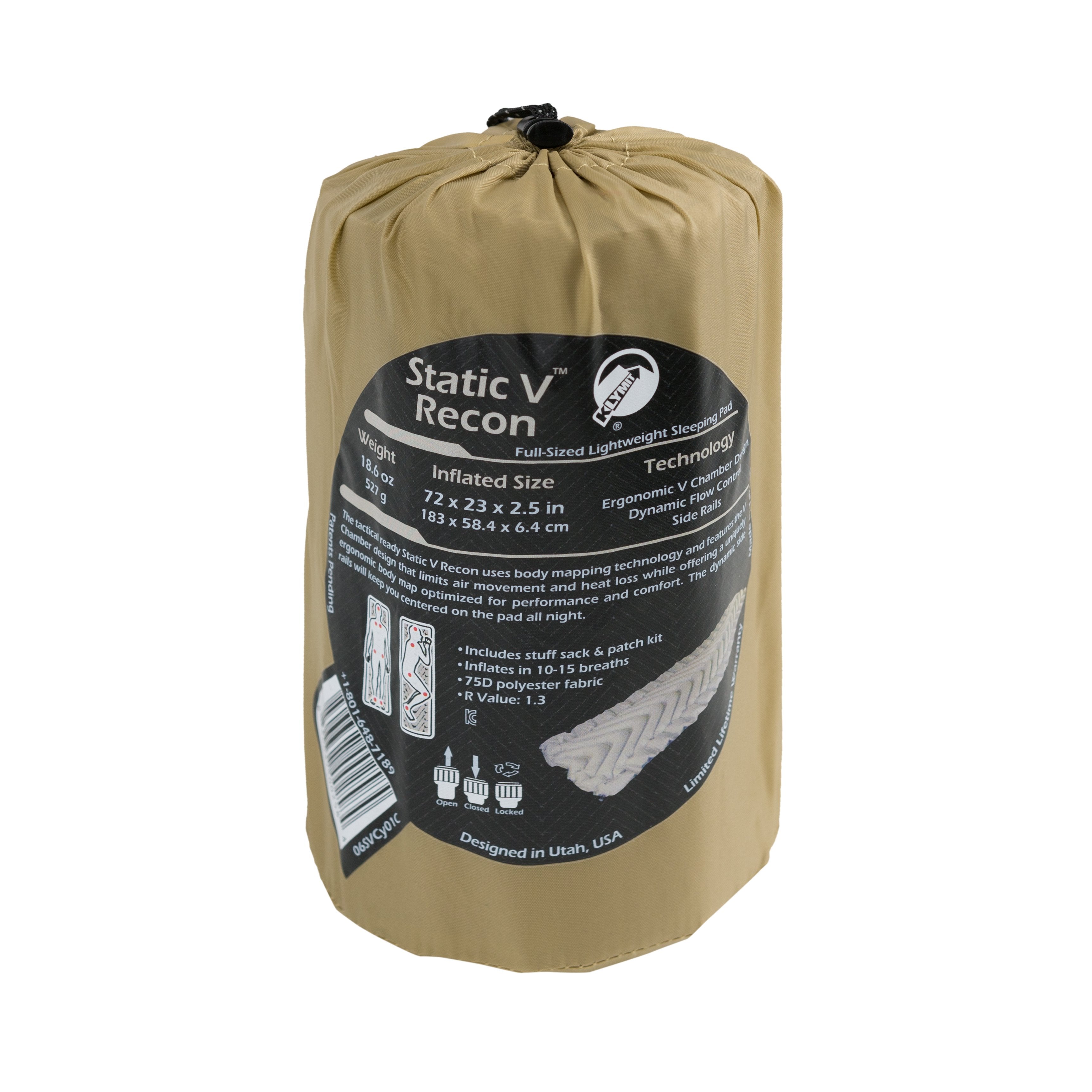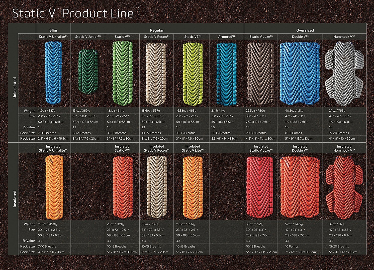 Rugged and comfortable, lightweight and versatile, the Static V is an ideal pad for avid backpackers and casual campers looking for performance at an entry-level price. The body-mapped V chamber design limits air movement to help maintain insulating performance and ergonomic comfort, dynamic side rails cradle you on the pad, and the rugged material is great if you want to sleep on the ground under the stars. The Static V quickly inflates in just 10-15 breaths, packs up small, and weighs only 18 ounces.