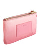- 2 zip pockets, Front zip pocket with locking zipper pull, Center slip pocket with magnetic snap, Leather card pocket on back, Leather wrist strap with clip hardware