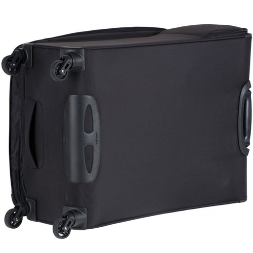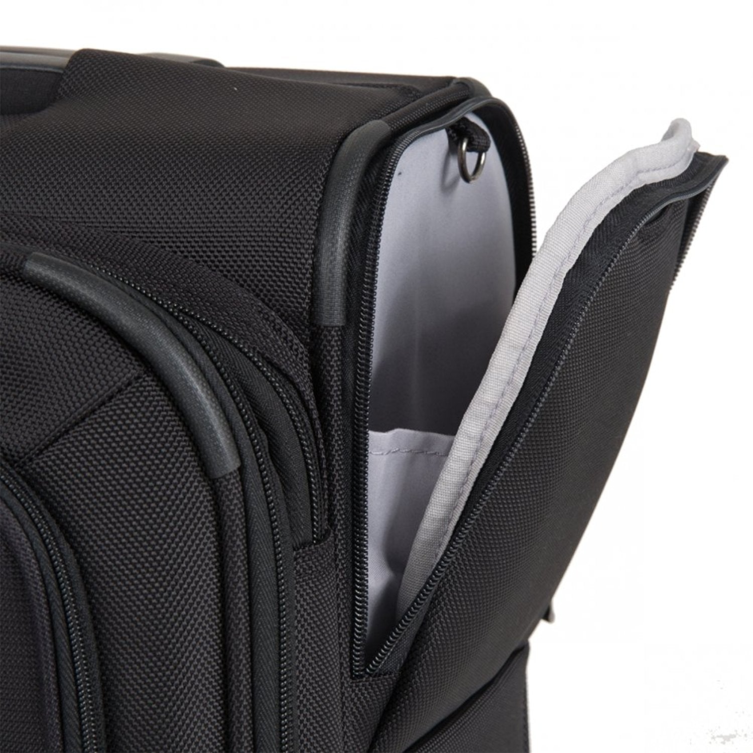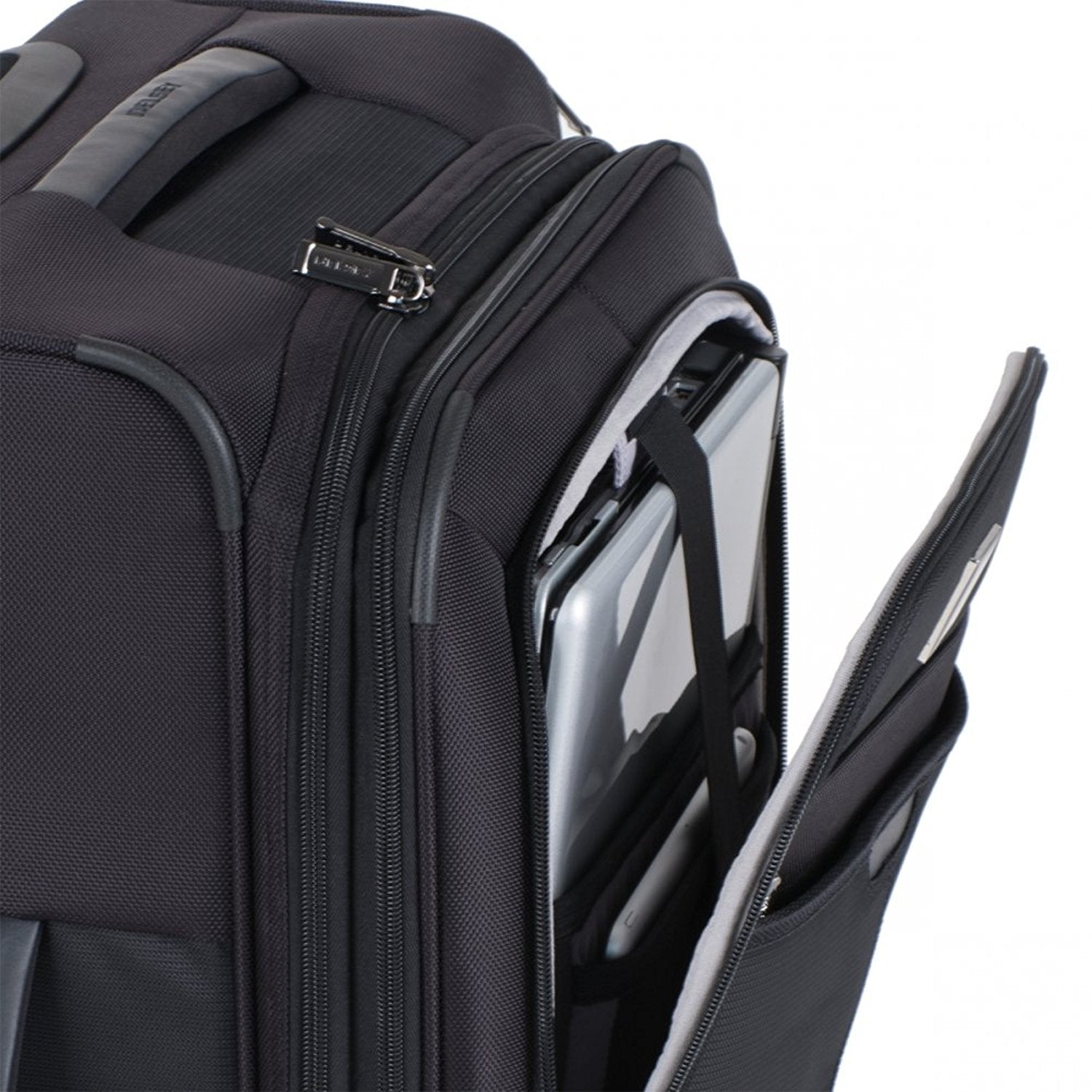 Both carry-on upright and rolling tote feature a protective sleeve for a 15.6 laptop and a second one for a tabletUprights expand for extra packing capacityDeluxe interior with multiple zippered pockets and metallic finish fabricAdjustable mesh panels with zippered pockets keep contents from shifting and minimize wrinklingRemovable tri-fold suiter on the medium and large uprights helps formal attire to remain wrinkle-freePolypropylene kickplate offer additional protection at key stress pointsEasy to Grab bottom handle is great for overhead compartment or car trunk liftingIntegrated privacy ID tag on the inside and outside -Materials: 1680 Ballistic nylon