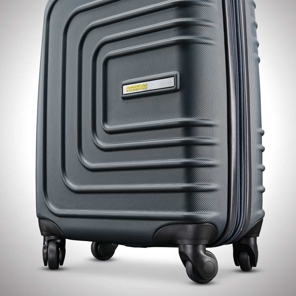 ABS scratch resistant texture with fashionable squared lines to accentuate the brand plate.. Single spinner wheels for a smooth ride.. Book opening case with mesh divider and cross straps in main compartment with a zipped modesty pocket.. Fixed TSA 3 dial lock keeps belongings safe (on the 24 & 28 ONLY)..