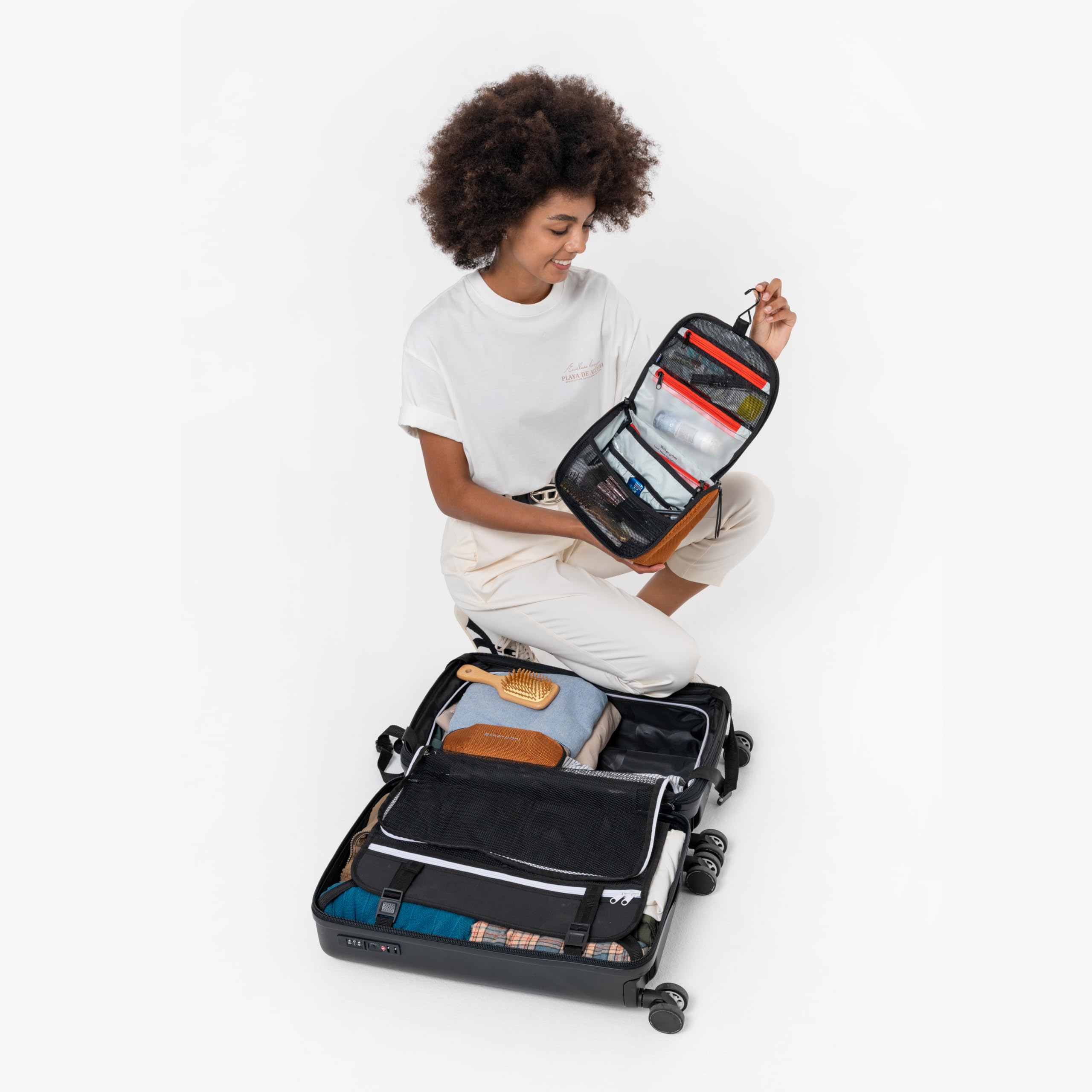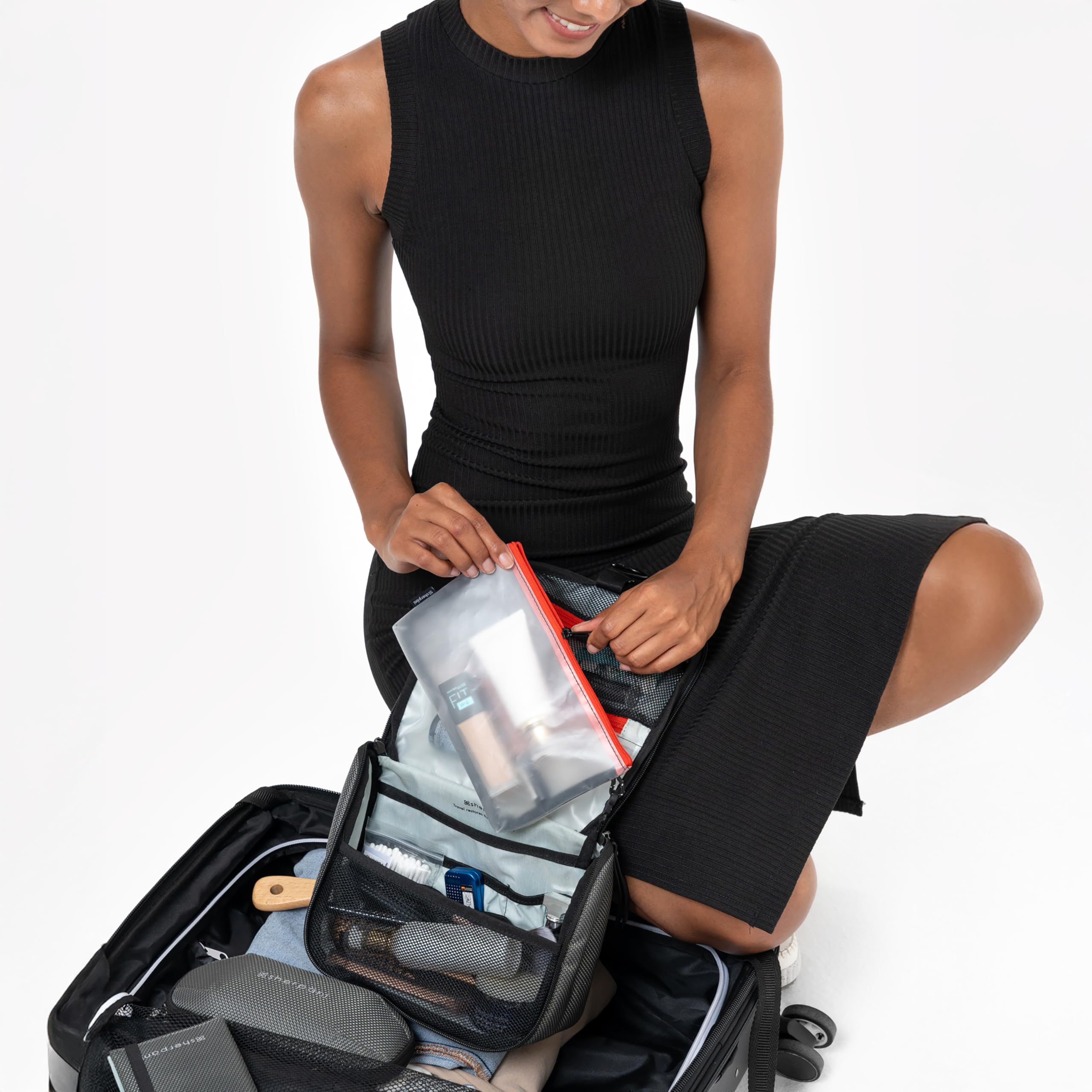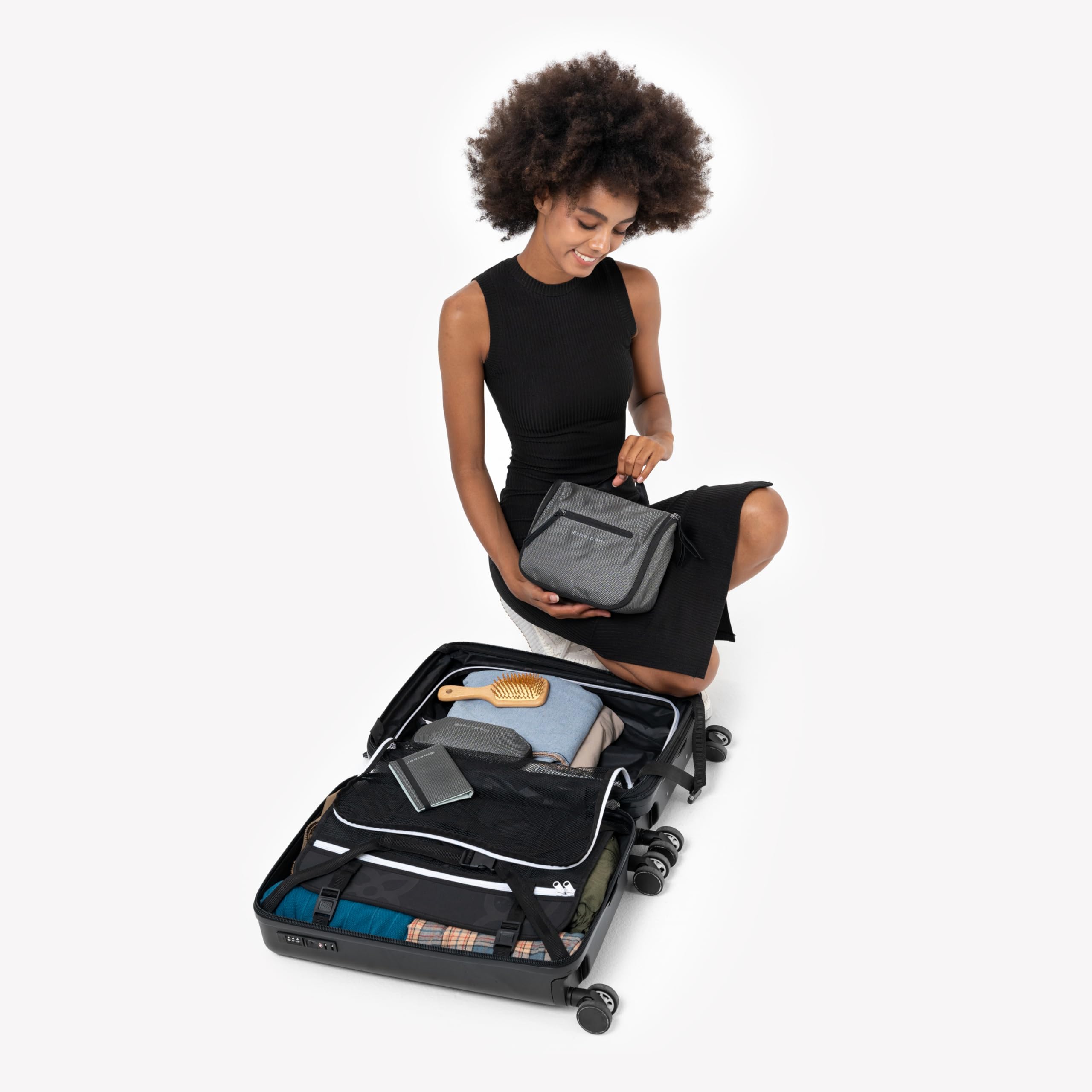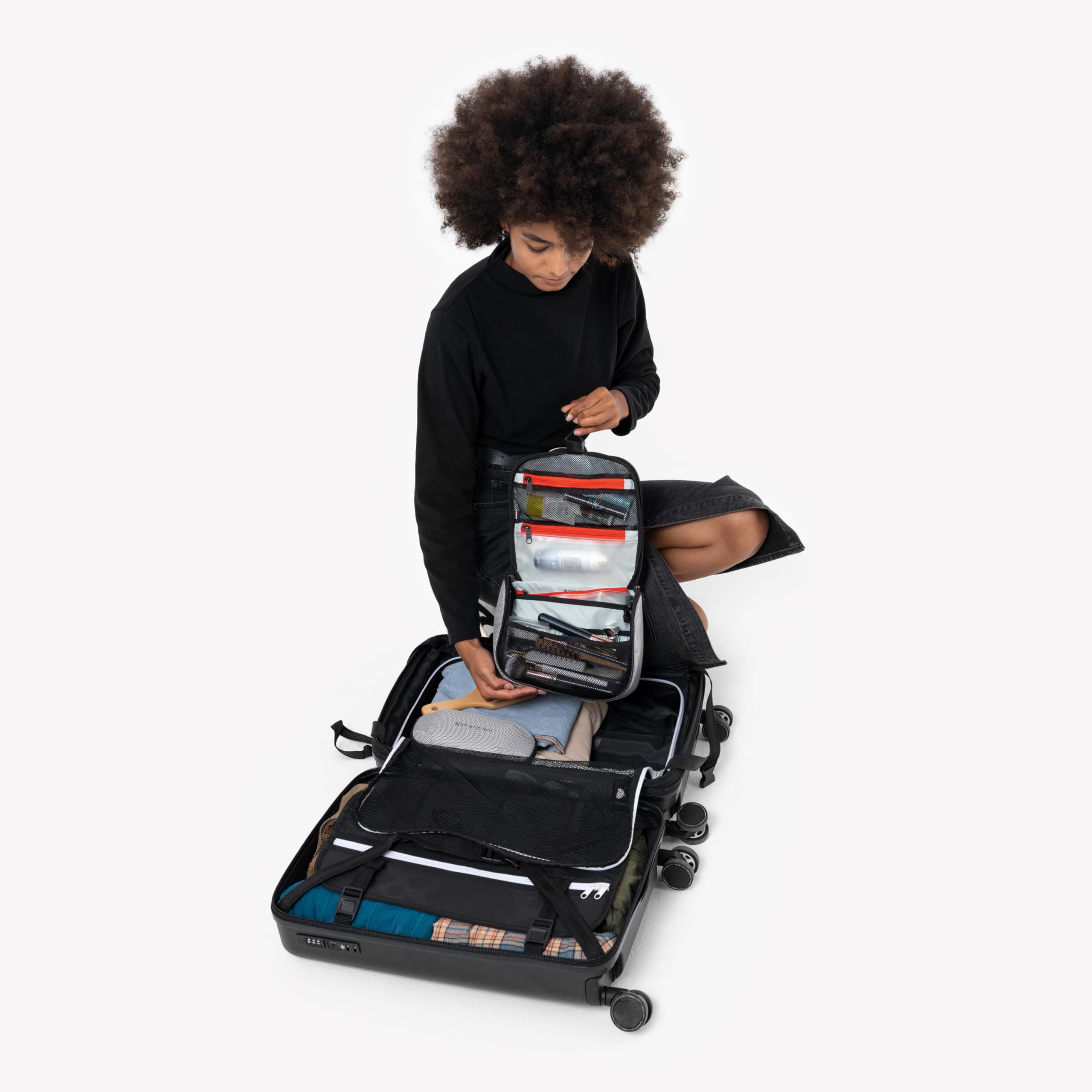 Say goodbye to unpacking at every hotel stop. The Co-Pilot is a 3L hanging toiletry case designed with organized travel in mind. Featuring mesh and clear zip pockets, four slip compartments, a removable wet pouch, and a hook to keep your essentials clean and close by, this pouch is punching way above its weight. Water-resistant materials will keep your stuff clean and dry no matter how wet the bathroom counter gets.
