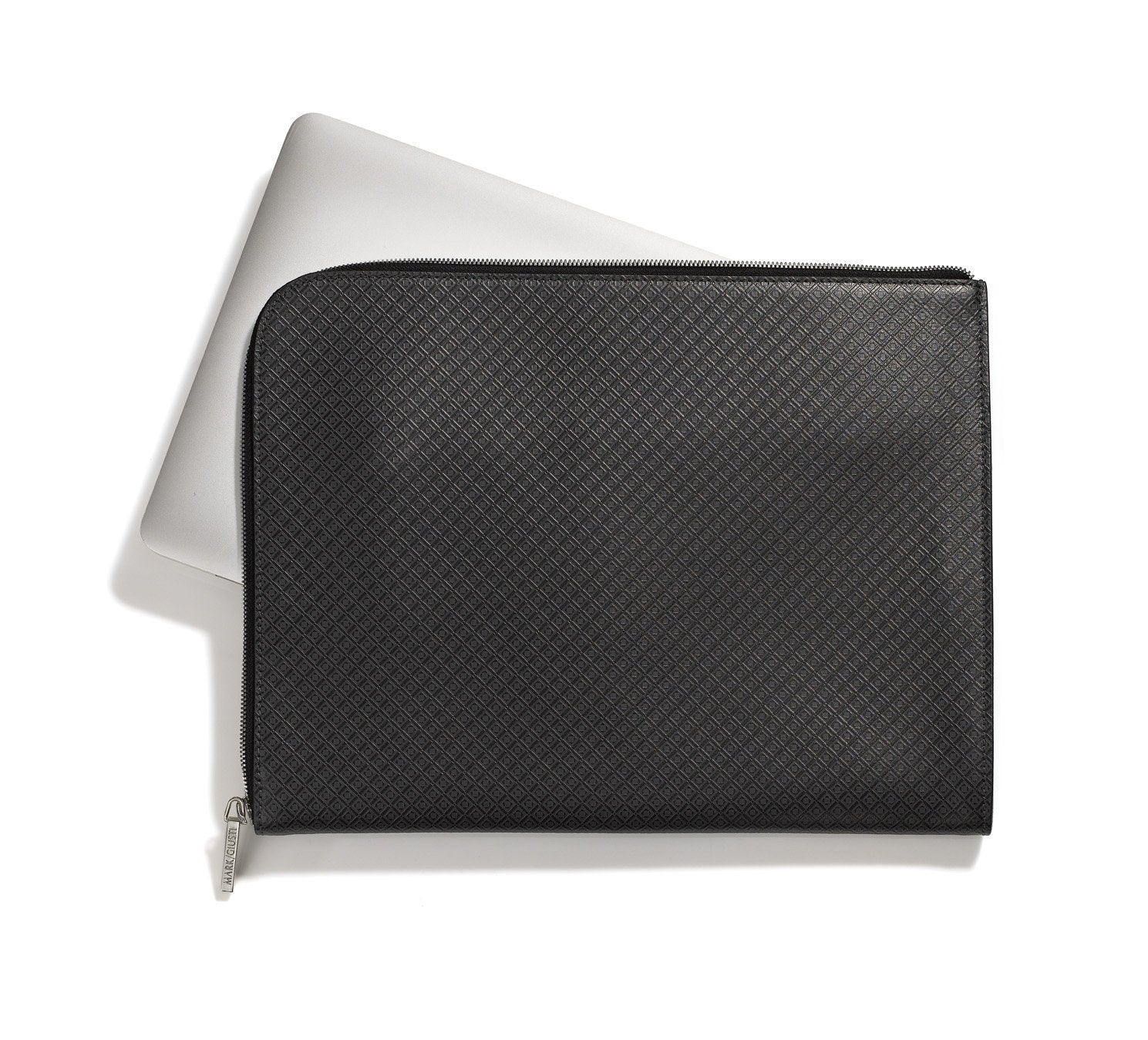 Slim yet protective. This laptop cover zips around your electronic and hugs with protection. The leather embossed detail is like no other tech case you will find. Who says your electronics can't be well dressed!