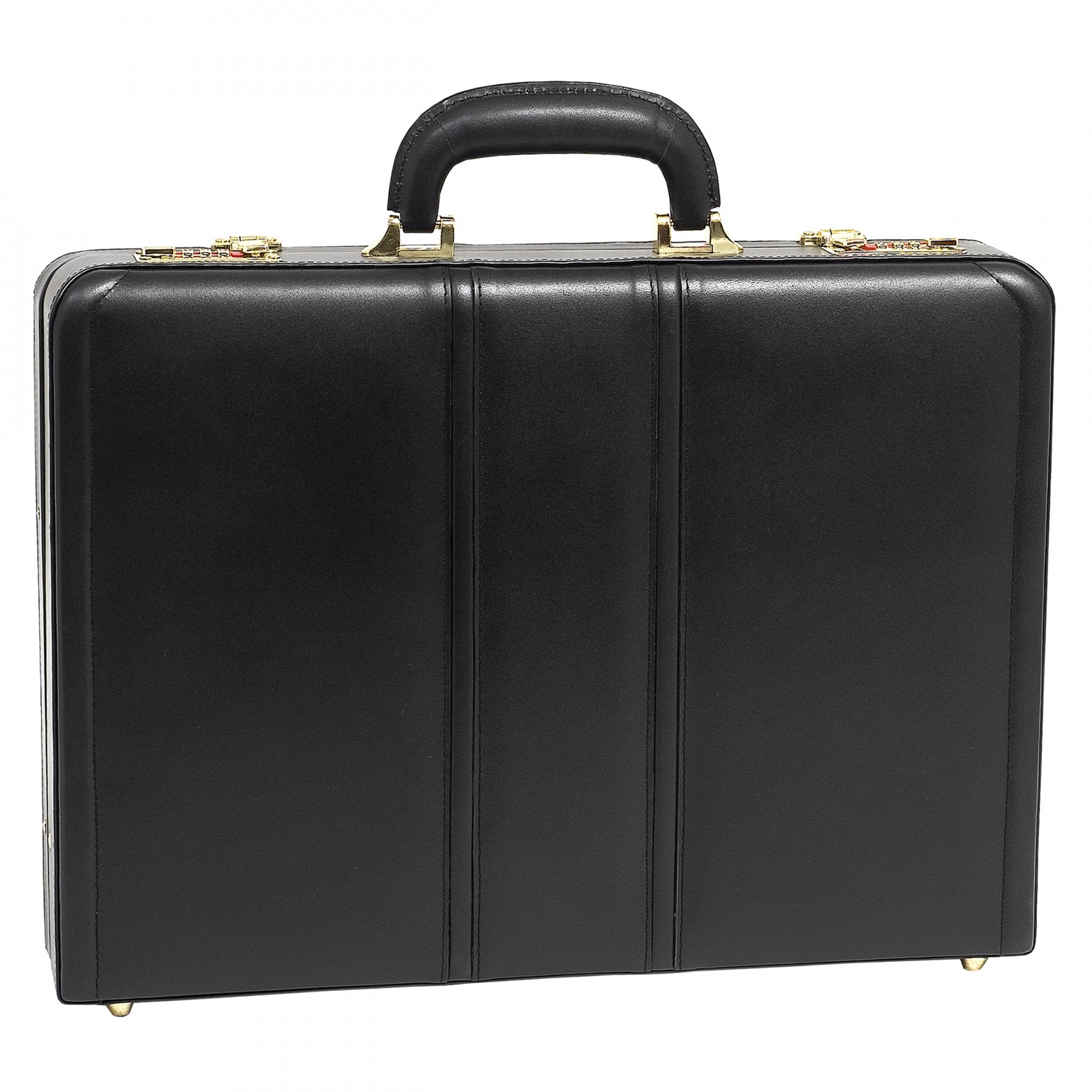 3-digit combination lock for added security. Gold-finished hardware. Comfortable top carry handle. Protective feet keeps case from falling over. Includes Tablet Pocket. Expandable.