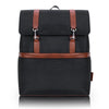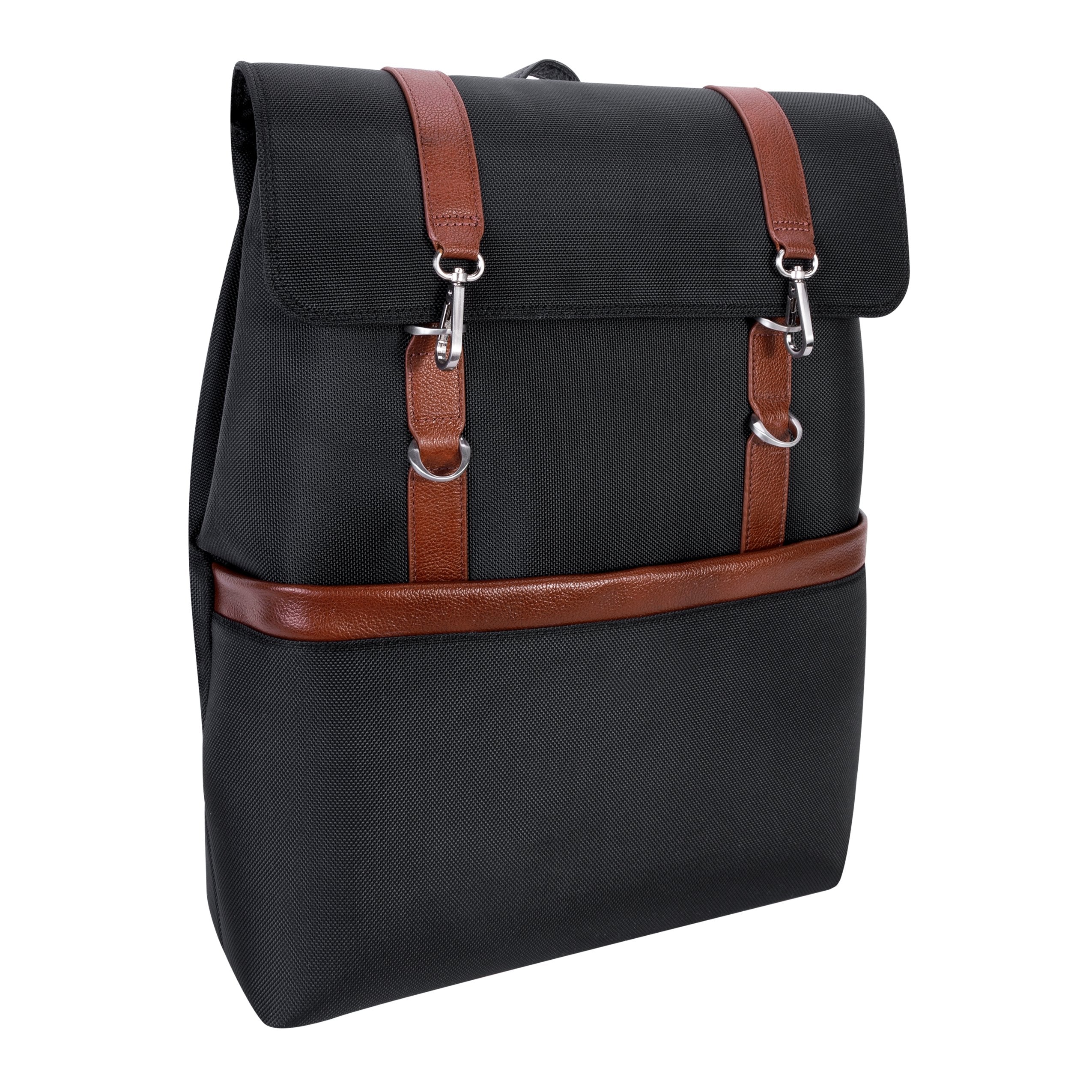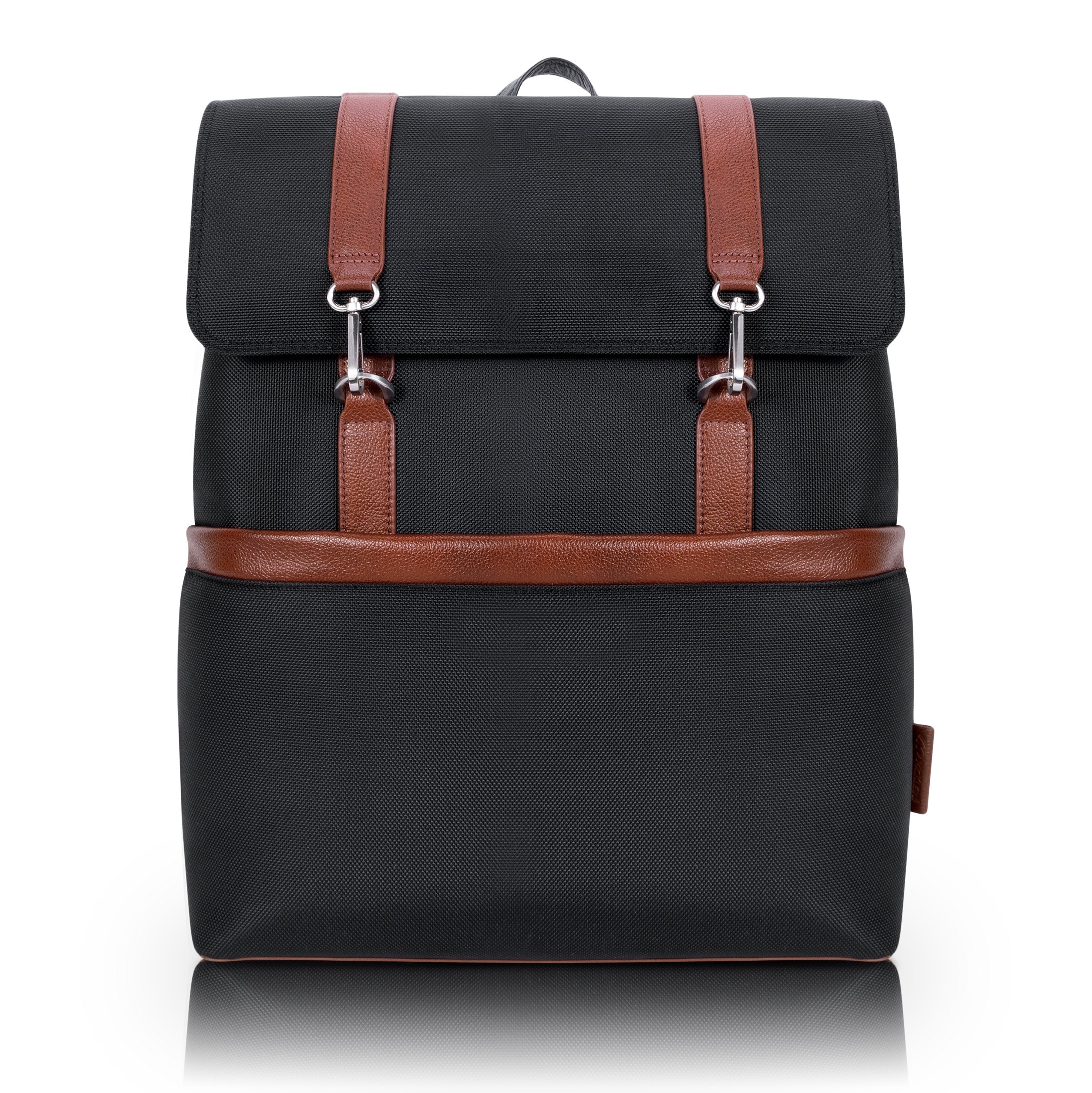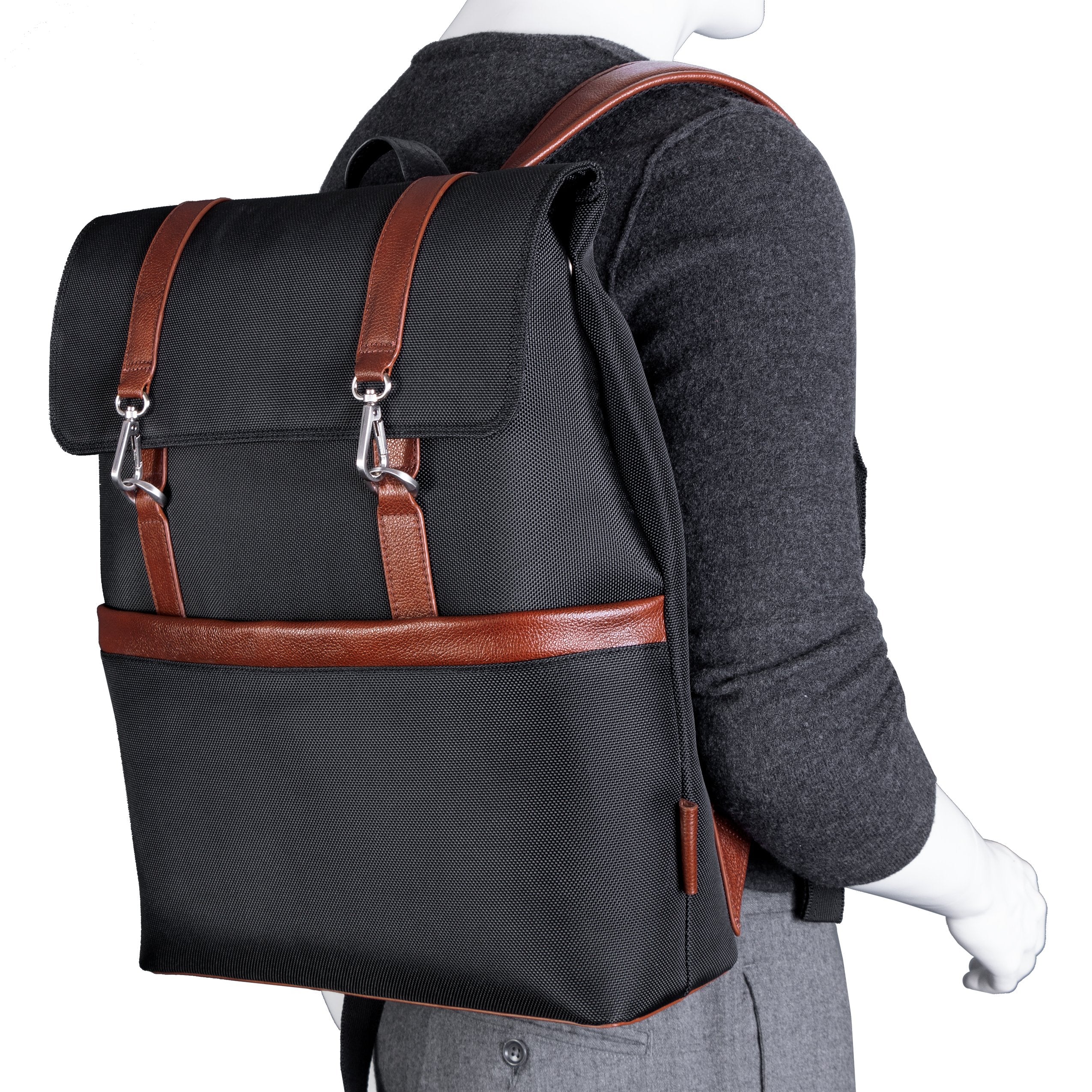 Our roomy 17 nylon flap over backpack with elegant contrasting leather accents is perfect for carrying your Laptop and Tablet. Carry Comfortably with padded adjustable straps plus convenient leather handle. Access your most needed items easily from the front exterior full-length zipper pocket with business accessory organizer. If youve got a lot to carry, expand its compartment with the top two side buttons to provide more space for extra storage. The bag is fully lined with leather accents and silver hardware to make storage easy and pleasant. Keep important documents secure in the full-length interior zipper pocket. 17 padded built in laptop sleeve and padded tablet pocket stores and keeps your important devices safe. Rear exterior features ultra-padded with air flow system (AFS) and padded air mesh backpack straps. And set it down on 4 protective feet.