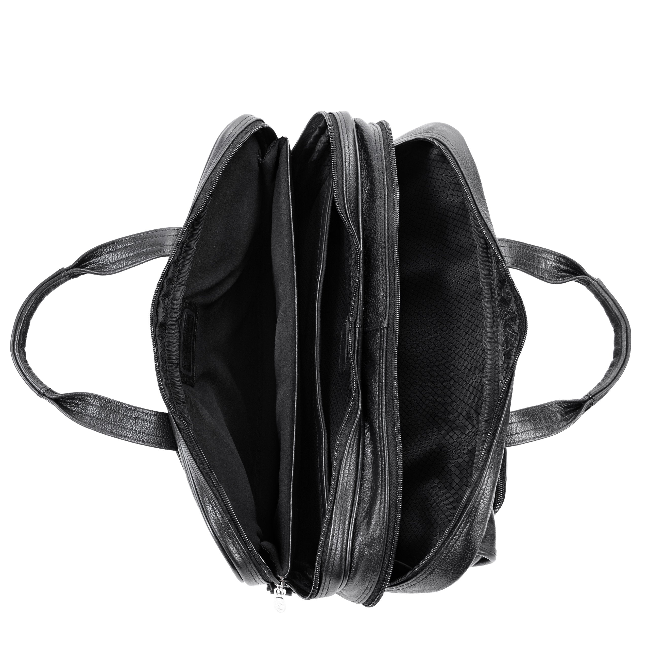 Front zipper pocket holds small accessories. Front zipper organizer section for pens, business cards and small devices. Two main zipper compartments. Front zipper compartment features file divider for documents. Back zipper compartment features an interior organizer for pens, business cards and small devices.