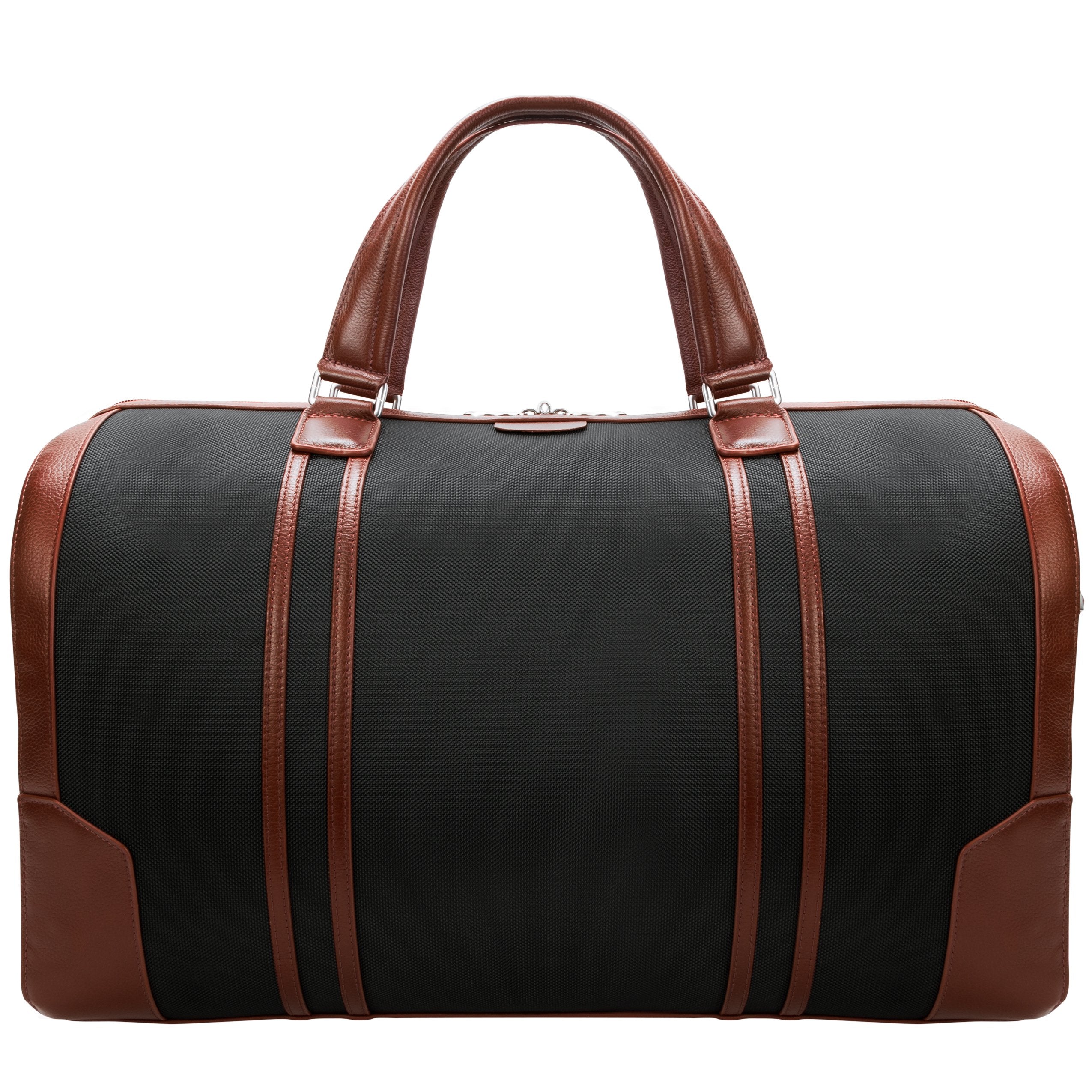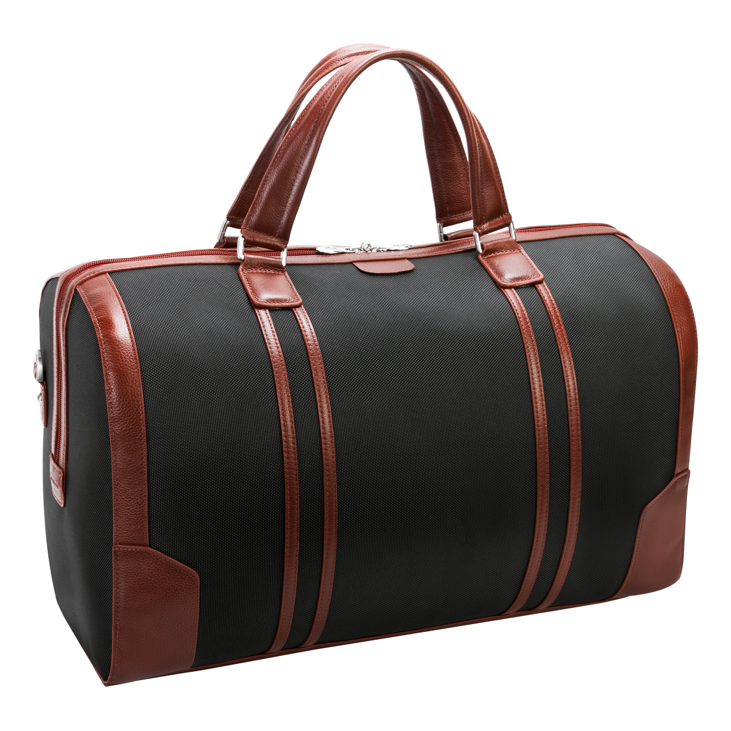 Spacious 20 Carry-All Nylon Duffle with elegant contrasting leather accents. Open Easy with exterior pull tabs or the dual leather carrying handles. Its fully lined interior is accented in leather trim & silver hardware makes storage a dream with lockable zipper. Store everything you need for a weekend getaway in one convenient bag. Full-length zipper makes reaching the interior clothing, protected tablet pocket and travel/business accessory organizer easy. Exterior back zipper pocket for easy access to your most needed items (Cellphones, keys, etc.) Transport in comfort with our non-slip contour padded removable shoulder strap. And set it down with confidence on 5 protective metal feet.