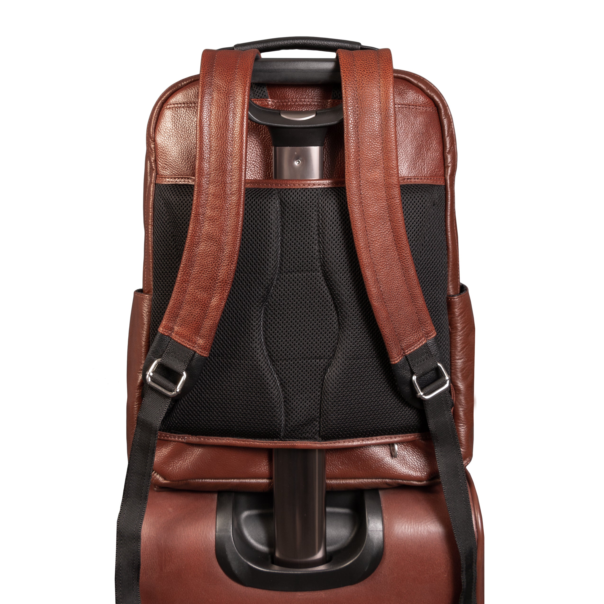 This 17 Leather Backpack with elegant contrasting leather accents is perfect for storing your laptop and tablet safely. Your personal cellphone and keys can be stored in the front zipper pocket for easy access. Store additional items in the front flip pocket with accessory organizer. Beat the heat and the downpour by storing your water and umbrella in the side pockets. Fully lined interior with a padded laptop compartment and tablet pocket. Internal side mesh pocket with exterior access cord slot for carrying cell phone charger. Secured main compartment with anti-theft lockable metal zipper. Keep your back dry with the padded air mesh back exterior. Turn the back pocket into a piggy back strap to attach to your rolling case. The leather straps are mesh padded for additional comfort and adjustability.