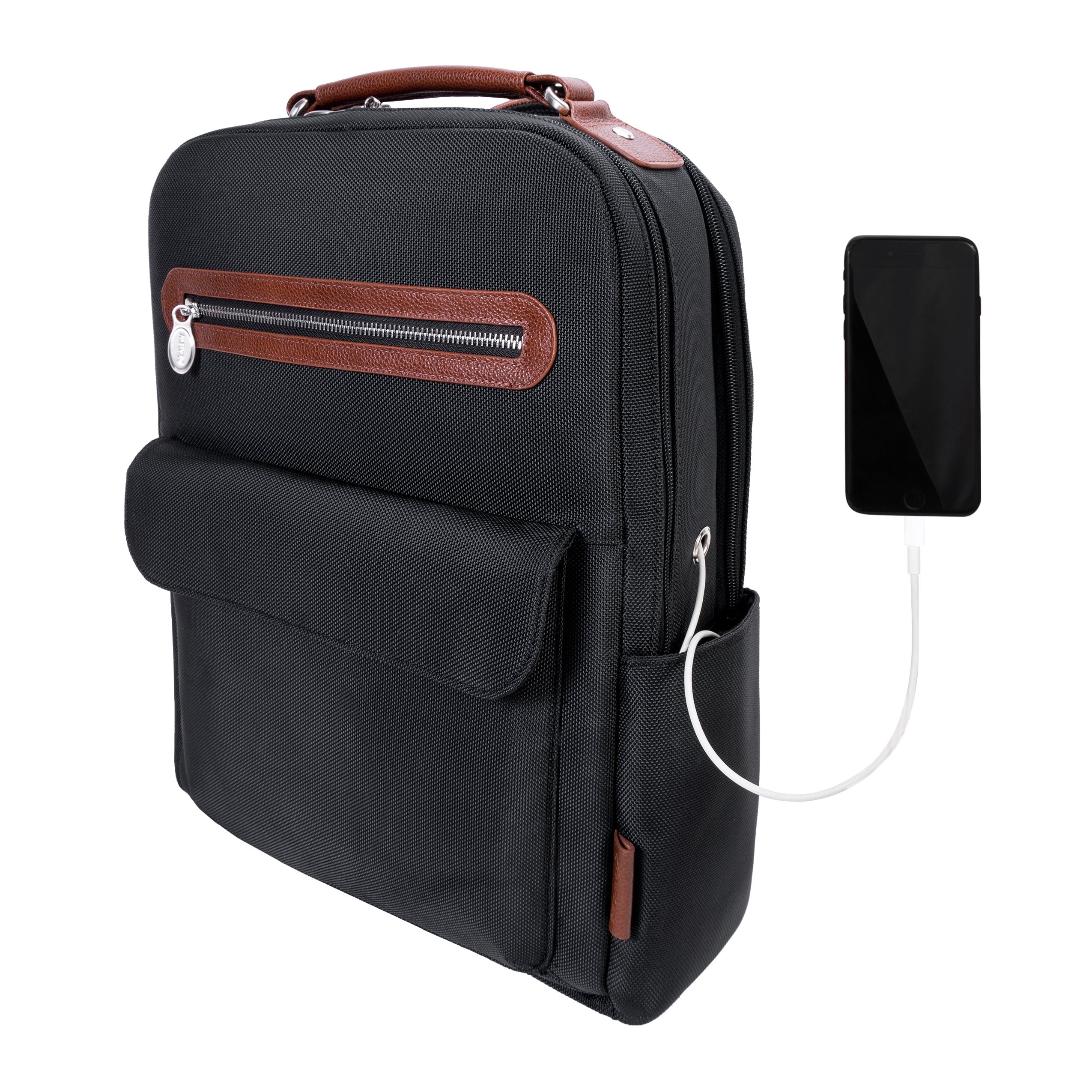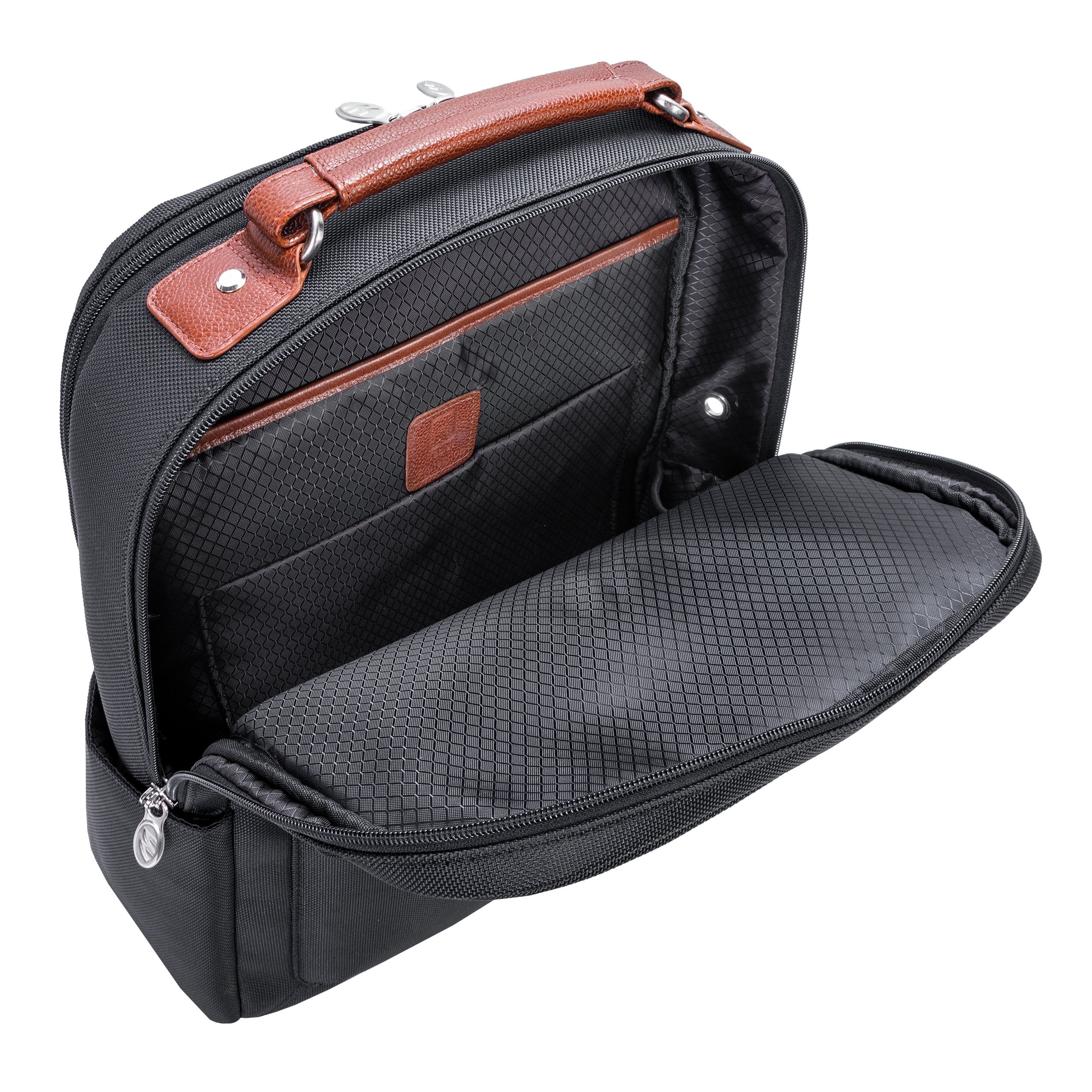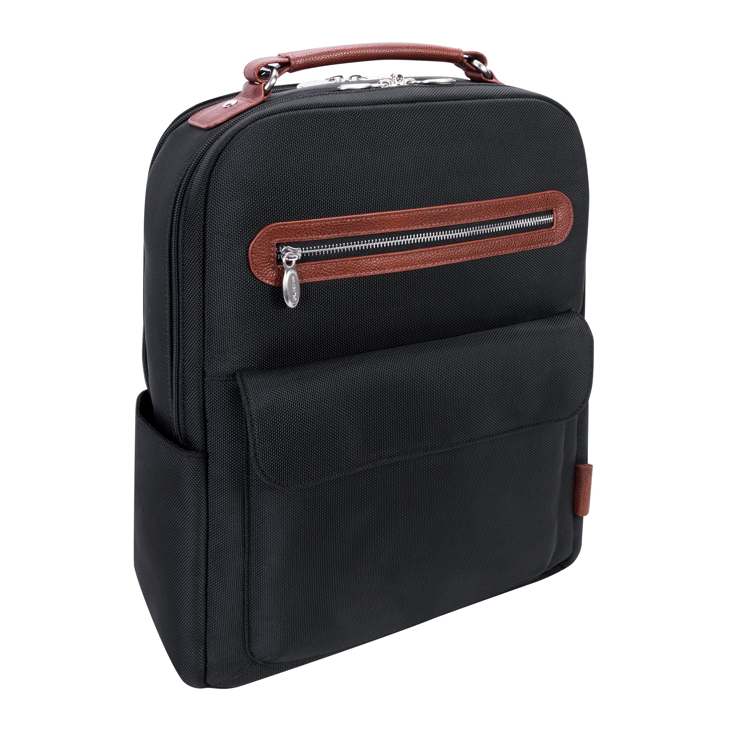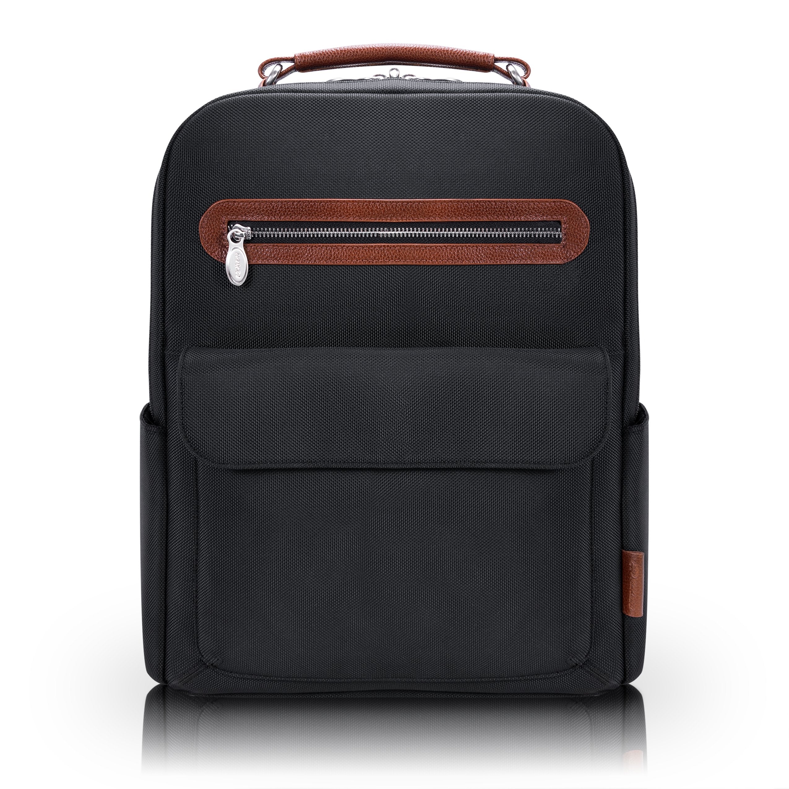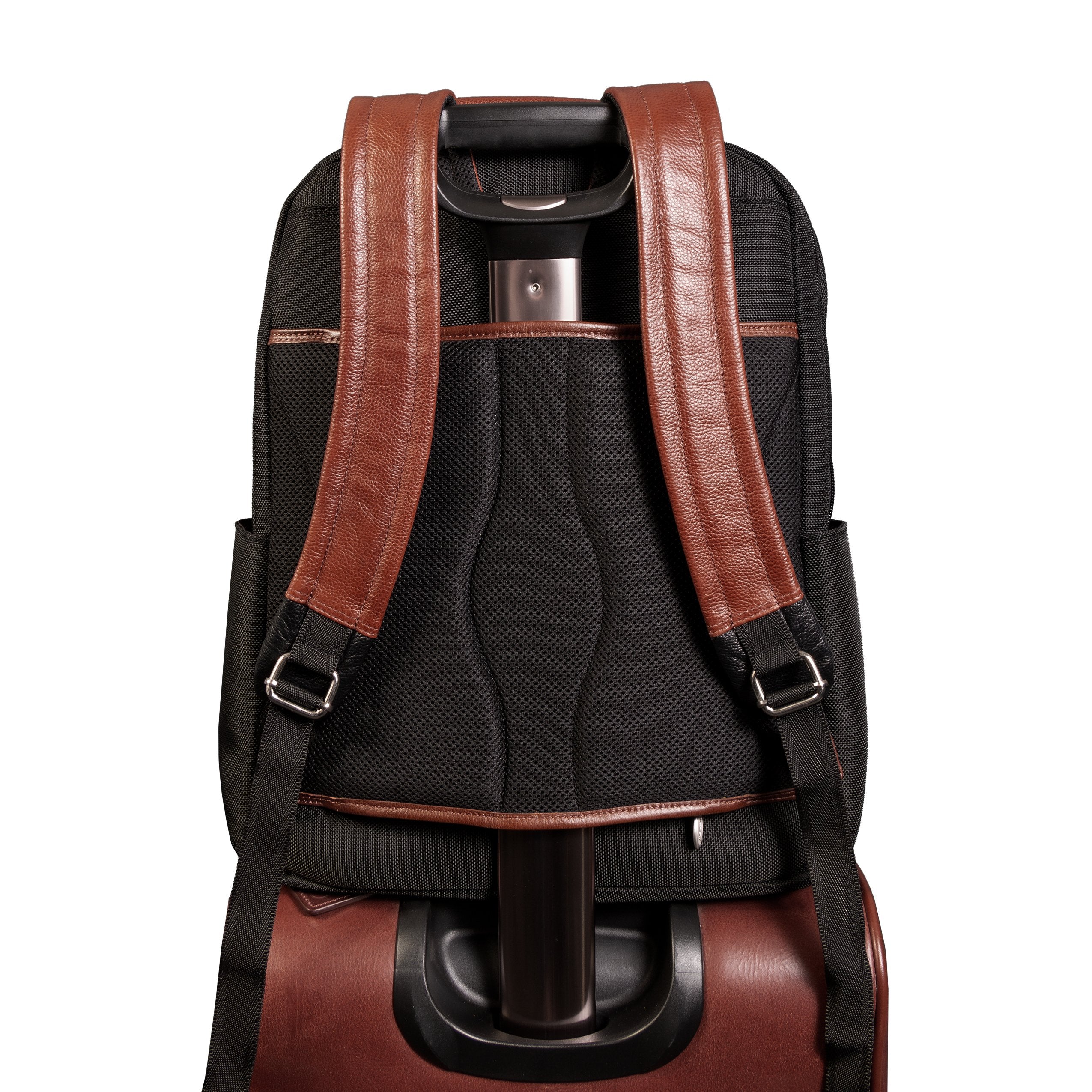 This 17 Nylon Backpack with elegant contrasting leather accents backpack is perfect for storing your laptop and tablet safely. Your personal cellphone and keys can be stored in the front zipper pocket for easy access. Store additional items in the front flip pocket with accessory organizer. Beat the heat and the downpour by storing your water and umbrella in the side pockets. Fully lined interior with a padded laptop compartment and tablet pocket. Internal side mesh pocket with exterior access cord slot for carrying cell phone charger. Secured main compartment with antitheft lockable metal zipper. Keep your back dry with the padded air mesh back exterior. Turn the back pocket into a piggy back strap to attach to your rolling case. The leather straps are mesh padded for additional comfort and adjustability.