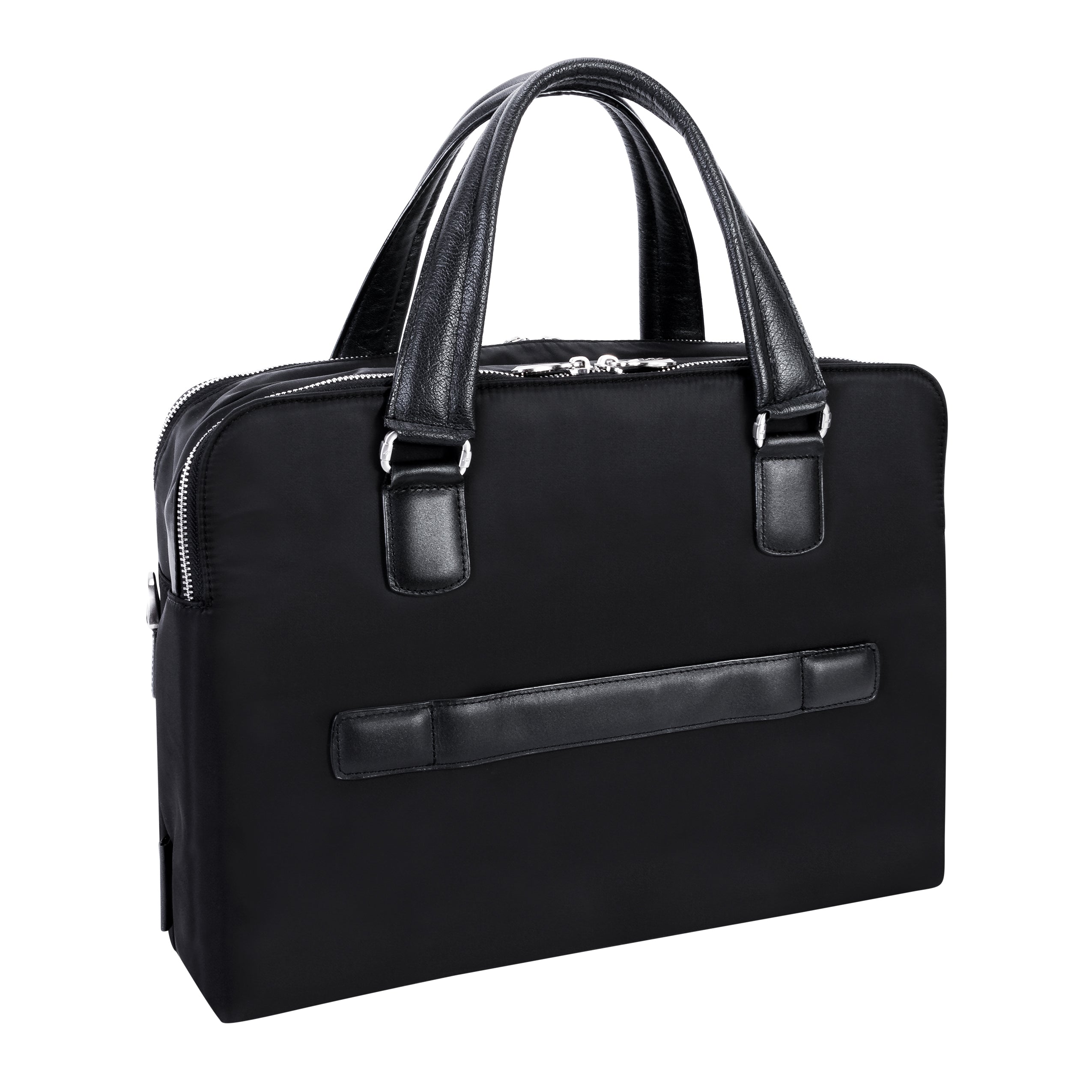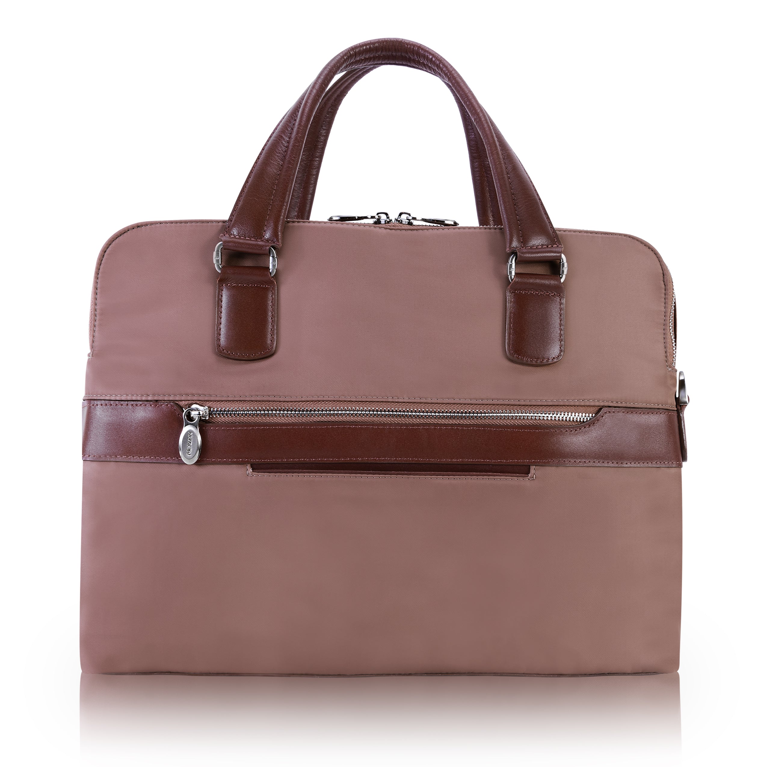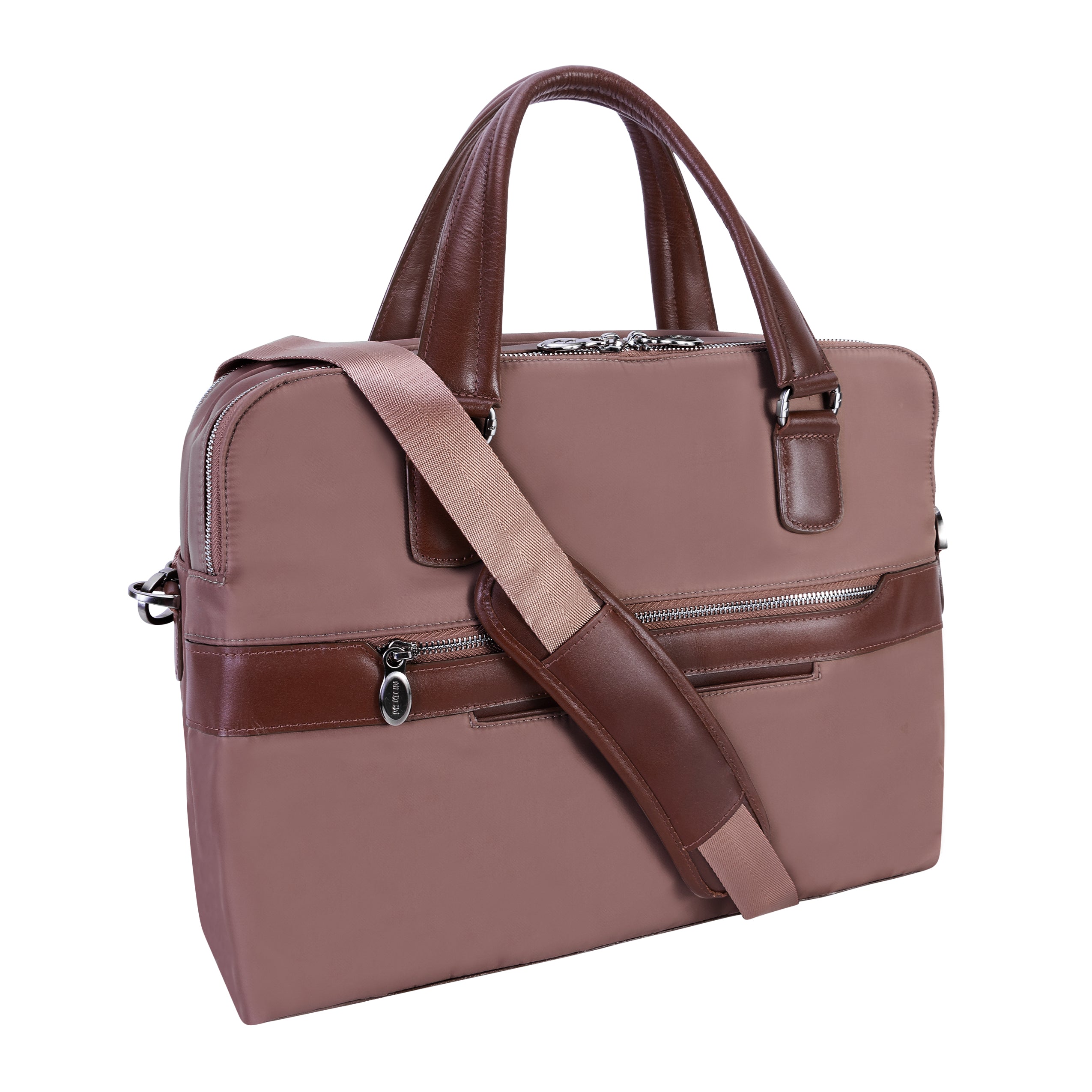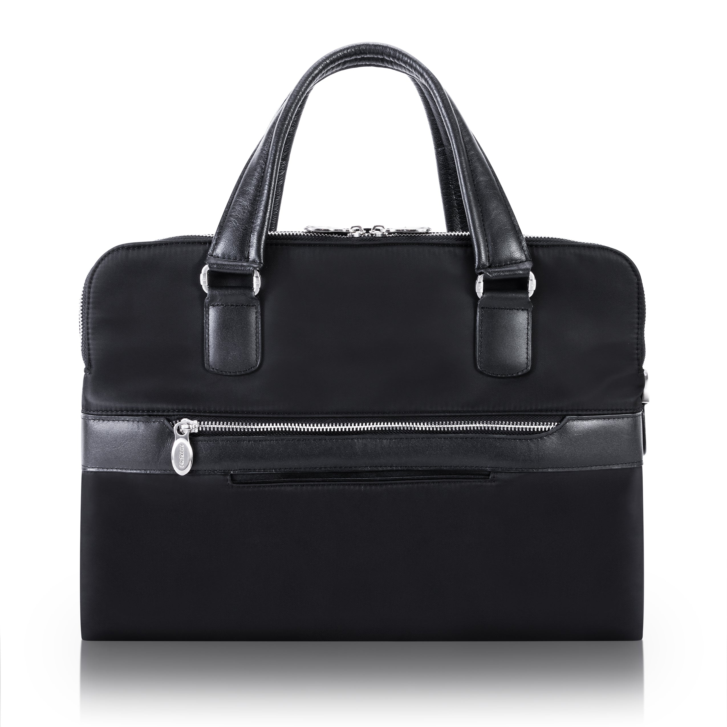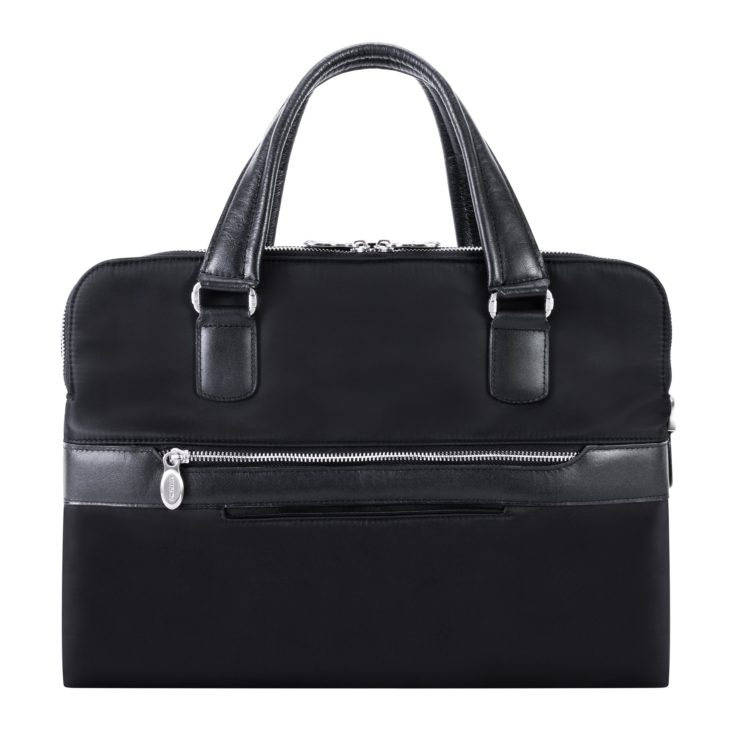 Compact soft-sided nylon brief with leather handle and accents. Front exterior zipper and easy access pockets. Fully-lined interior with leather accents. Front compartment features tablet pocket and organizer for business cards, pens, and accessories and spacious back compartment features secure zippered pocket. Silver accent hardware and metal zippers with metal feet on the base. Leather smart strap for piggy-backing onto rolling cases. Removable and adjustable nylon strap with leather shoulder pad.