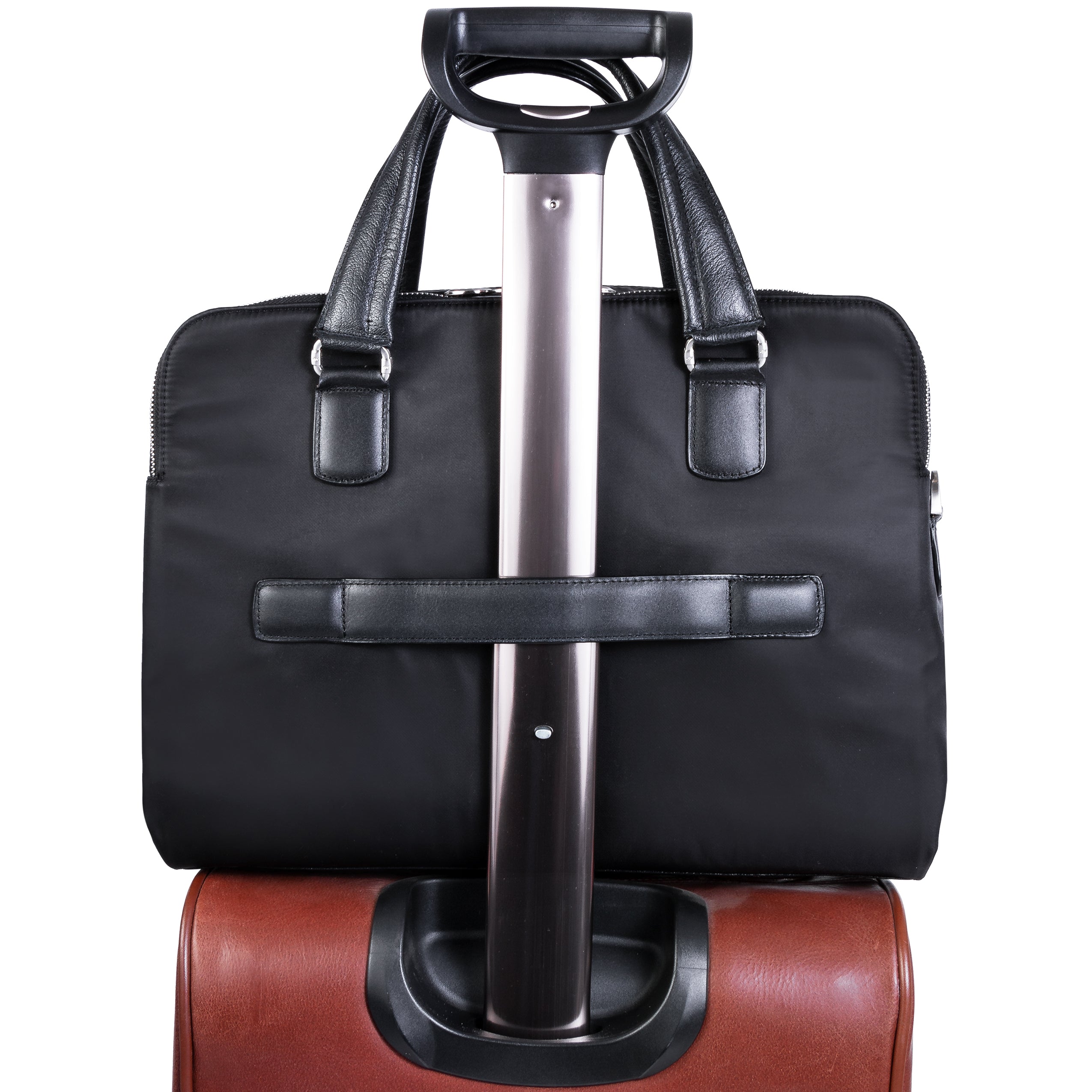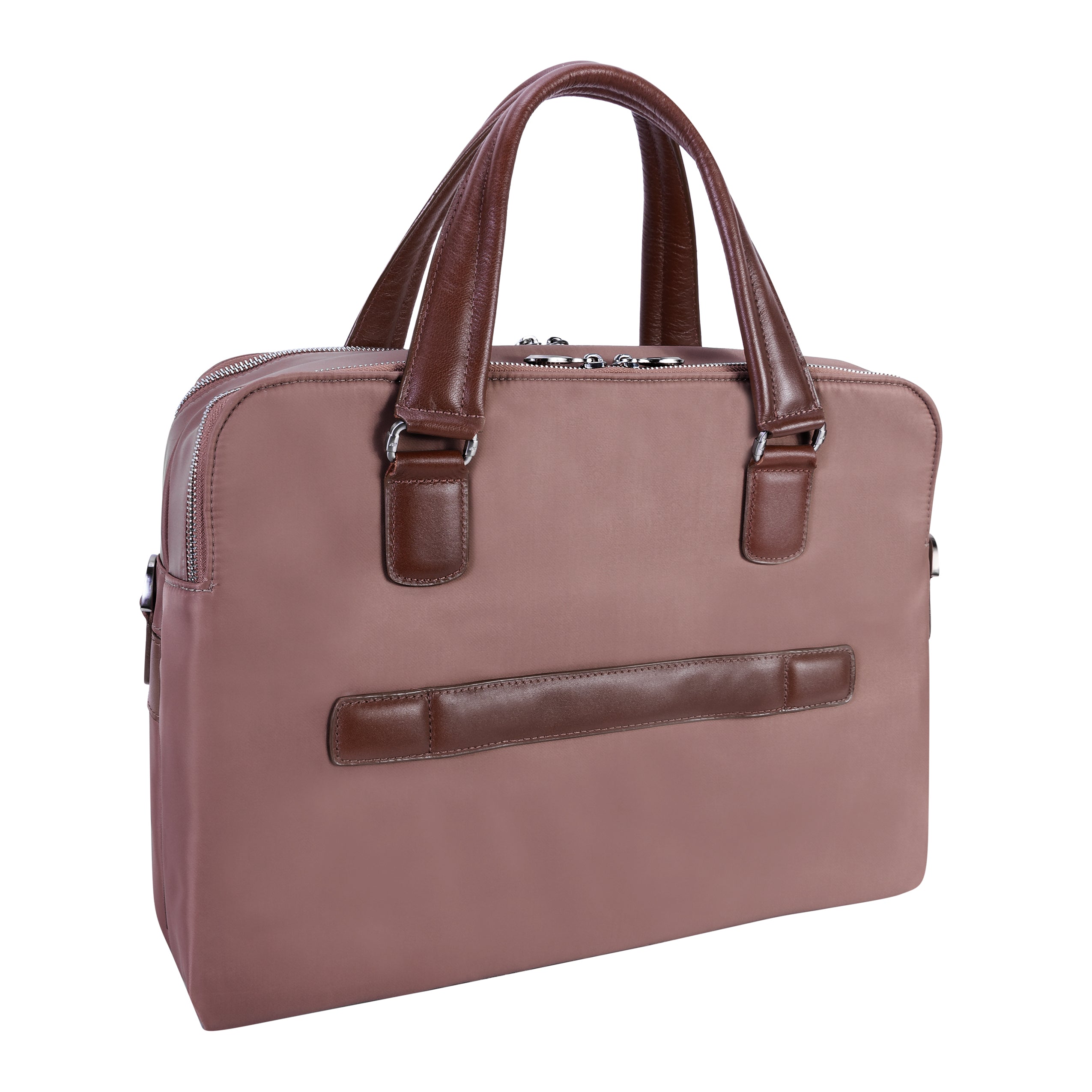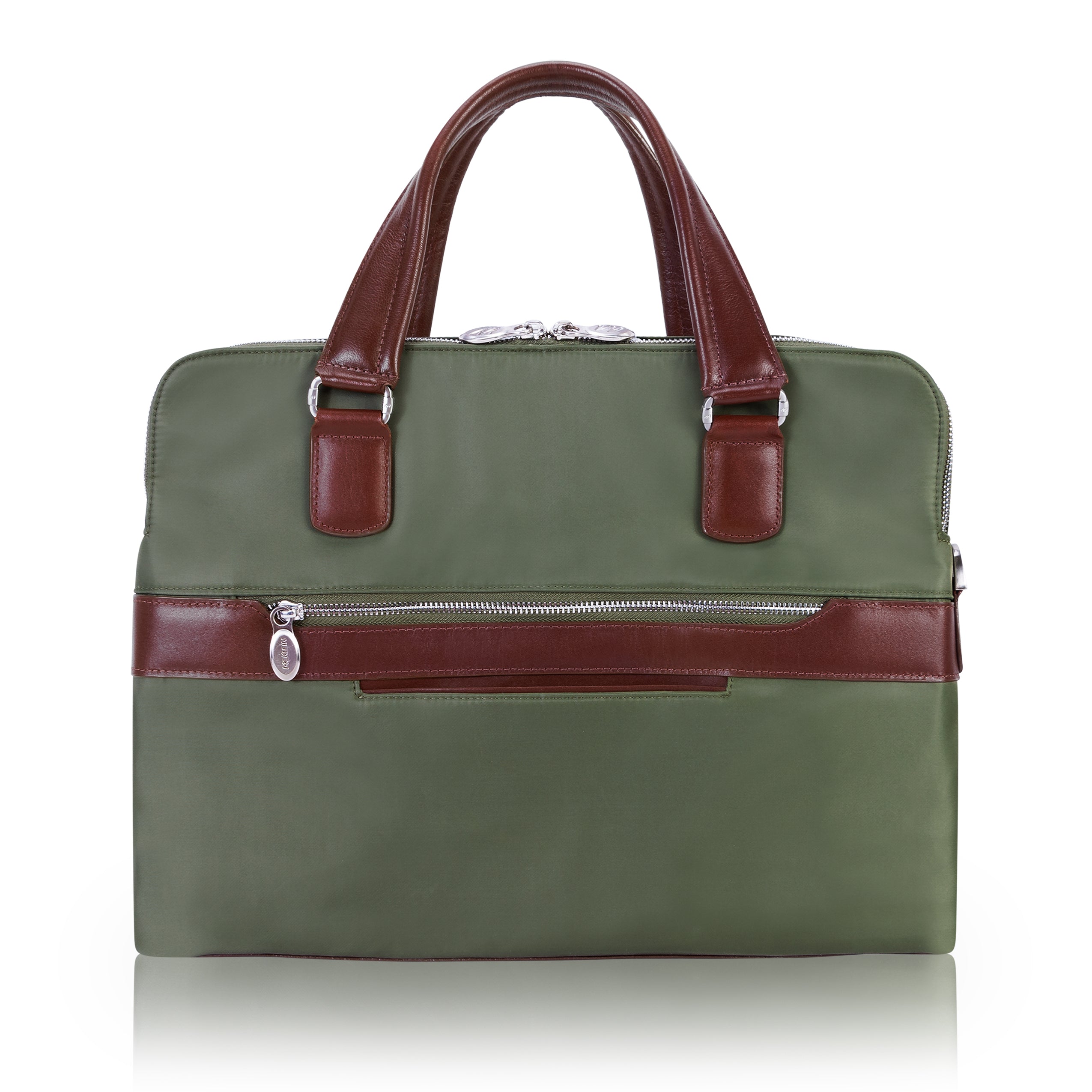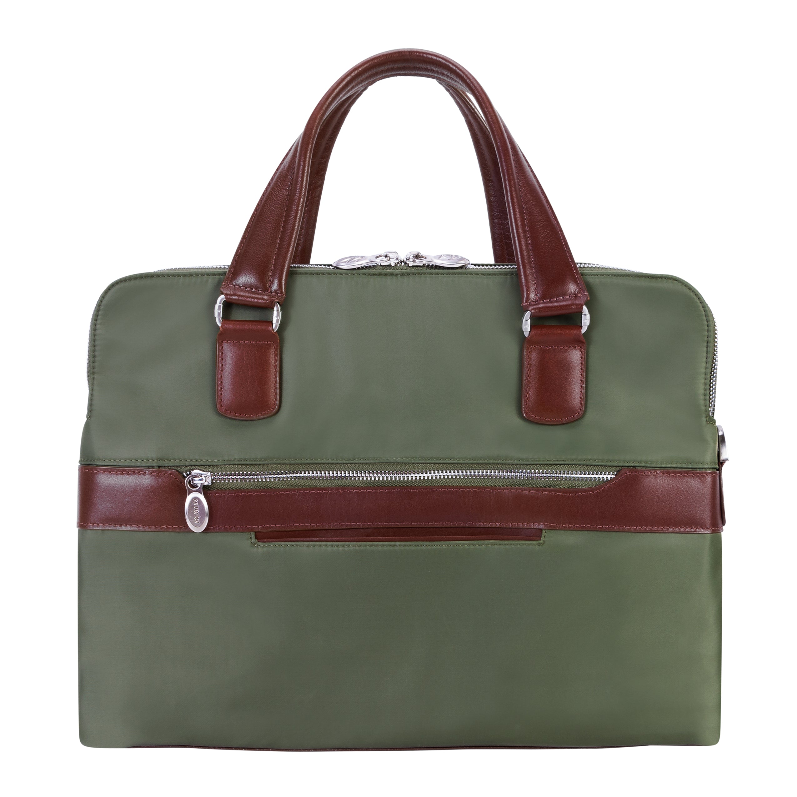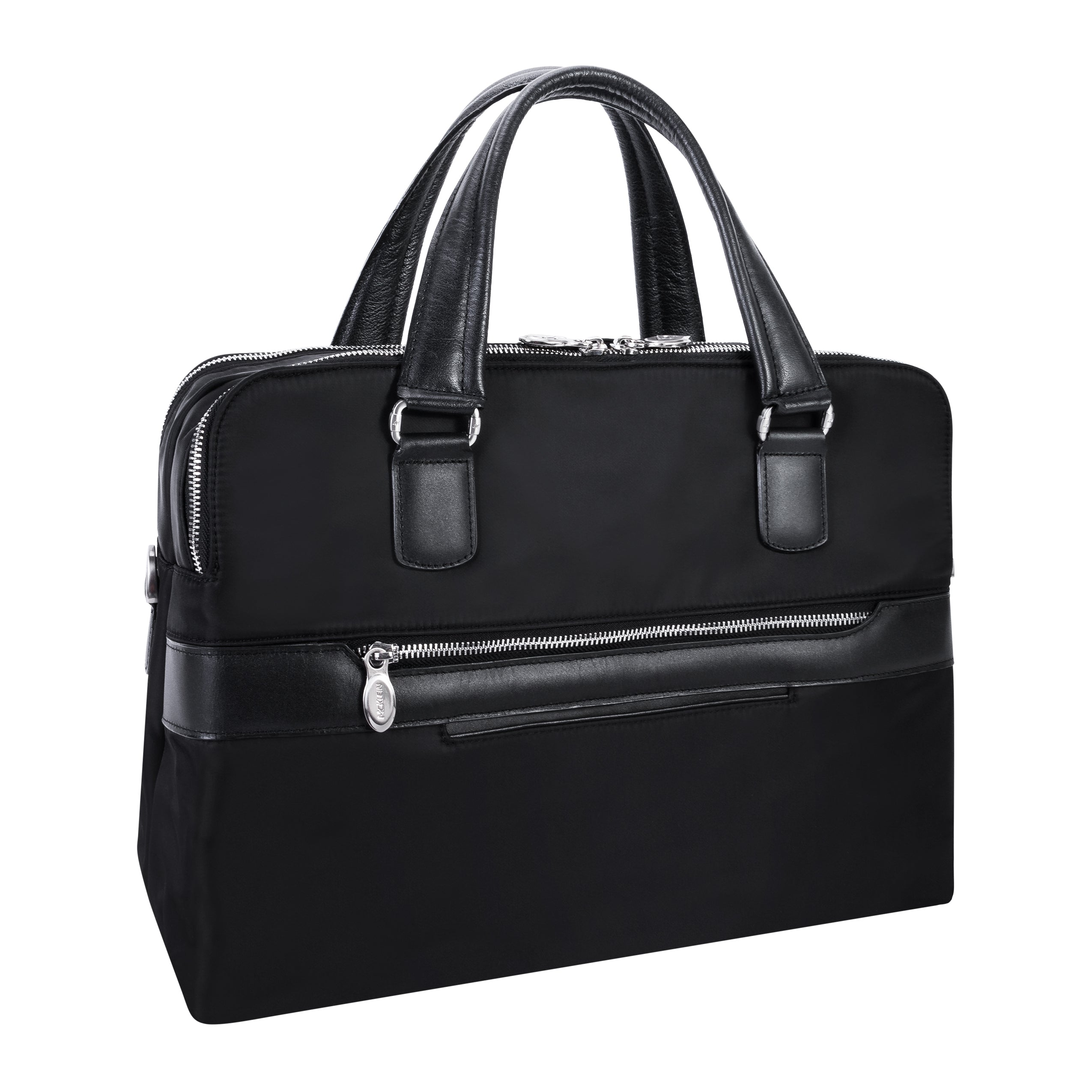 Compact soft-sided nylon brief with leather handle and accents. Front exterior zipper and easy access pockets. Fully-lined interior with leather accents. Front compartment features tablet pocket and organizer for business cards, pens, and accessories and spacious back compartment features secure zippered pocket. Silver accent hardware and metal zippers with metal feet on the base. Leather smart strap for piggy-backing onto rolling cases. Removable and adjustable nylon strap with leather shoulder pad.