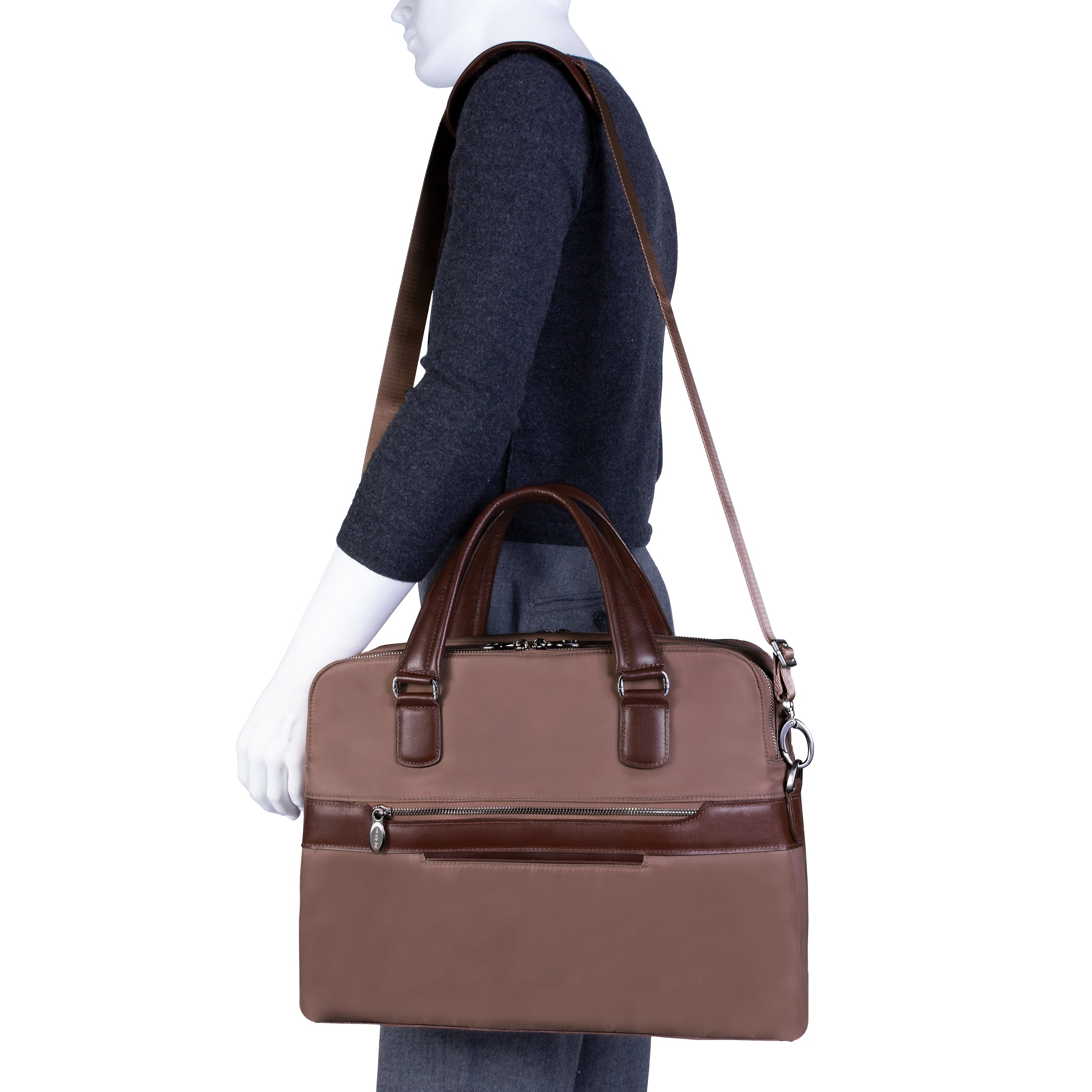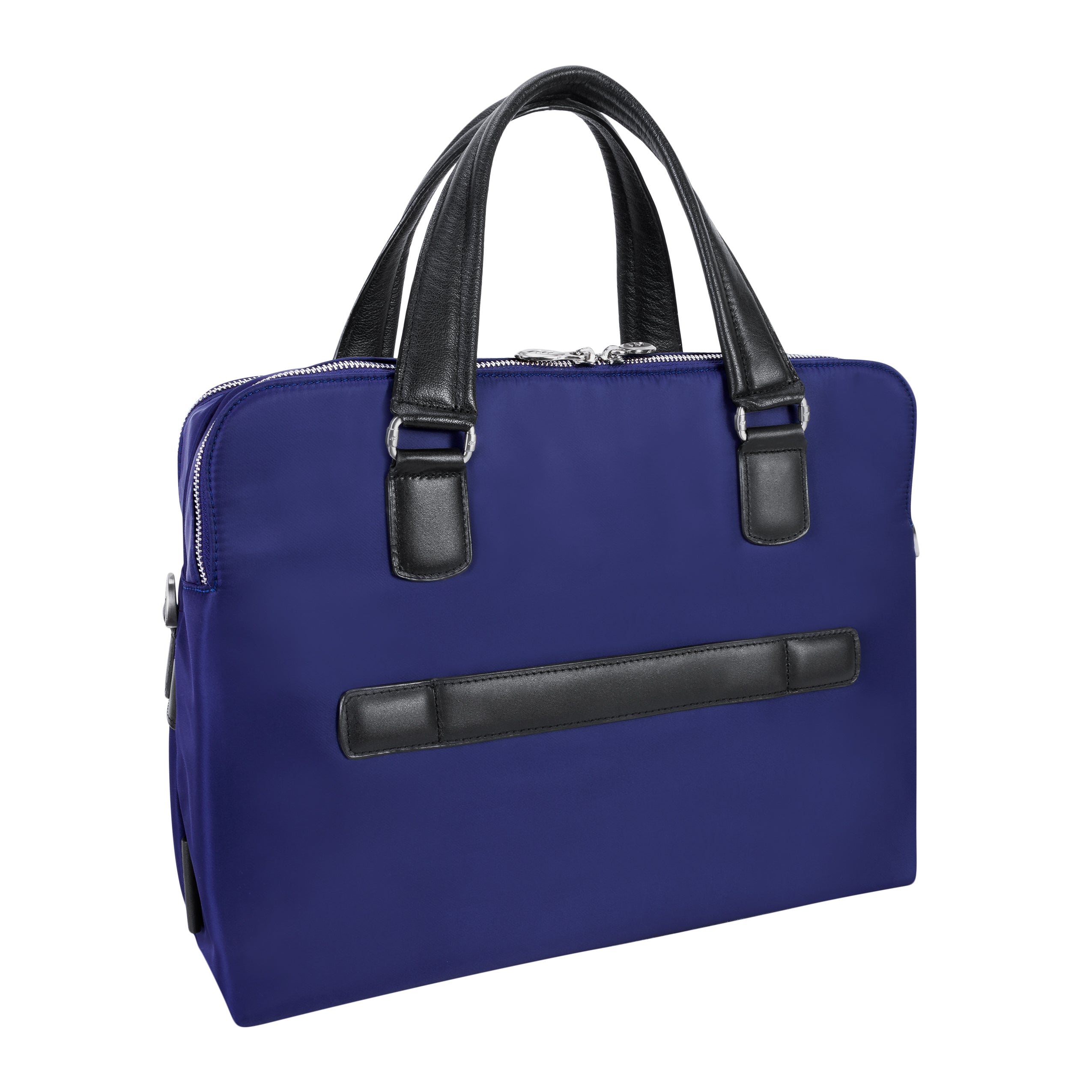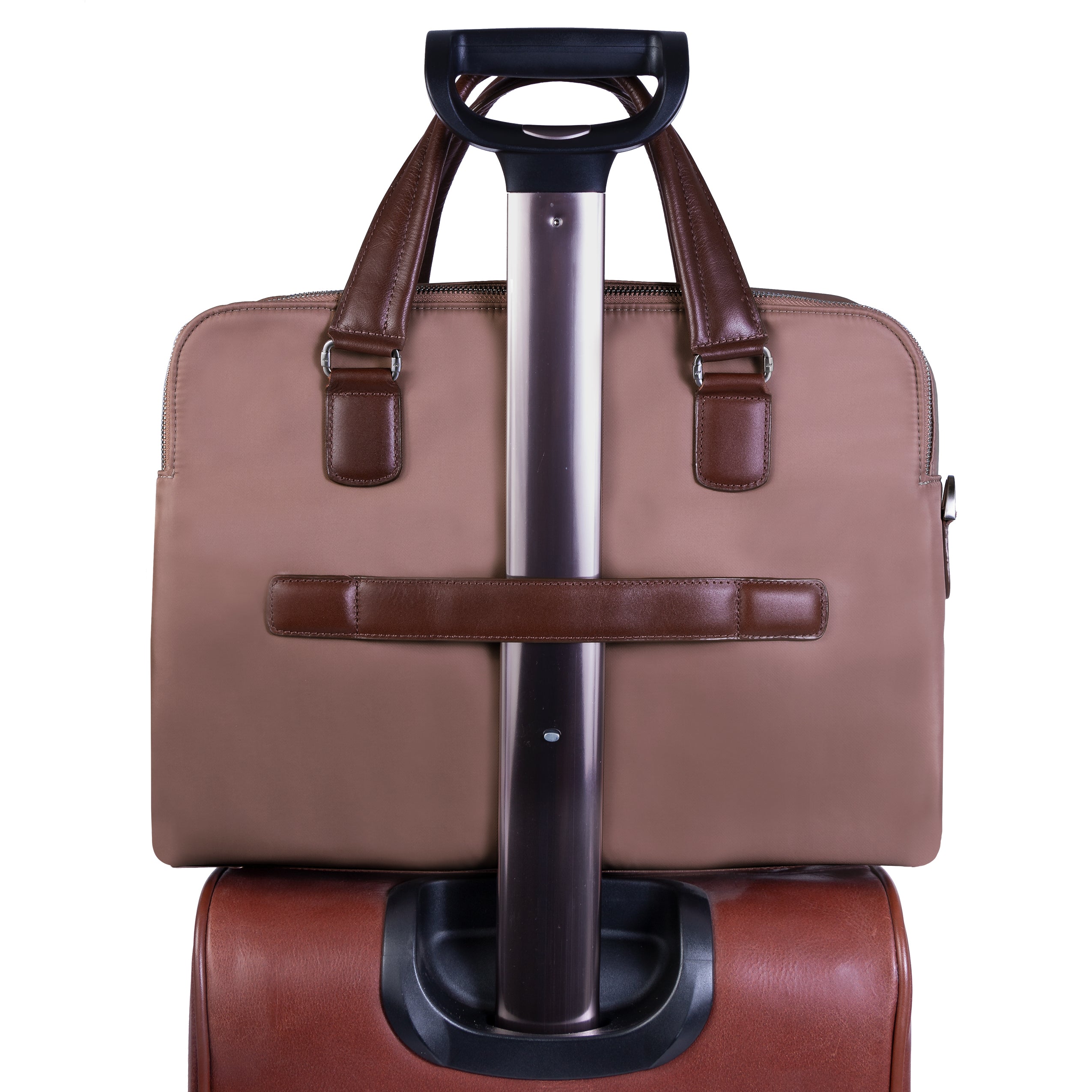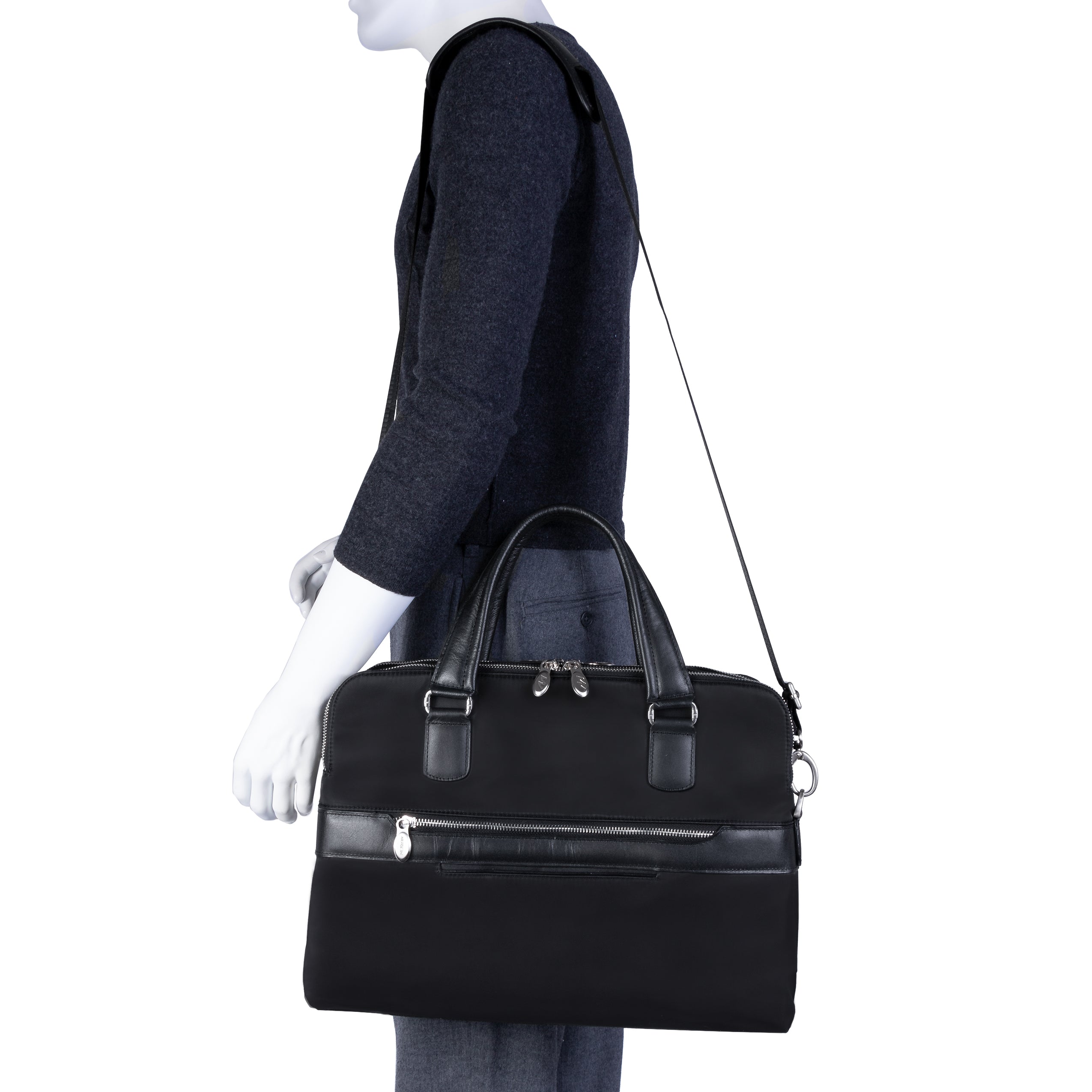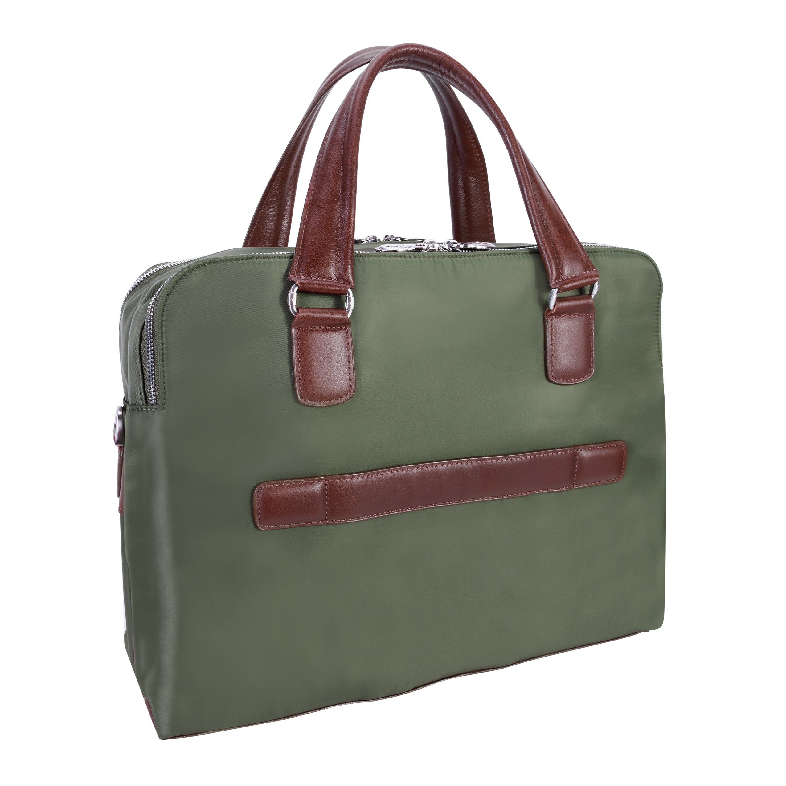 Compact soft-sided nylon brief with leather handle and accents. Front exterior zipper and easy access pockets. Fully-lined interior with leather accents. Front compartment features tablet pocket and organizer for business cards, pens, and accessories and spacious back compartment features secure zippered pocket. Silver accent hardware and metal zippers with metal feet on the base. Leather smart strap for piggy-backing onto rolling cases. Removable and adjustable nylon strap with leather shoulder pad.