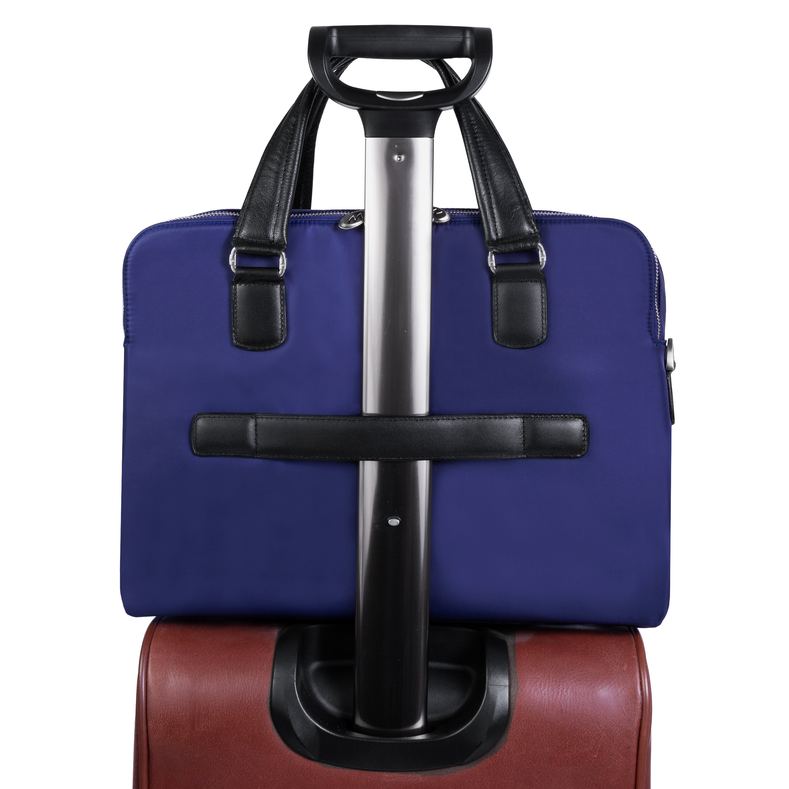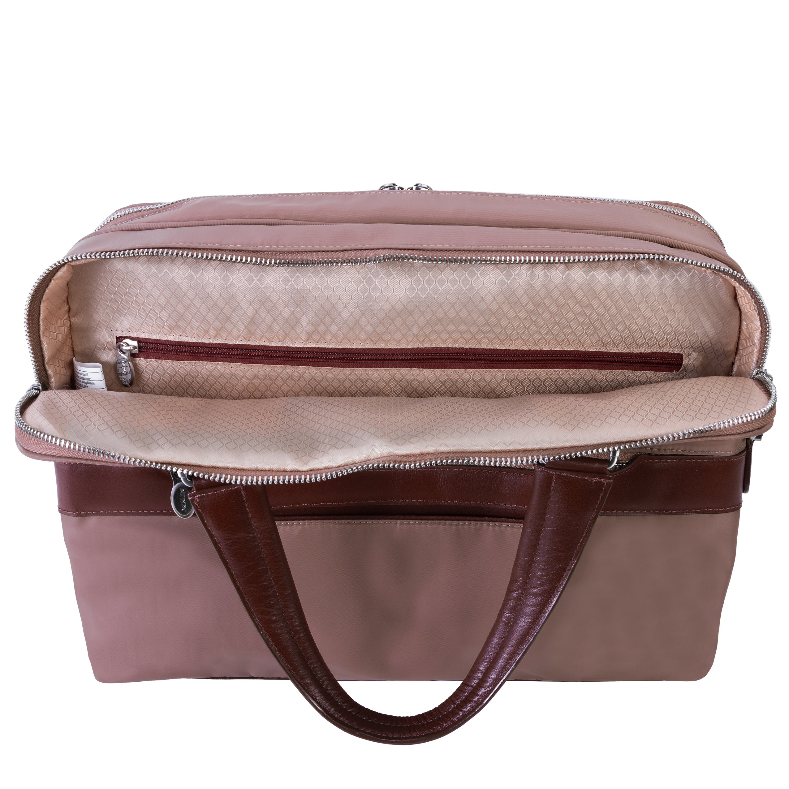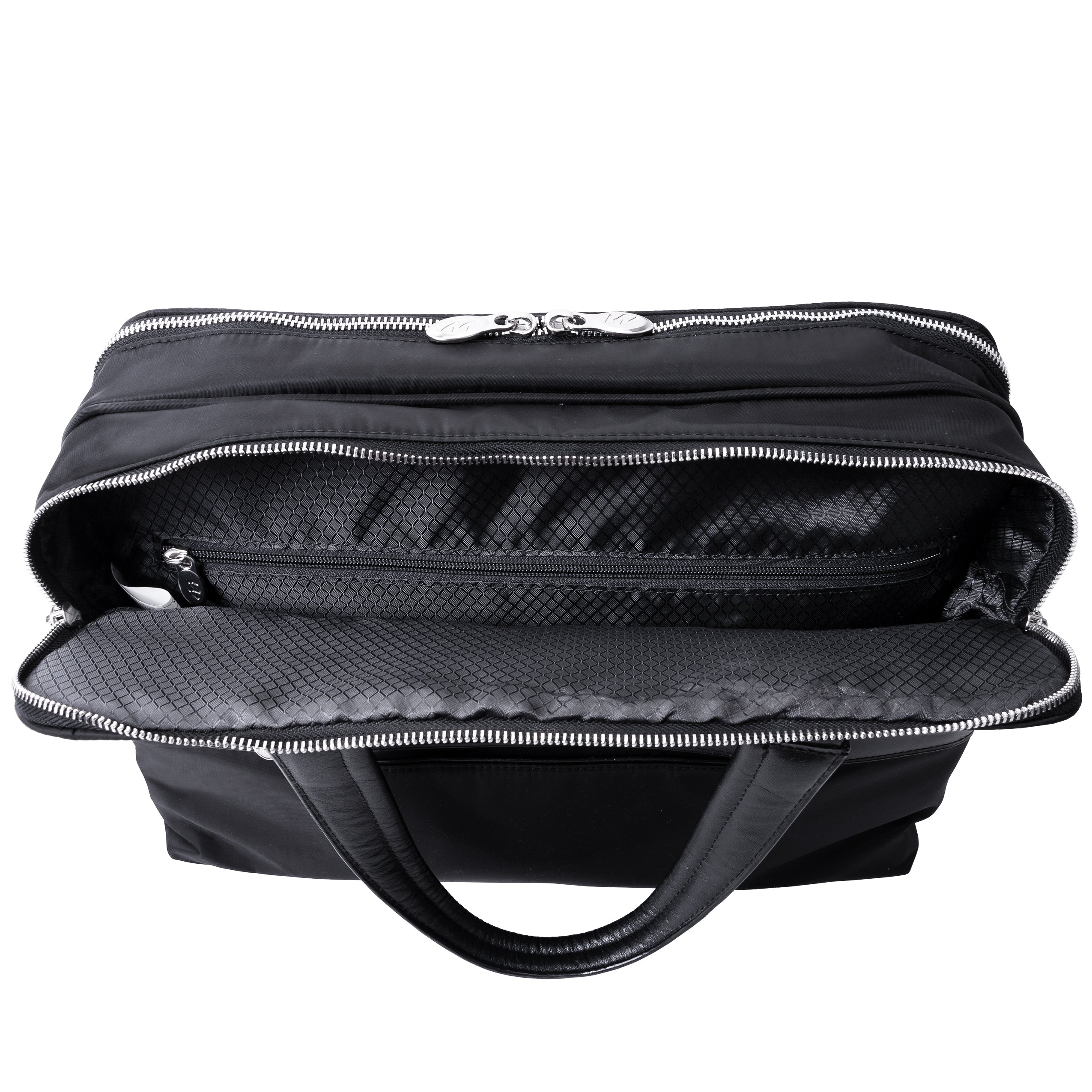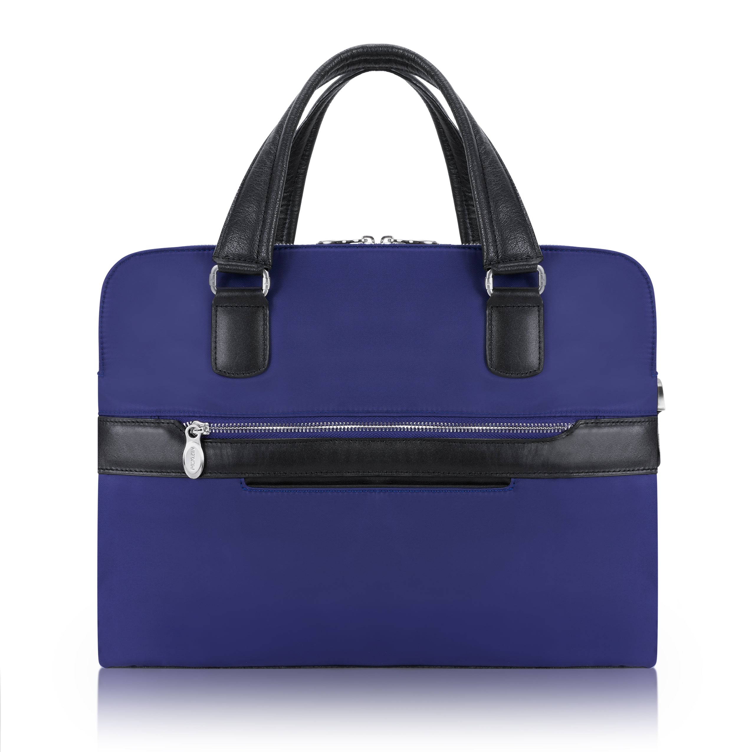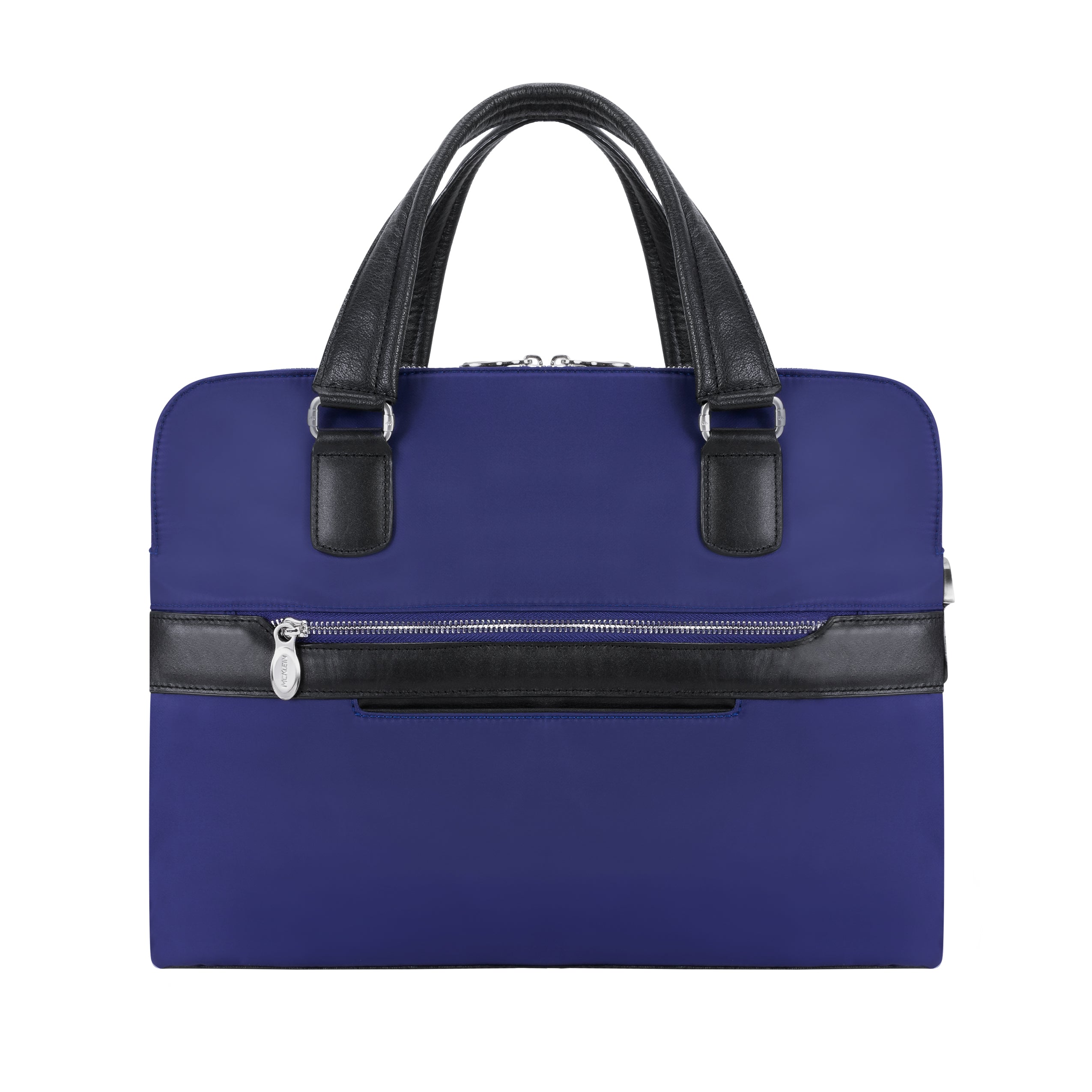 Compact soft-sided nylon brief with leather handle and accents. Front exterior zipper and easy access pockets. Fully-lined interior with leather accents. Front compartment features tablet pocket and organizer for business cards, pens, and accessories and spacious back compartment features secure zippered pocket. Silver accent hardware and metal zippers with metal feet on the base. Leather smart strap for piggy-backing onto rolling cases. Removable and adjustable nylon strap with leather shoulder pad.