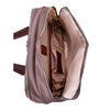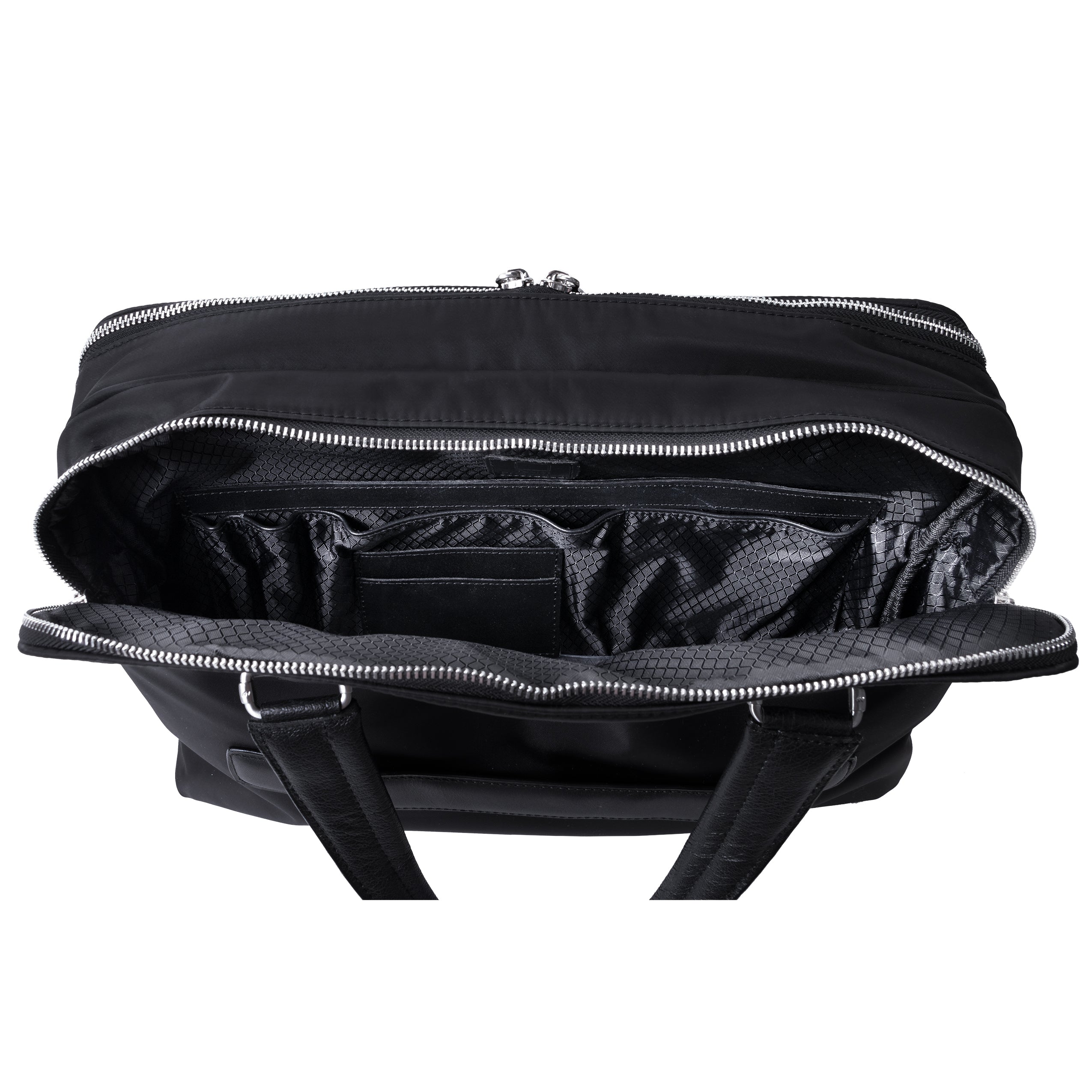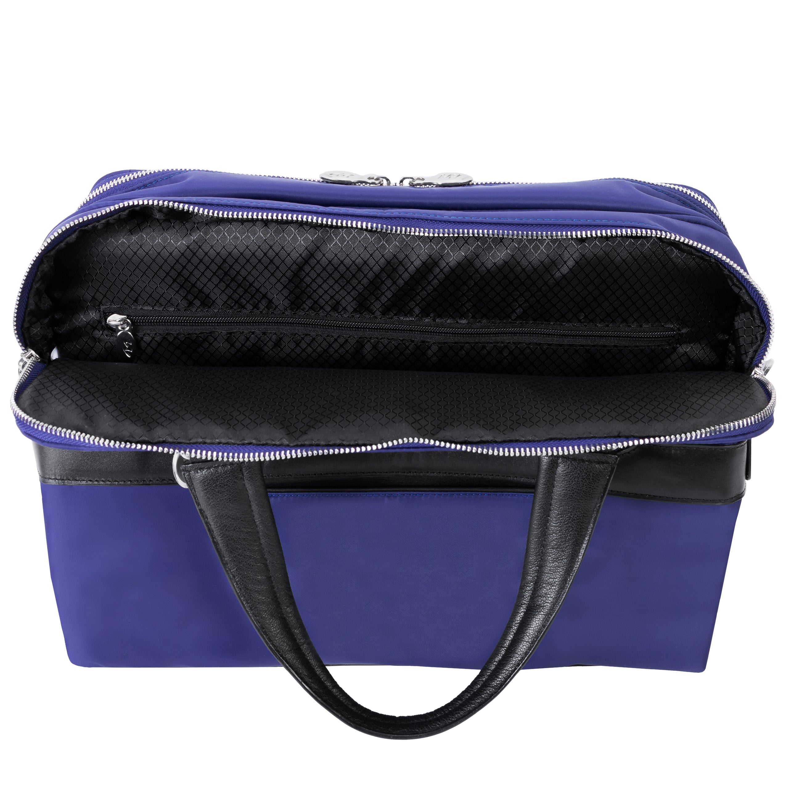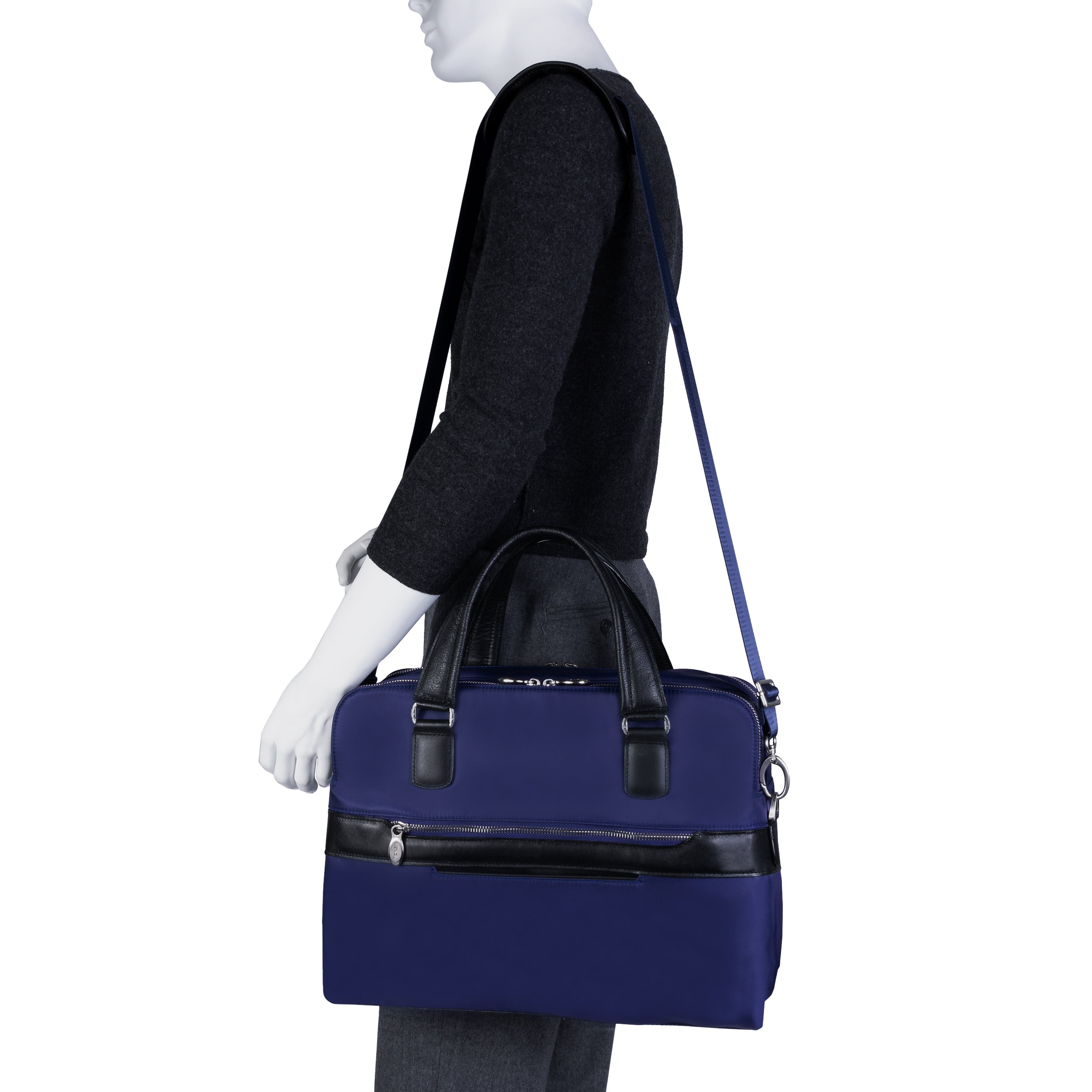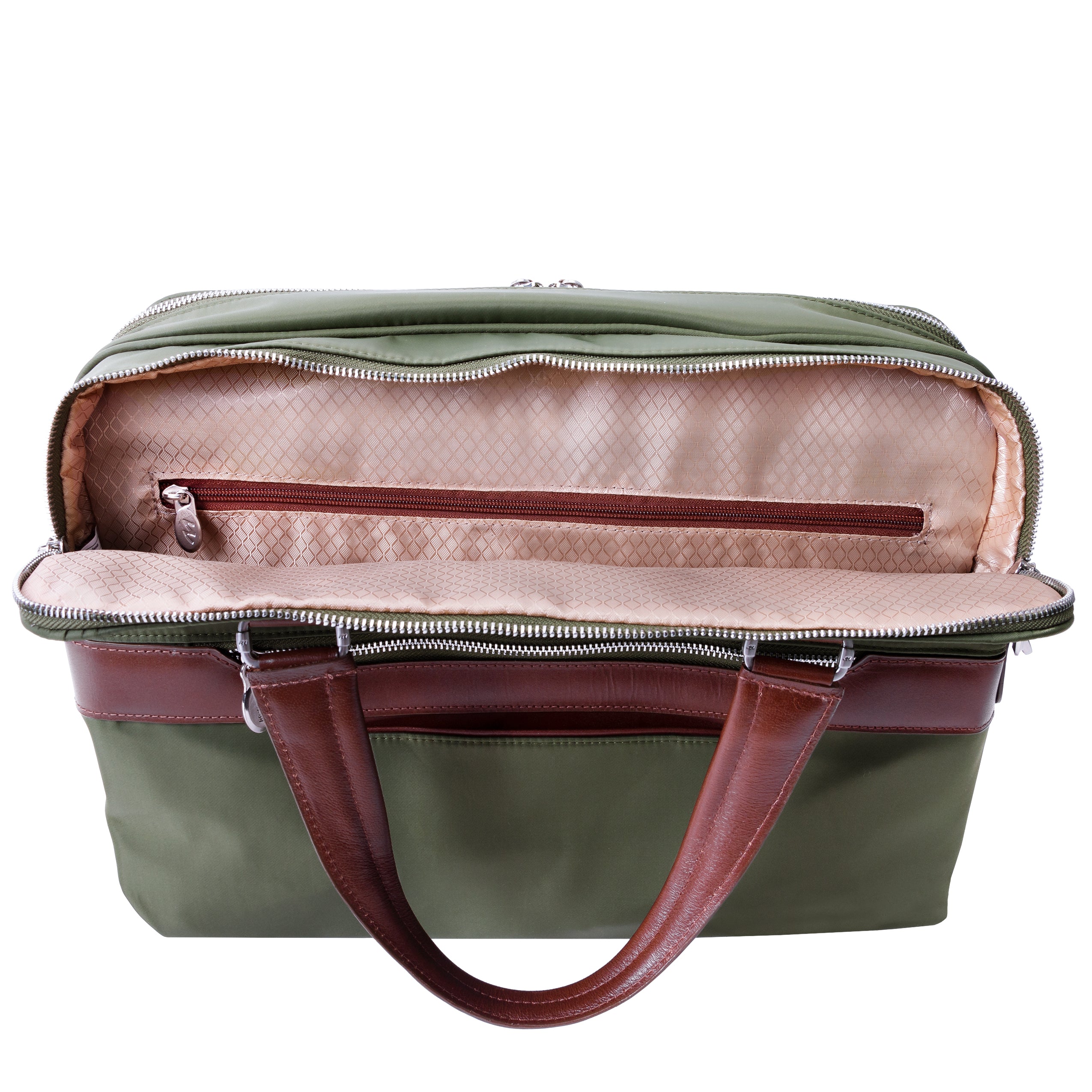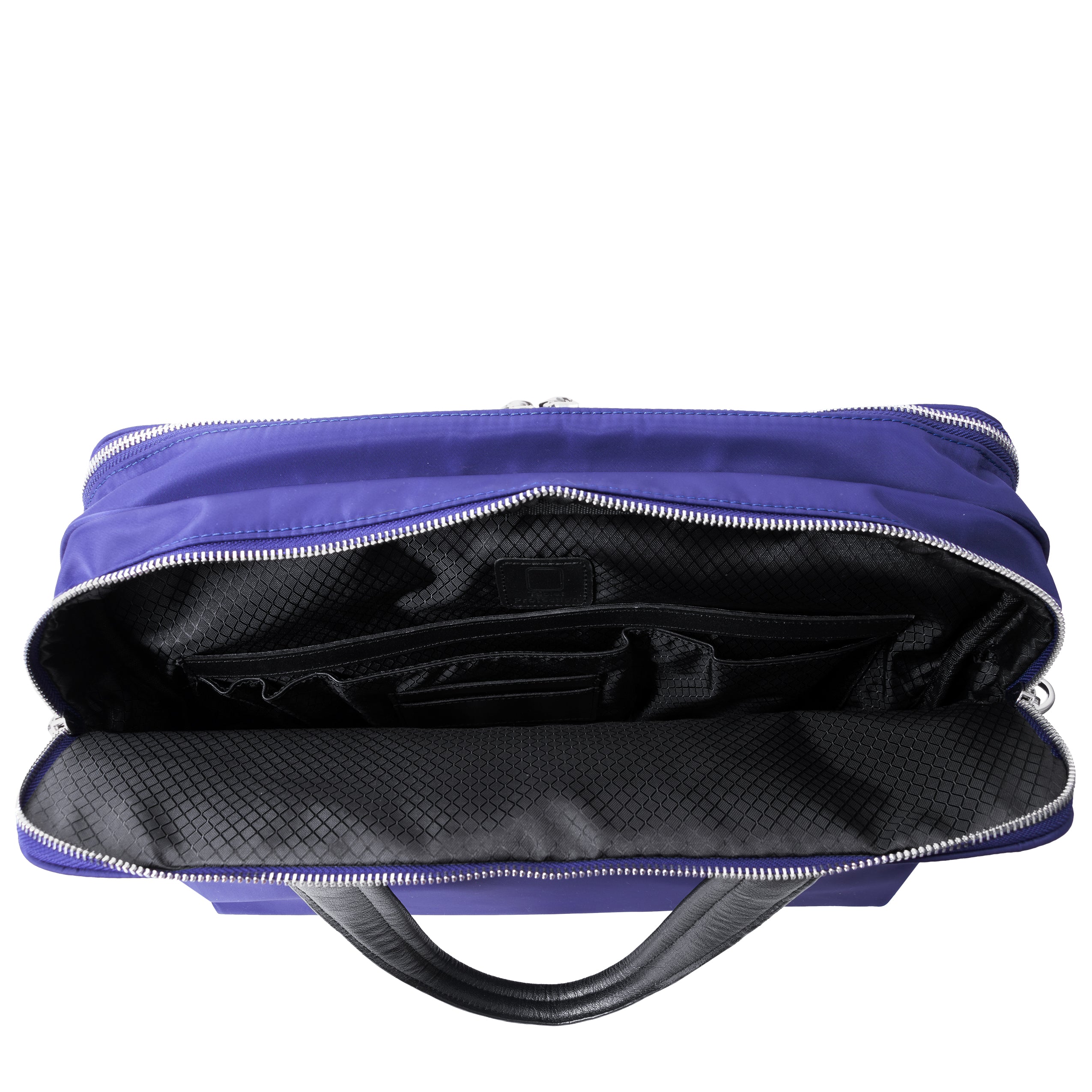 Compact soft-sided nylon brief with leather handle and accents. Front exterior zipper and easy access pockets. Fully-lined interior with leather accents. Front compartment features tablet pocket and organizer for business cards, pens, and accessories and spacious back compartment features secure zippered pocket. Silver accent hardware and metal zippers with metal feet on the base. Leather smart strap for piggy-backing onto rolling cases. Removable and adjustable nylon strap with leather shoulder pad.