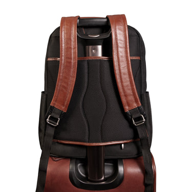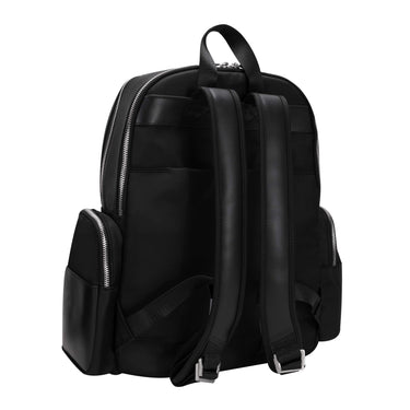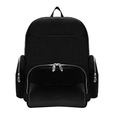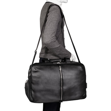 Amazingly spacious nylon 21 with elegant contrasting leather accents dual compartment carry-on duffle makes packing for important trips simple. Cellphones, keys, and other such items can be stored for easy access in the front zipper pocket with accessory organizer. Other necessary items can be stored in the front dual slip pockets in any situation. The fully lined interior with leather trim and silver hardware is guaranteed to keep all your mobile needs stored safe with anti-theft locking double loop metal zippers. Clothes, files, papers, etc. can all be stored in the main compartment with enough room for a week. Keep your toiletries in the elastic pockets for simple storage. The back compartment can safely store your laptop and tablet in the secured built in padded laptop sleeve and tablet pocket. Attach the included non-slip contour removable shoulder strap and sling the bag onto your shoulder. Unzip the back pocket to attach to any rolling case for comfortable transport and set it down with confidence on 5 protective rubber feet.
