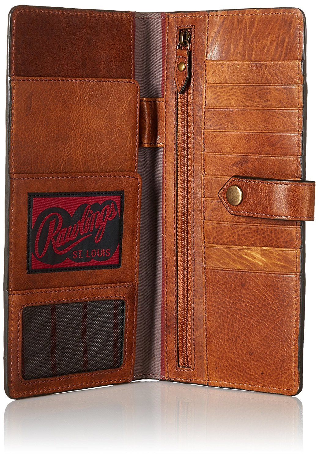 Vintage look pre-washed with distressed character in rich warm Cognac leather. Rawlings embossed patch logo. Combines classic good looks with durability and great organization functionality.