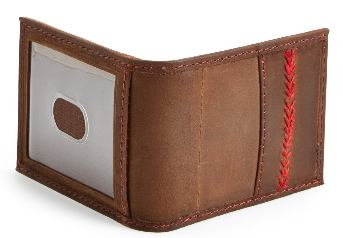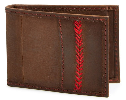 Rich brown cowhide with hand rubbed, burnished finish accented with classic red baseball seam stitching.