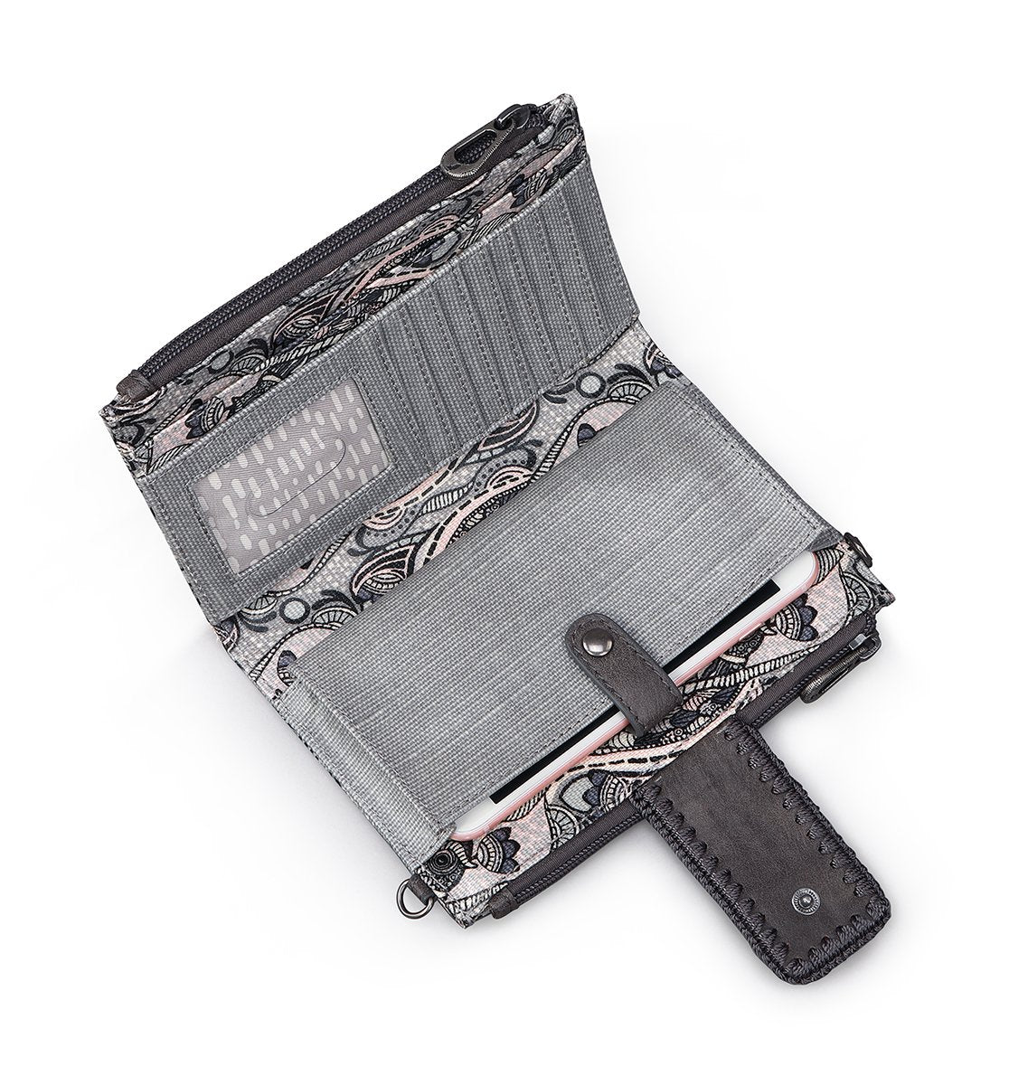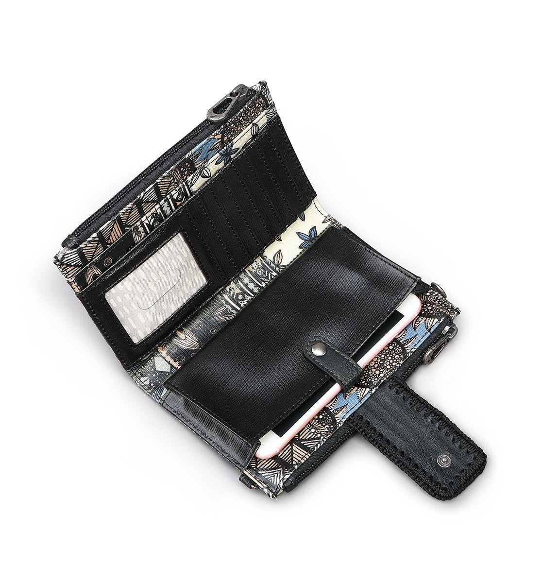 • Interior contains 7 credit card slots, ID window, smartphone pocket with snap closure and 2 bill slit pockets