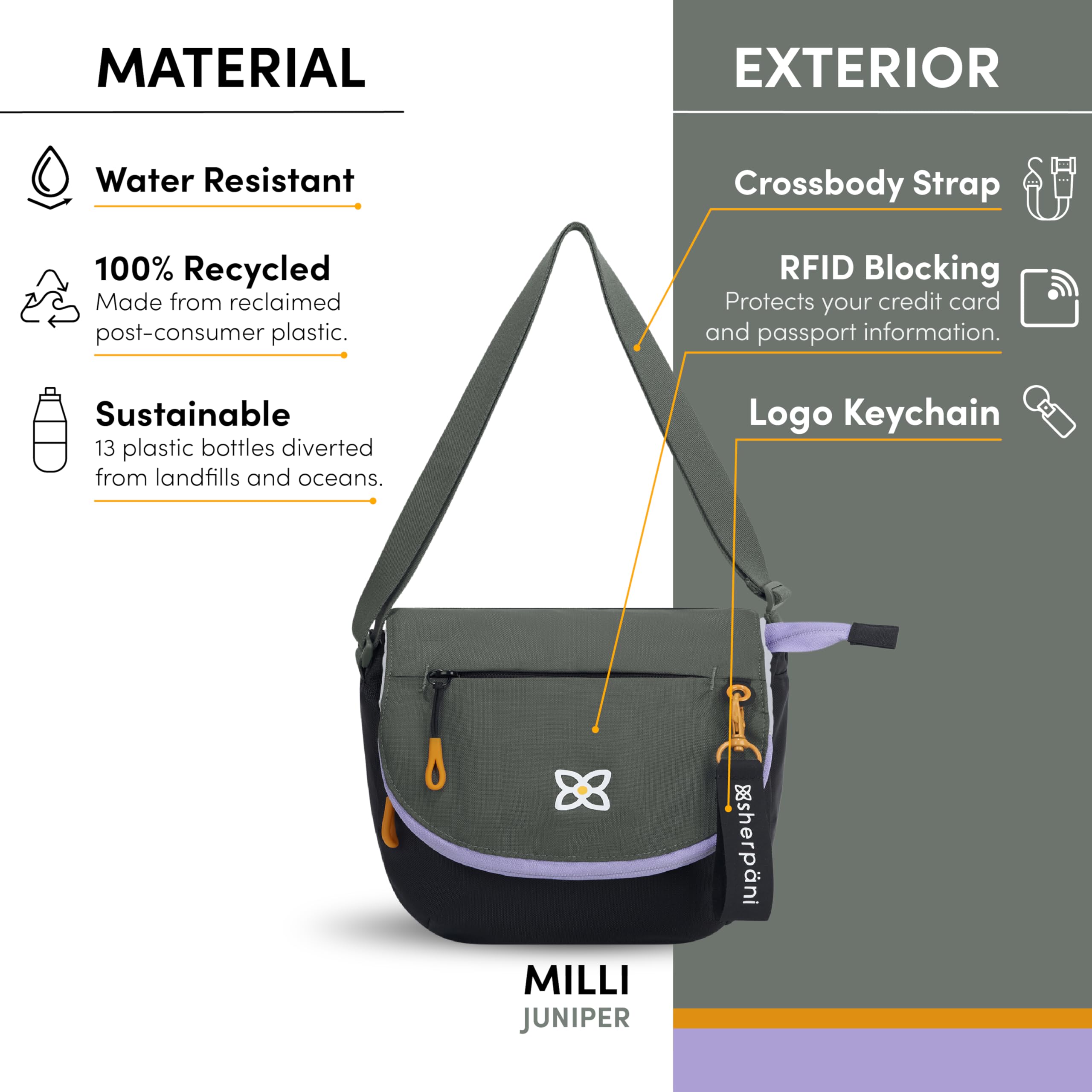 Meet your new favorite bag. The Milli is a medium-sized, fold-over style crossbody. A soft, adjustable crossbody strap, RFID protection and easy-to-clean Repreve fabric are features that set the Milli apart from other crossbodies.