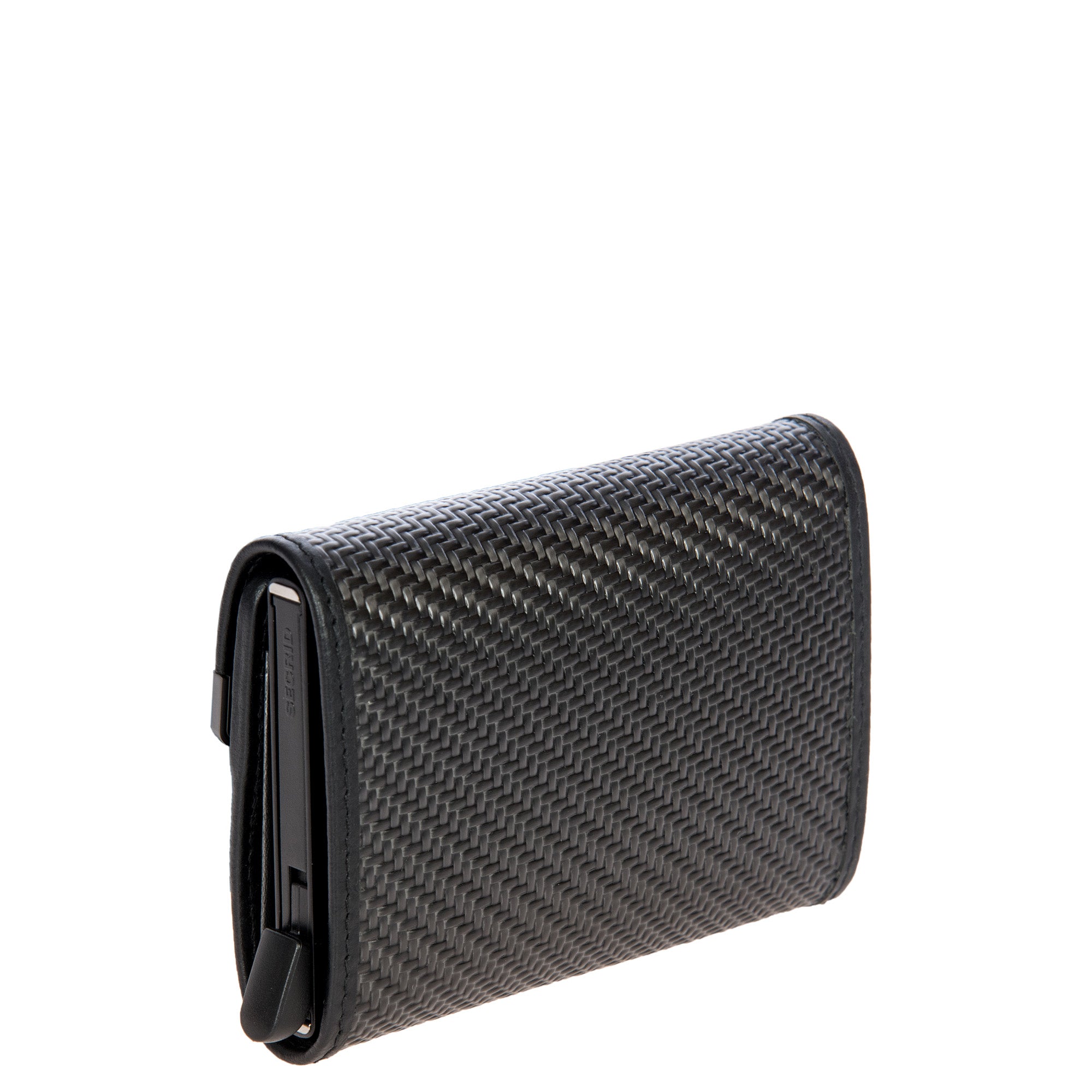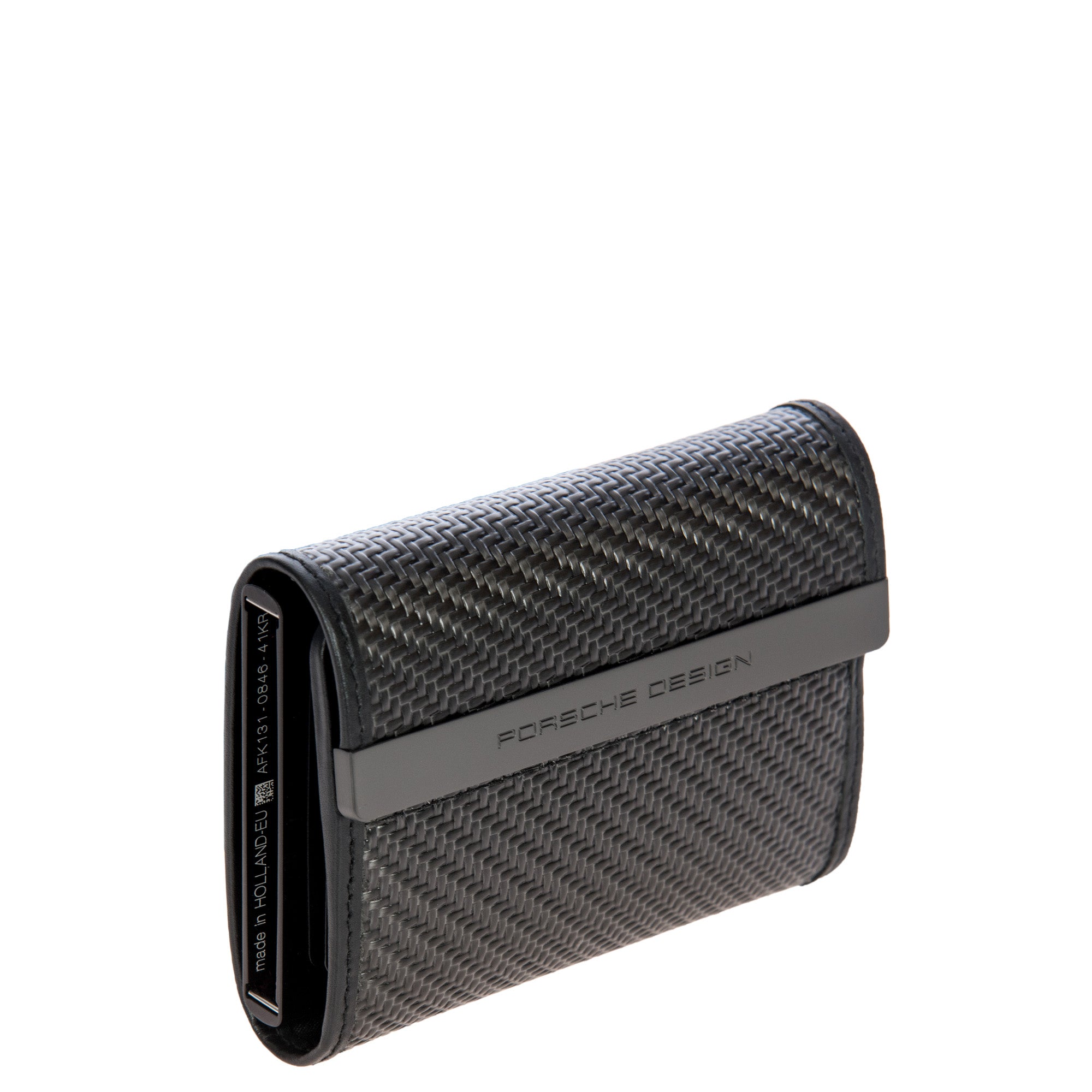 Luxury in a compact form: the Porsche Design X Secrid carbon cardholder with carbon-weave material represents exclusive design and functionality. The high-tech material from motorsport lends the Porsche Design Carbon Collection its unmistakable design DNA. The metal cardholder offers quick access to up to four cards with its special pop-up function. A leather cover expands its capacity with an extra card compartment for up to six additional cards as well as a bill compartment with folding aid. The hard case protects against bending, breaking and unwanted RFID and NFC communication. The exclusive design is rounded off by the engraved Porsche Design logo on the leather fold.