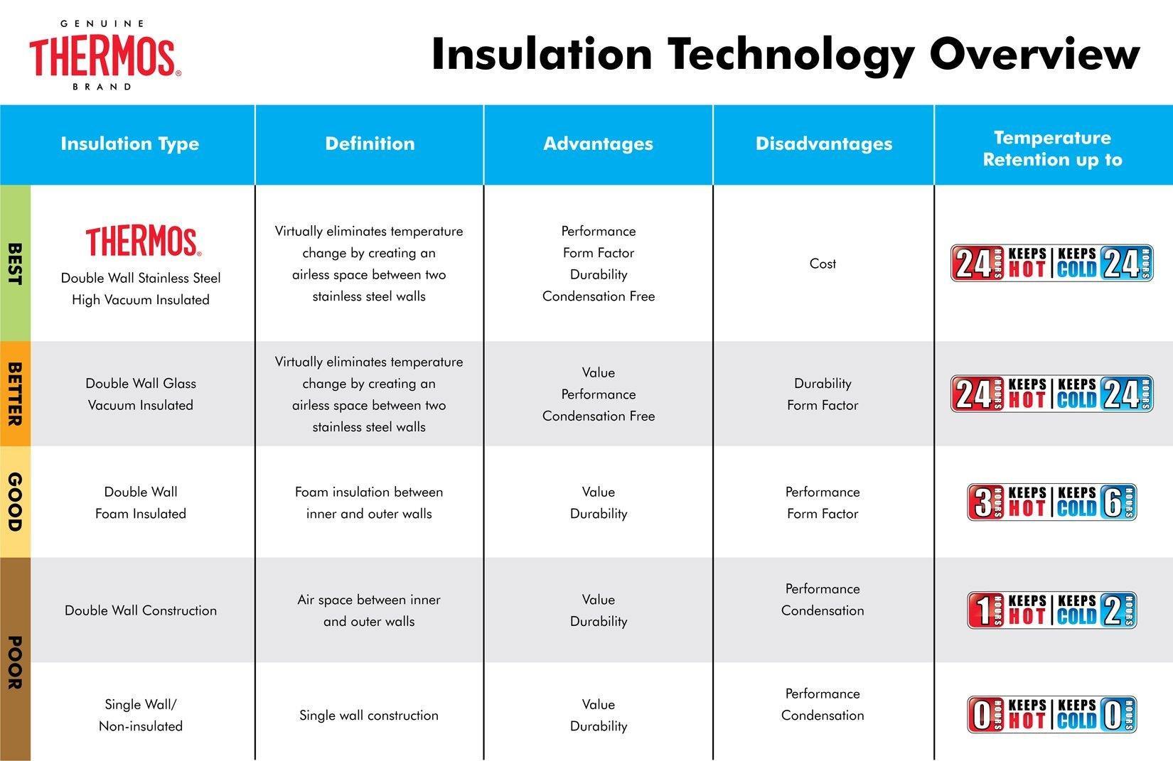 • Thermos vacuum insulation technology for maximum temperature retention, hot or cold, keeps liquids hot for 12 hours and cold for 24 hours