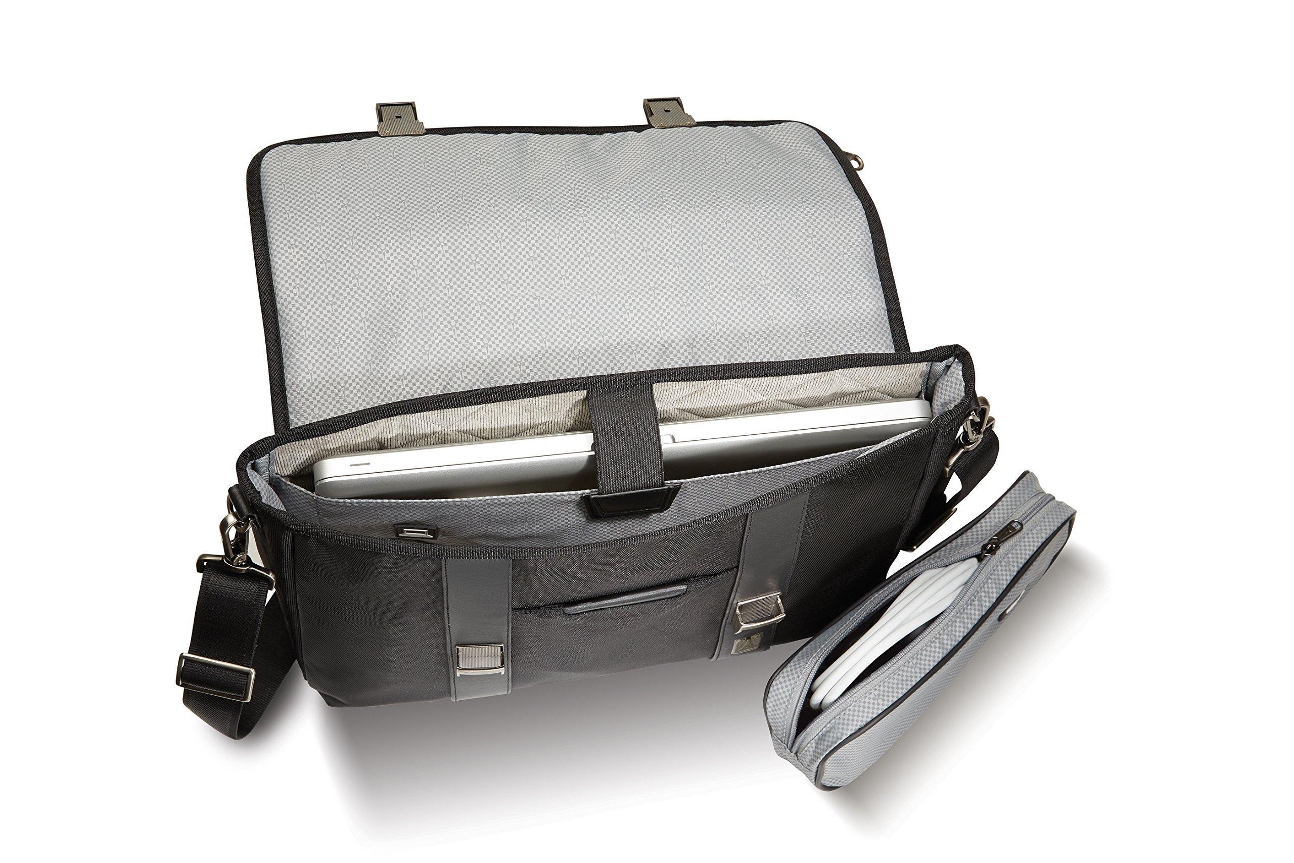 • Built-in business organizer and removable cord pouch provide efficient storage for business essentials and power cables. Genuine leather handles and accents combined with rugged nylon fabric and dura guard coating provide exceptional durability and stain resistance