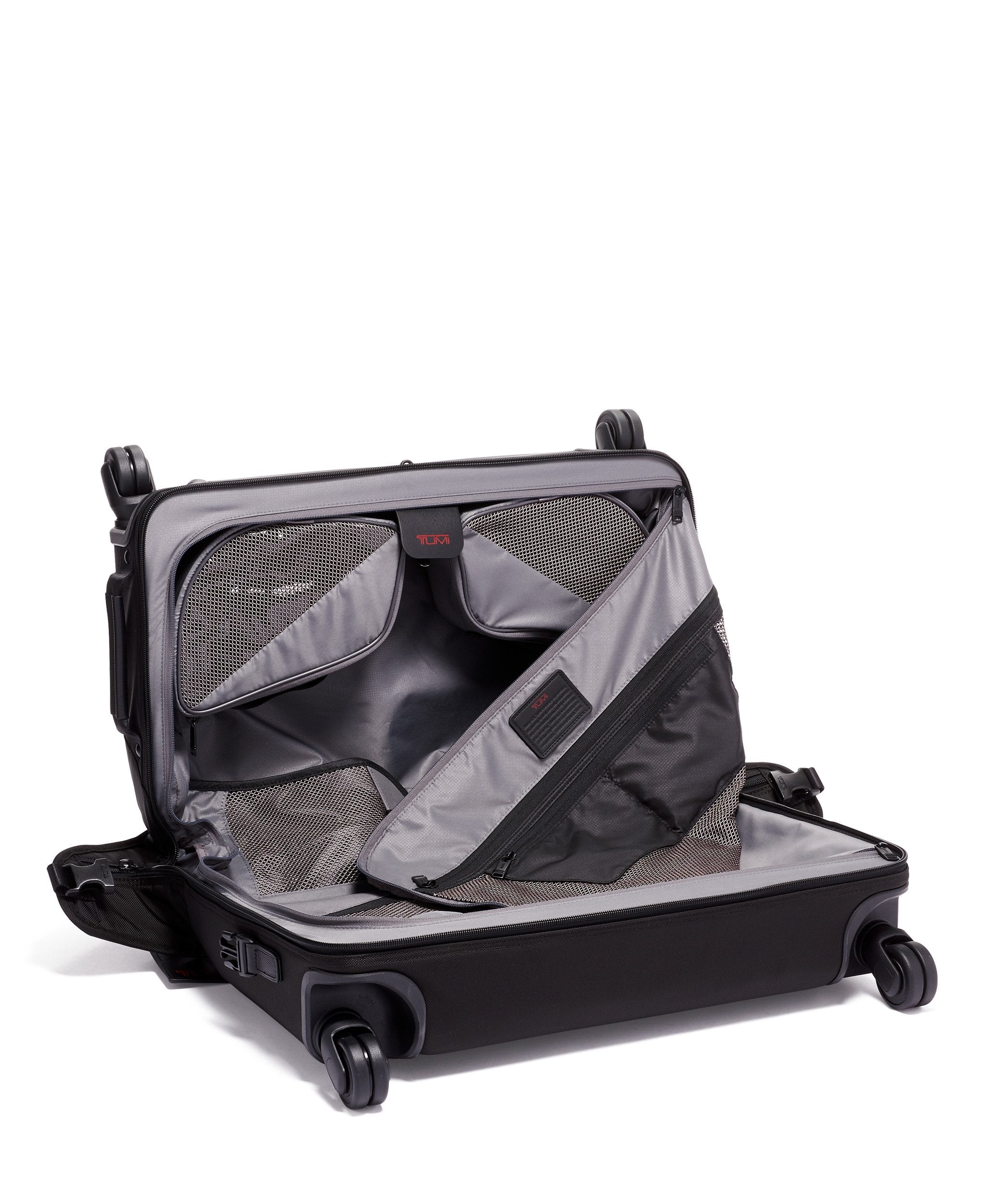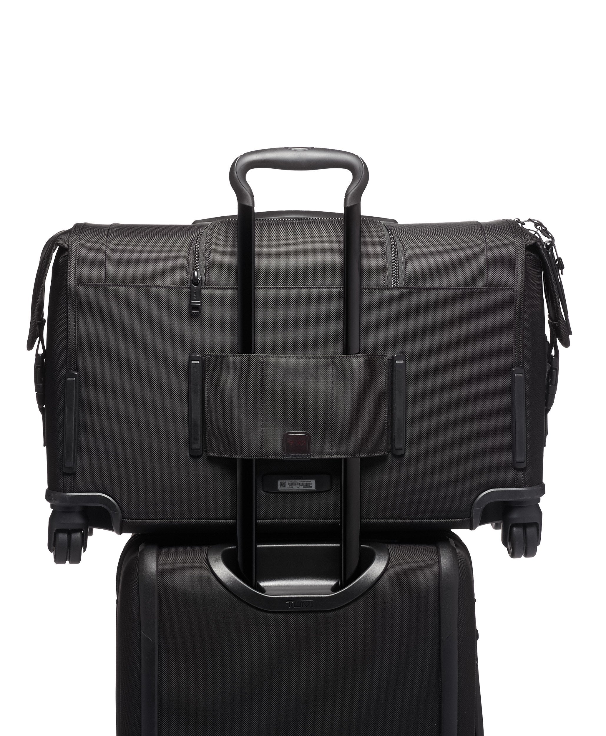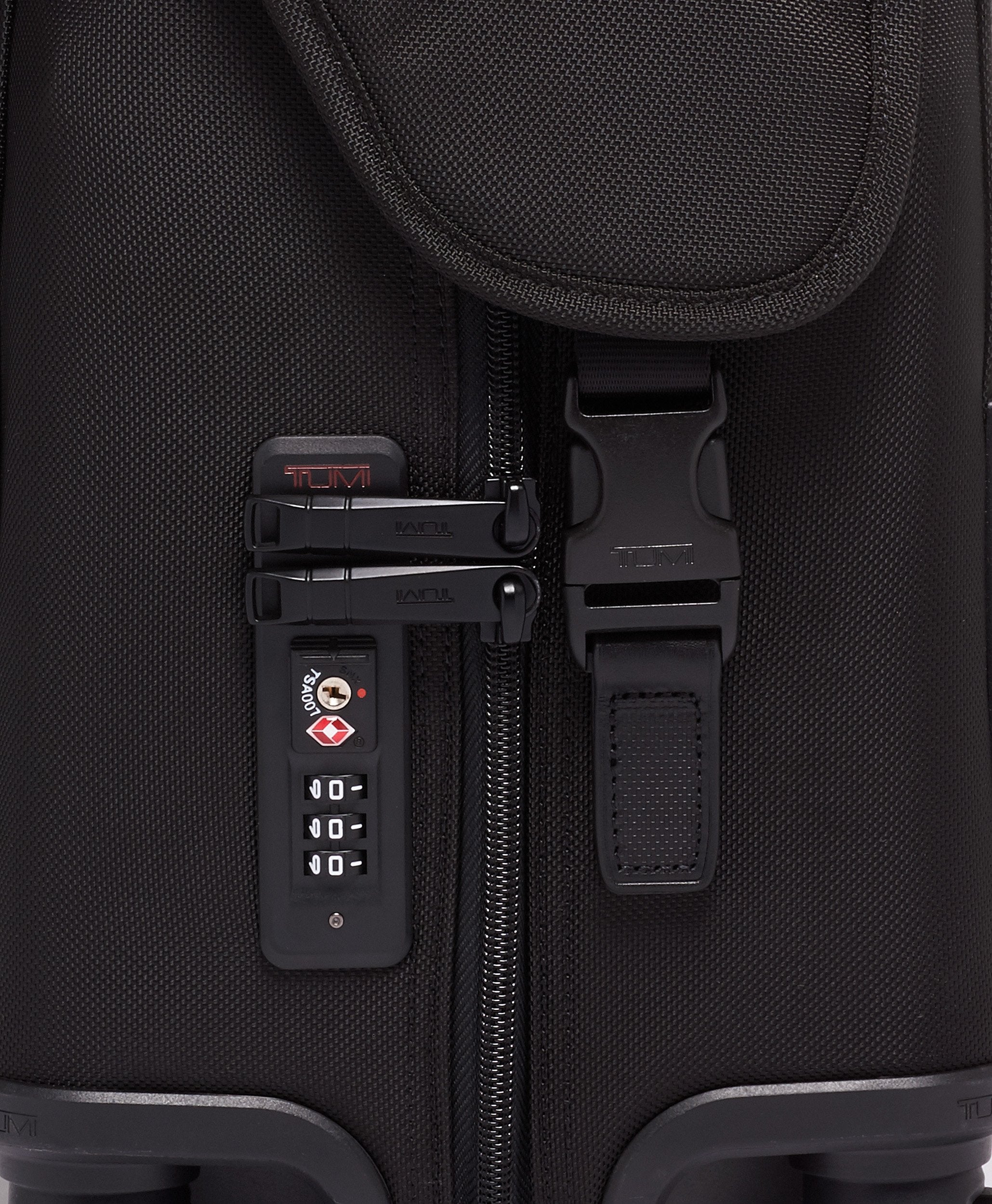 Indispensable for the frequent traveler, this carry-on garment bag features a unique 4-wheel design that allows you to easily roll the bag down a narrow airplane aisle. The roomy interior includes a zippered section that accommodates a suit. Two removable zip pouches are perfect for accessories. A built-in TSA combination lock keeps your items secure. Part of our Alpha 3 Collection, made from TUMIs patented, ultra-durable FXT ballistic nylon. Our iconic business and travel pieces bringtogether innovative design, superior performance, and best in class functionality. Select styles come outfitted with a colorful TUMI Accents Kit luggage tag, monogram patch, handle wrap and zipper pull ties for an additional cost.