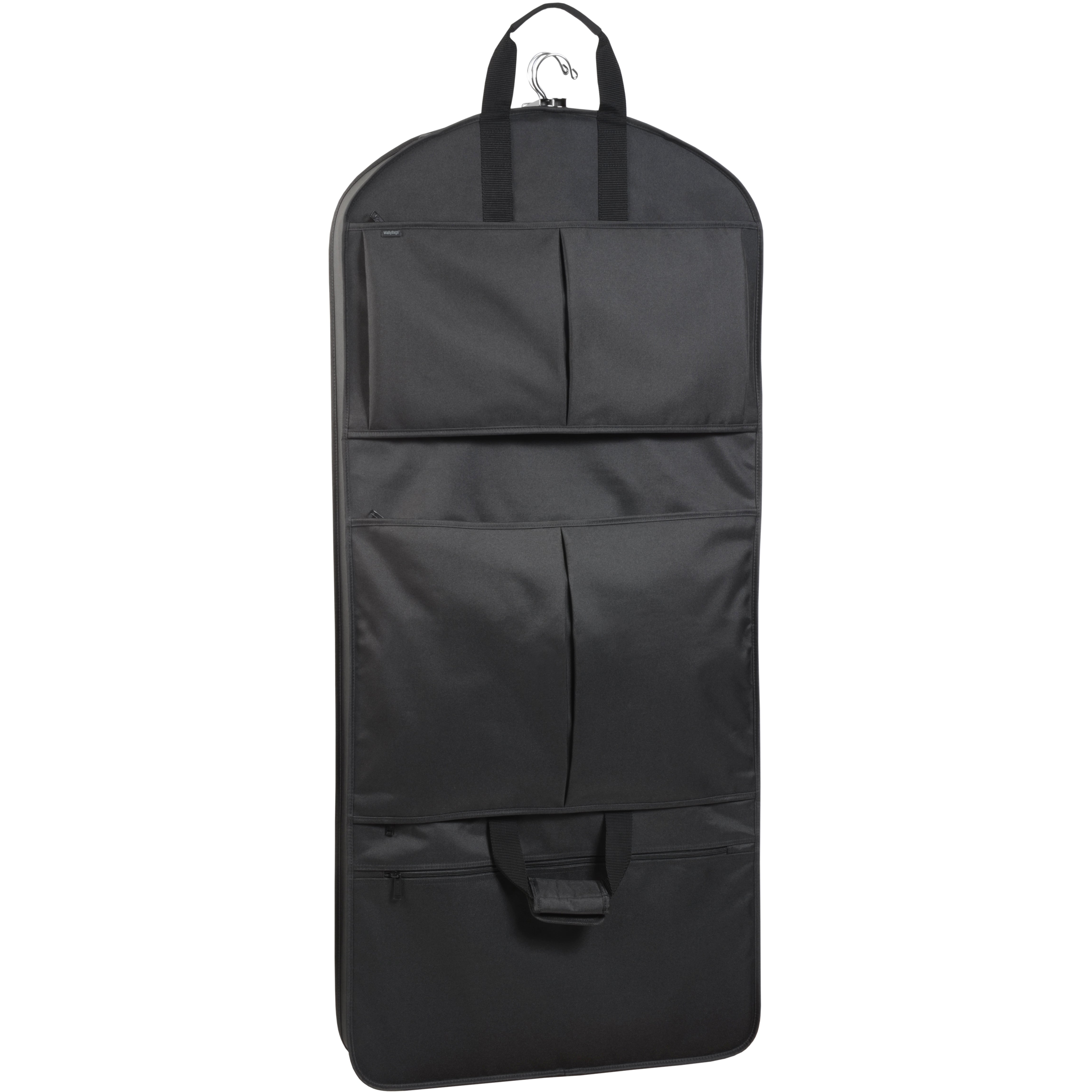 This 48-inch length holds various sized suits, dresses, uniforms and more. Clothes stay neat and wrinkle-free in this lightweight and easy to carry, fully lined, tri-fold garment bag with patented WallyLock hanger clamp. The Wally clamp holds up to 6 hangers of any kind so clothes won't fall to the bottom of the bag.