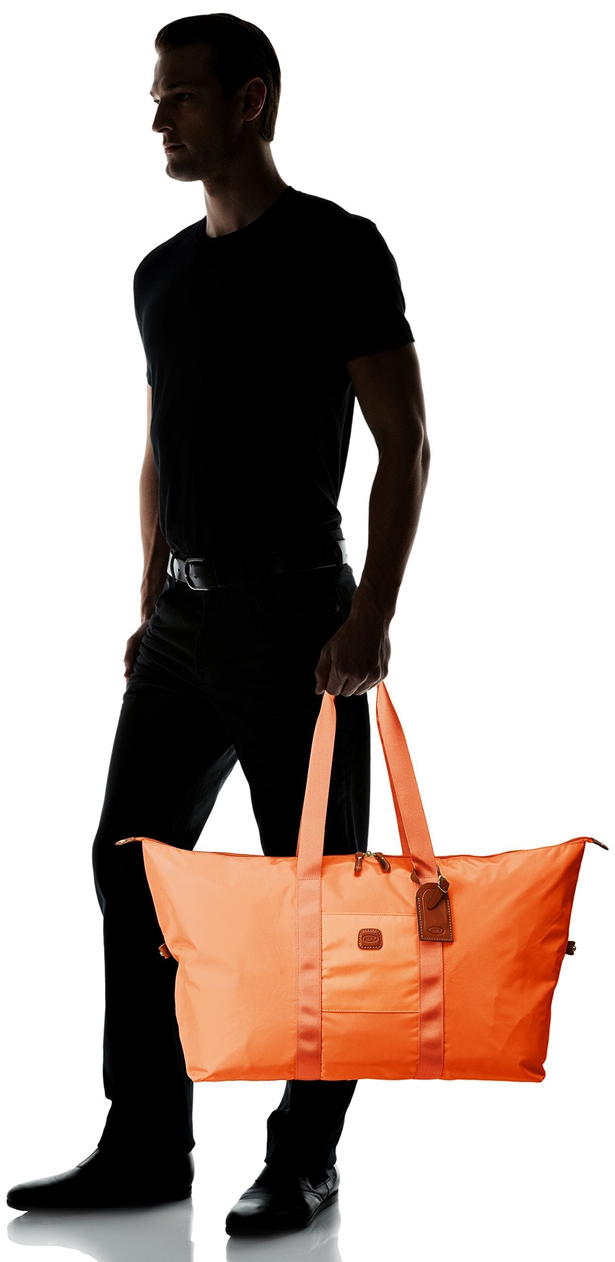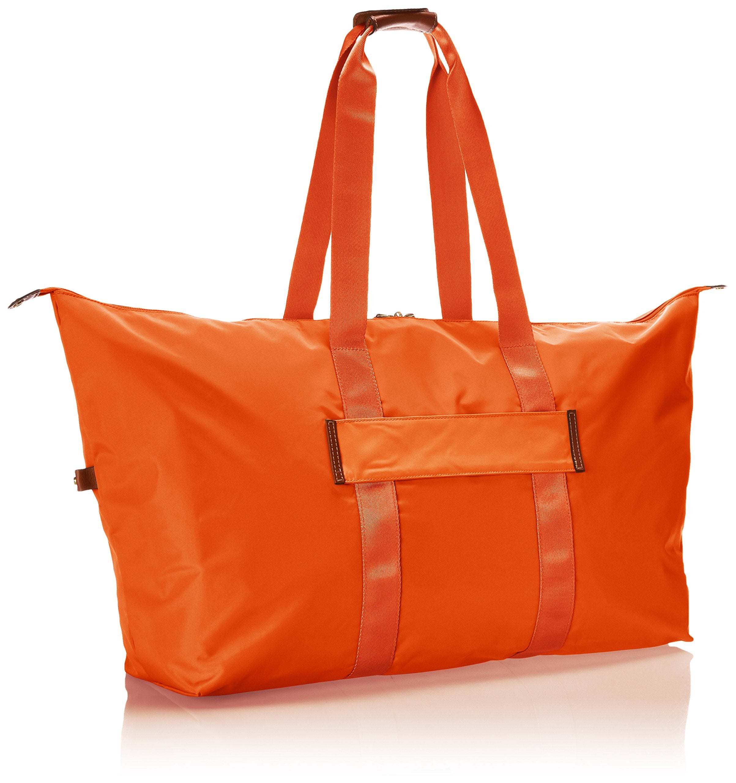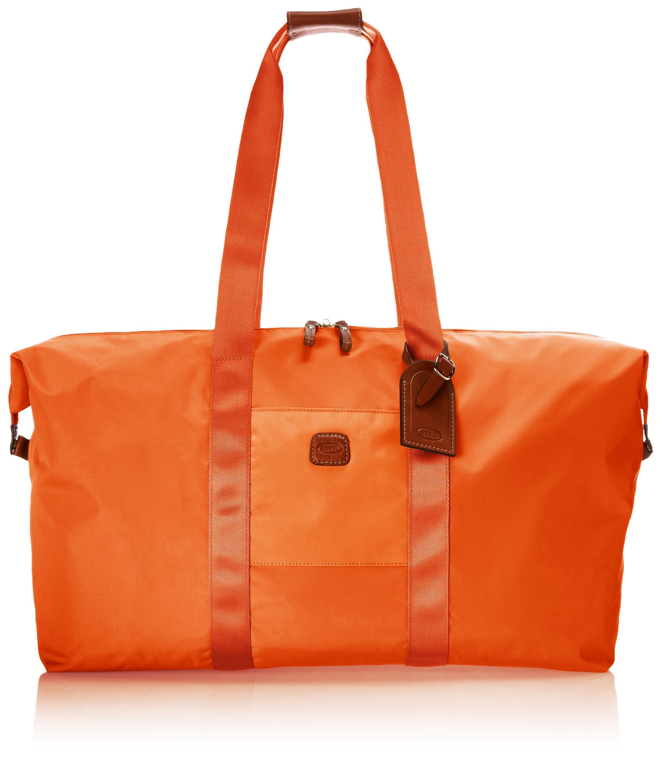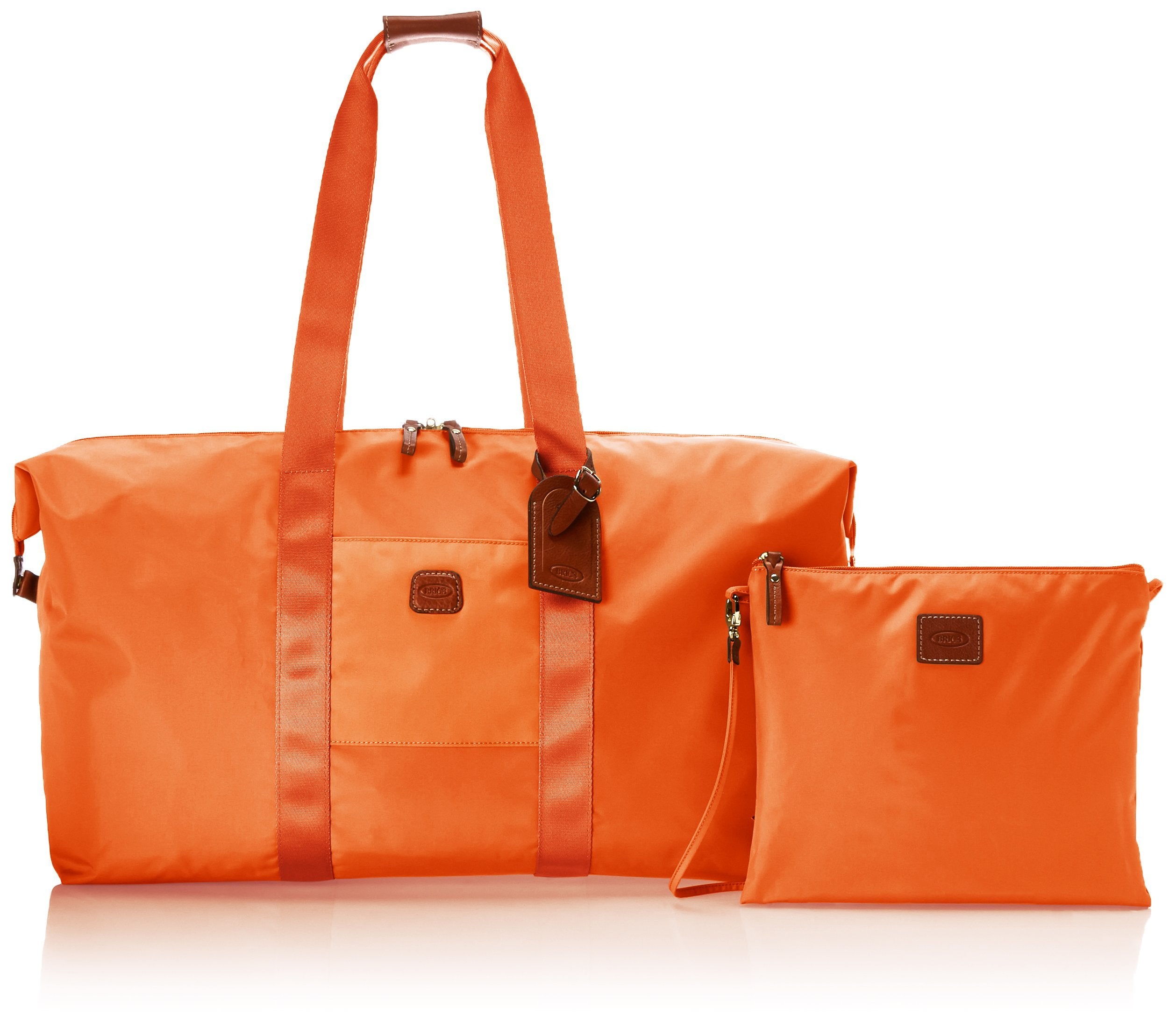 Color:Orange Melon A stylish foldable duffel carry on that fits all the extra'stuff' we bring along with us when we travel. Main compartment includes azippered closure with one interior pocket and one exterior-front pocket forsmaller items. Long straps allows bag to be worn over shoulder. Greatweekender duffle with Tuscan leather trim