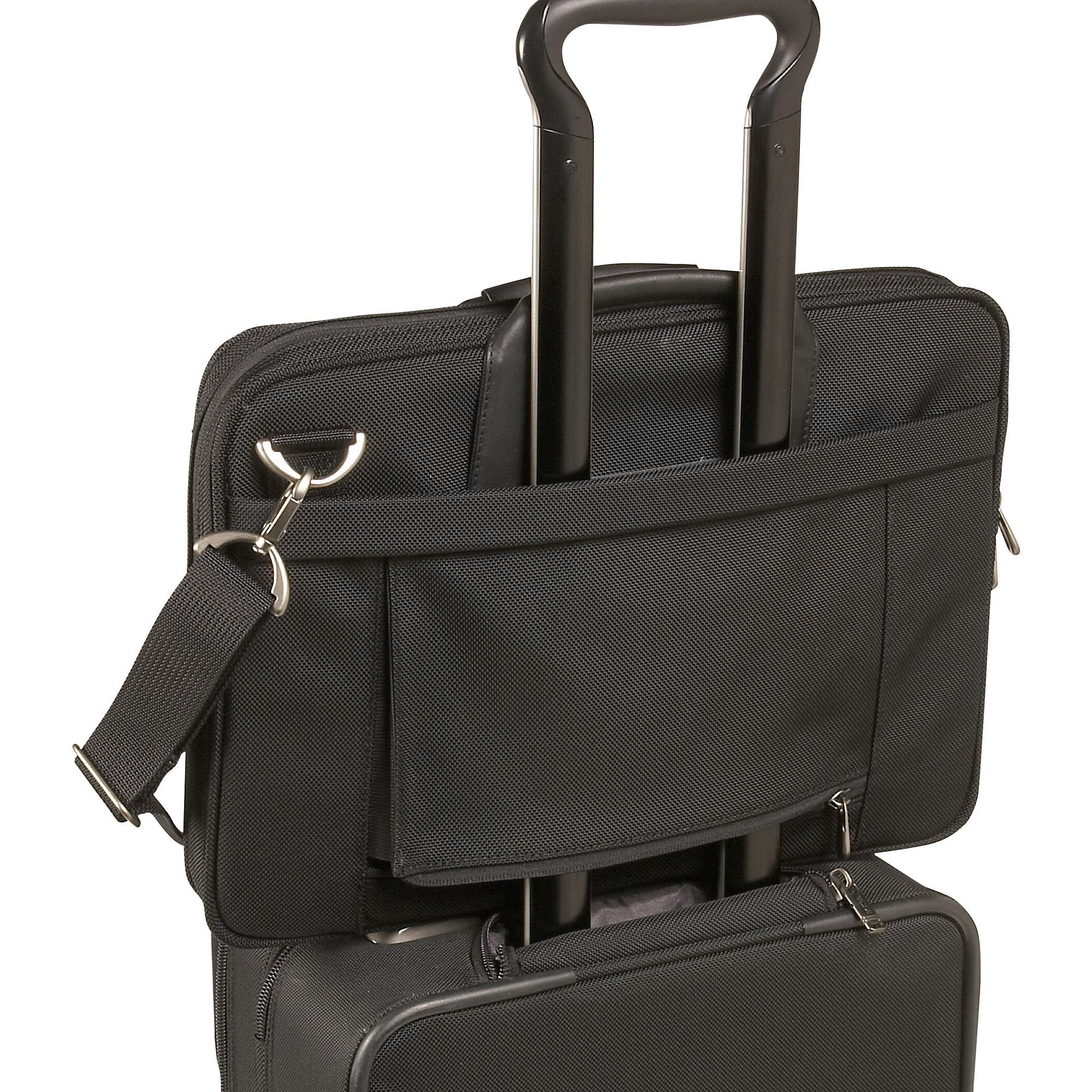 Interior Features Dual-density foam base and fleece lining for maximum protection Adjustable side impact protectors custom fit to computer usingpositioning sleevesT (patent pending) Fits most 17" laptop screens(dimensions: 11.5 x 16. 25 x 1.5) Exterior Features Retractable leatherhandles and flexible should er strap for easy carrying Protective, abrasion-resistant 2520 ballistic nylon rasion-resistant 2520 ballistic nylon forultimate durabilityDual purpose b e OutsiderT handle for fast, convenienttravel Elastic, hide-away ID card conce als personal info