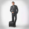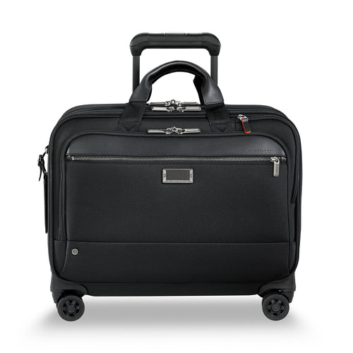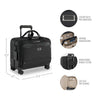 • Organizer and laptop compartment feature dual zipper pulls that can be used with a cable lock to keep contents secure. Sleek, removable hanging leather ID tag with snap window closure conceals personal information. Coated 600D nylon fabric on bottom panel protects bottom of bag while rolling. Four durable double spinner wheels for effortless 360 navigation. Three section design: organizer, main compartment and laptop compartment.