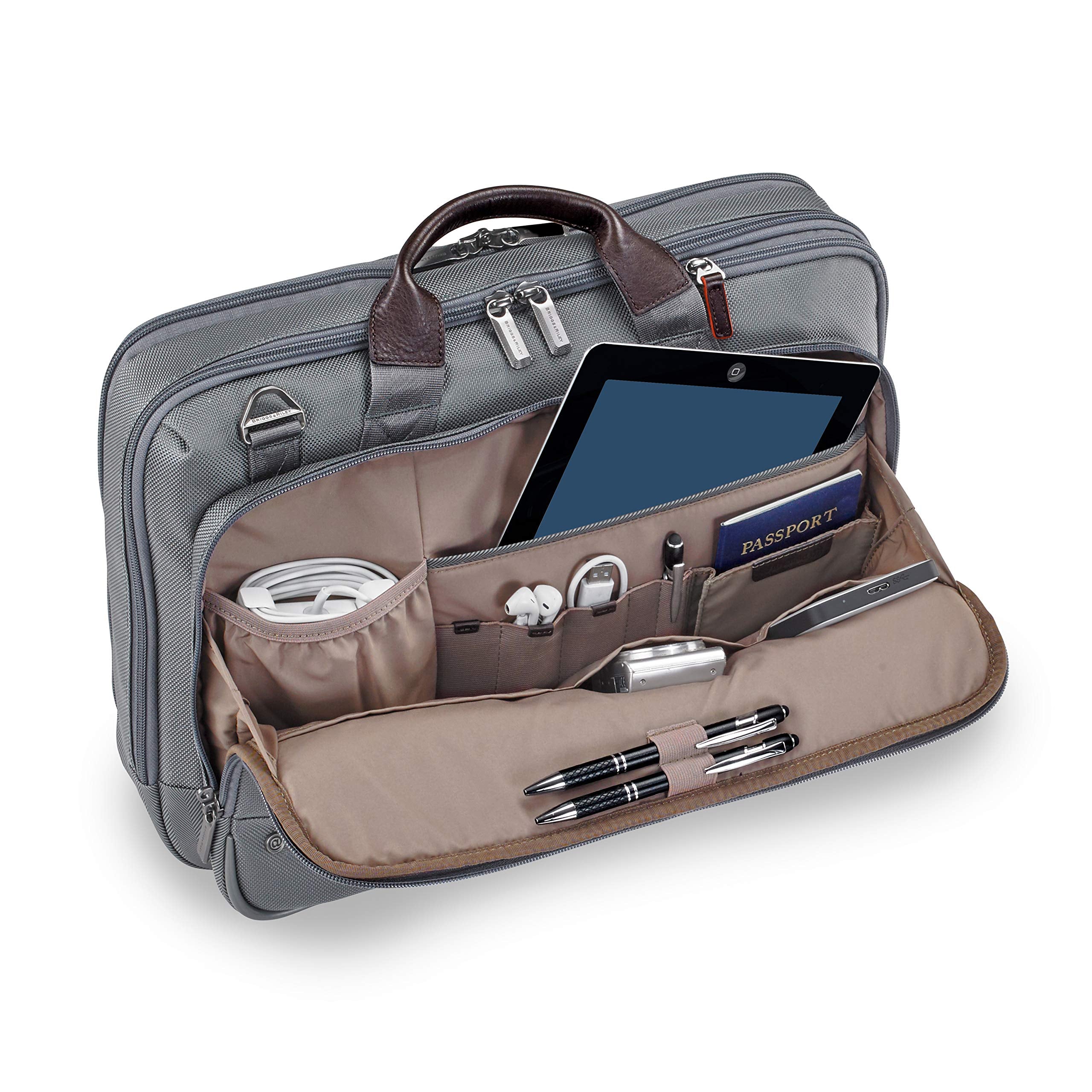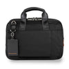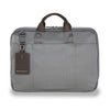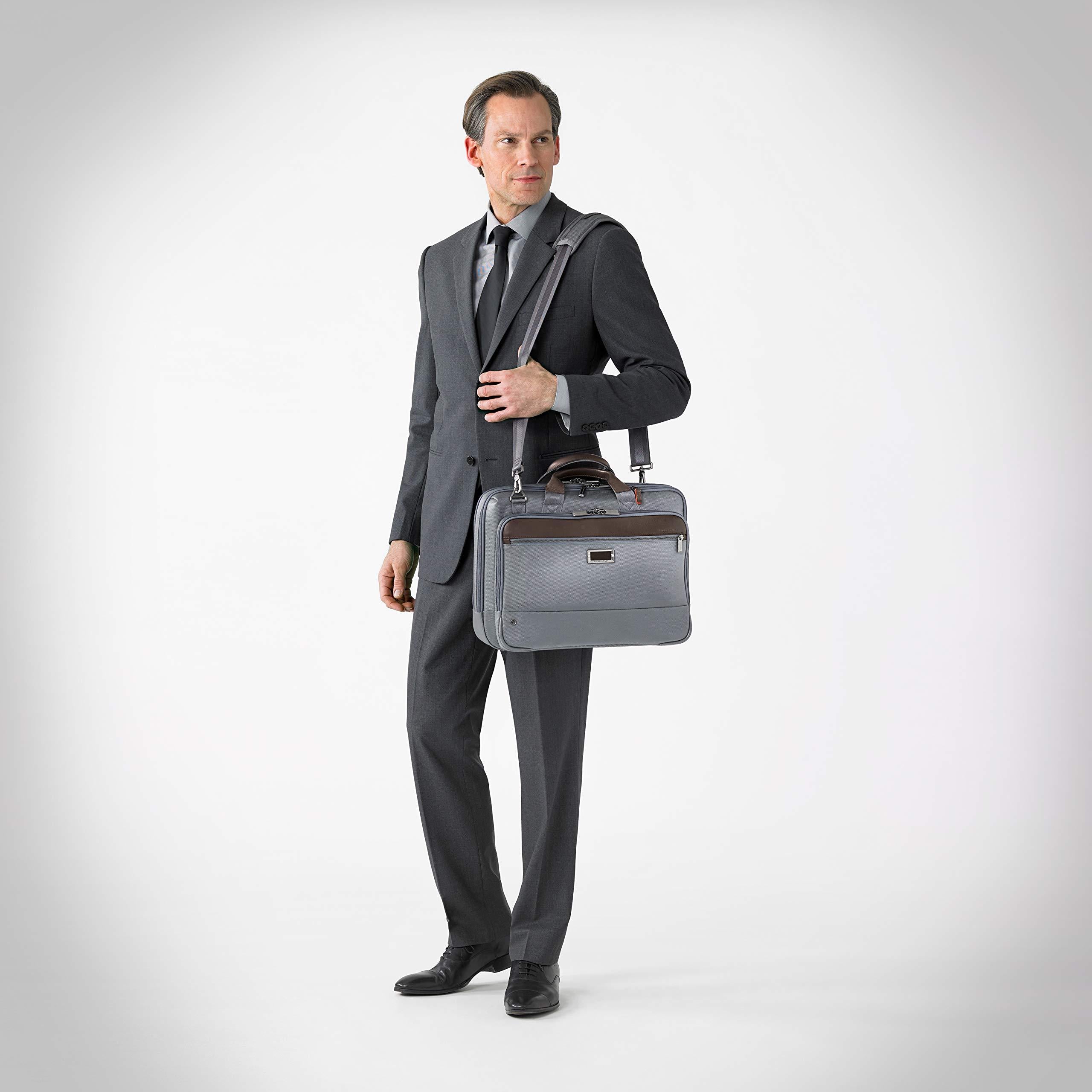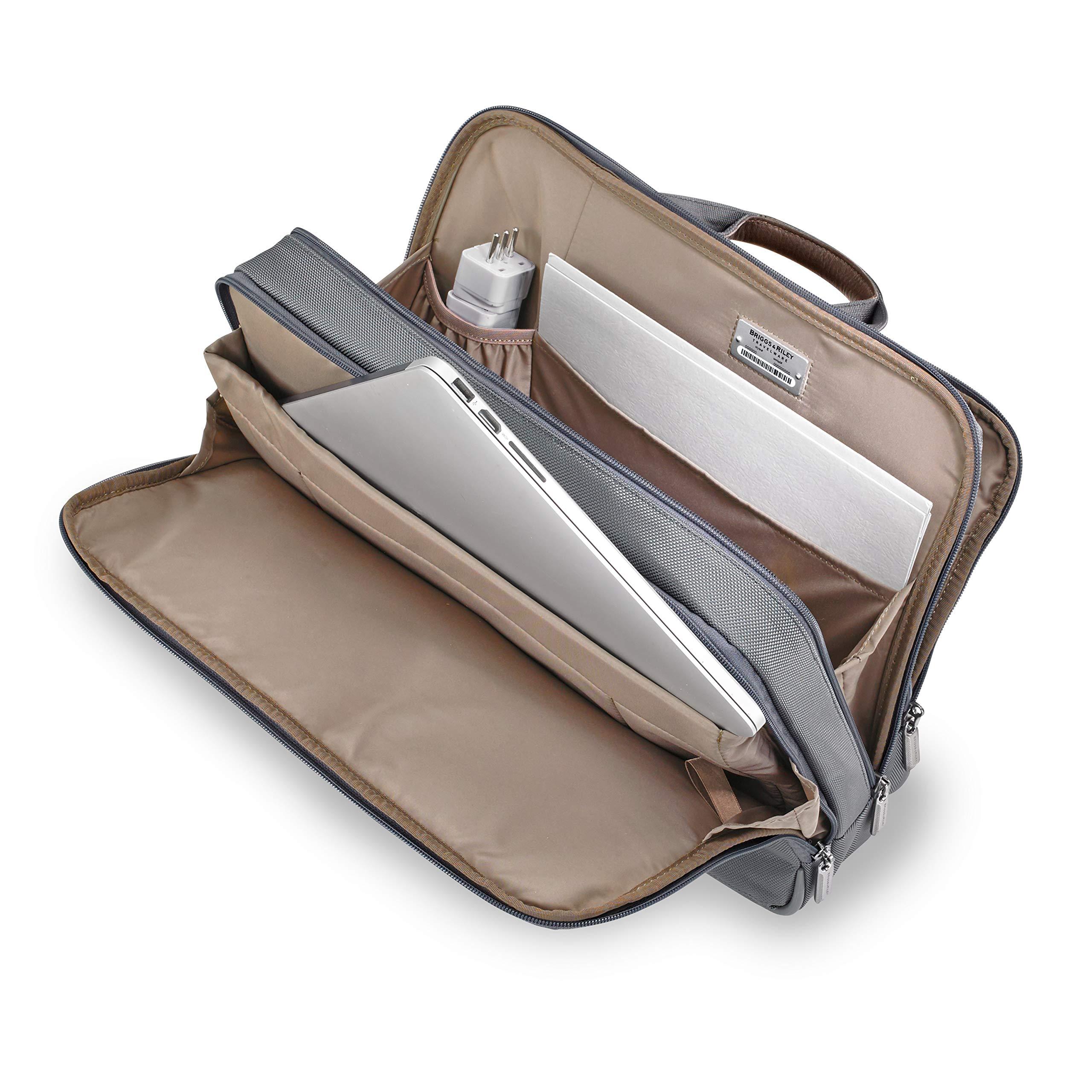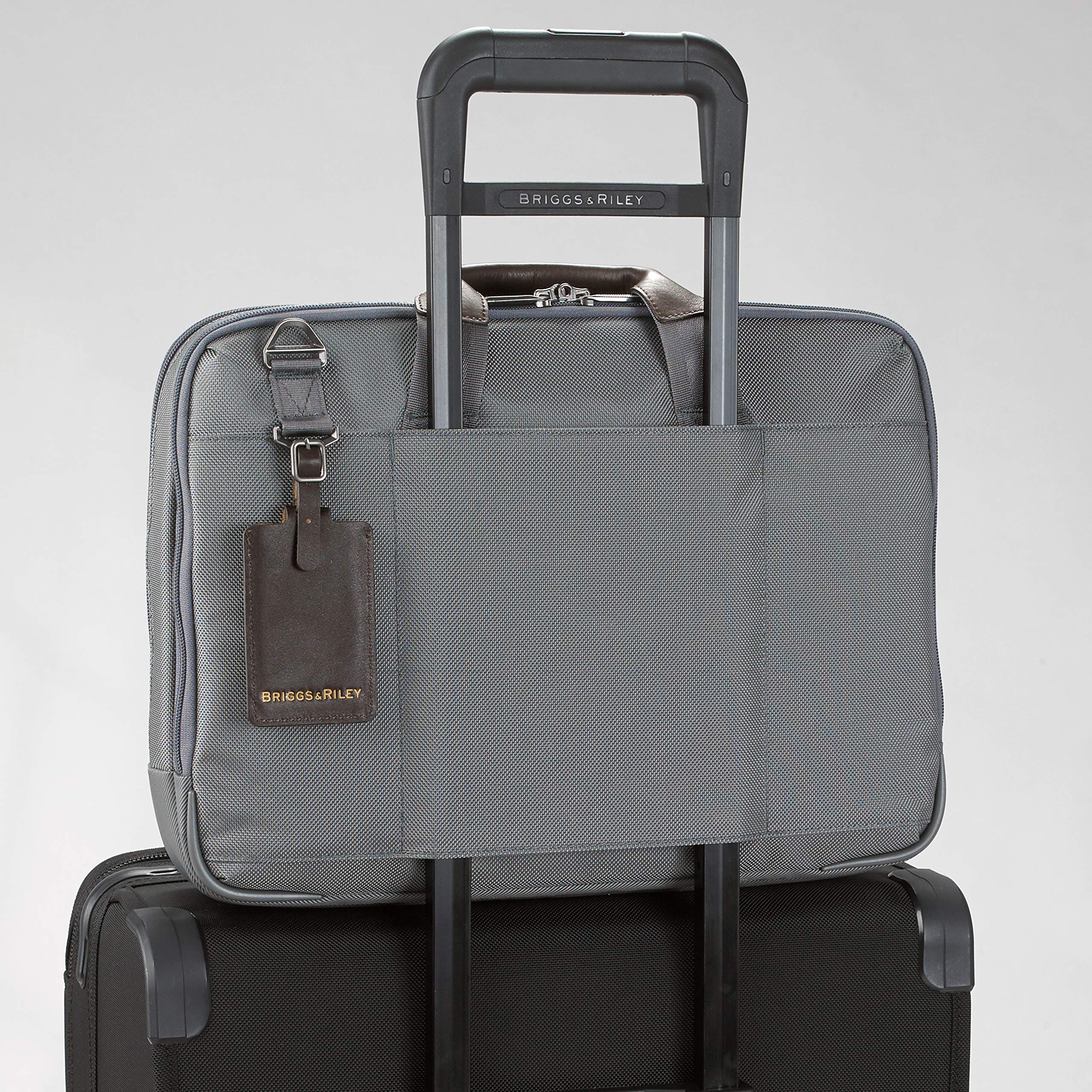 • Slip-through back panel allows bag to slide over any Briggs & Riley Outsider handle for seamless transportation of two bags as one. Coated 600D nylon fabric on bottom panel protects bag from unclean surfaces. Bottom corner guards protect bag from wear and abrasion. Three section design: organizer, main compartment and laptop compartment. Fabric lining is durable and soft; fully lined interior treats items gently; light, contrasting color makes finding contents easy.