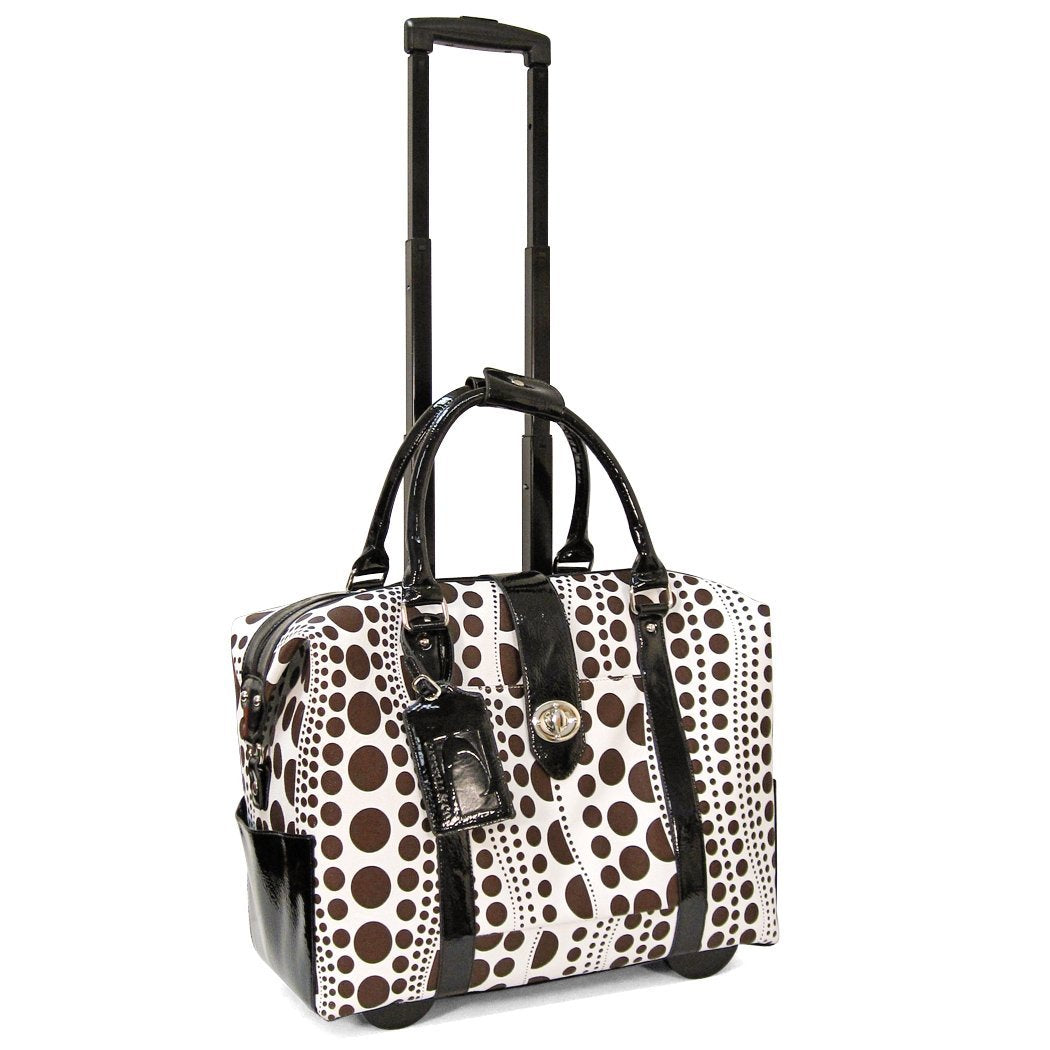 Color:Sand/Brown Fashion on wheels: this airplane carry-on size executiveroller brief, a simulated pebble leather beauty with wavy polka dot print andblack patent trim detailing, is fitted for the working, traveling woman whoappreciates the smart and unconventional, offering space, structure and style.Featuring: top zip closure; padded compartments for a 15.6 inch laptop and anelectronic tablet or reader; retractable handle; rollerblade wheels;coordinated id tag; inside organizer compartments for cards and pens; insideid defender zipped pocket; exterior front slip pocket with turn lock tabclosure and 2 side slip pockets. Exterior dimensions: 17.5 inch wide x 13 inchhigh x 8 inch deep.