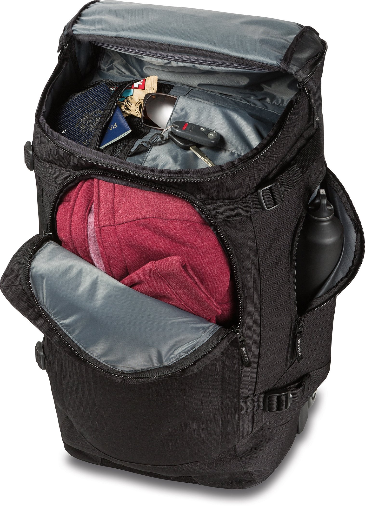 One bag for every trip is an admirable goal and with the Dakine Sherpa Roller 60L its one you might be able to achieve With a collapsible handle and smooth rolling urethane wheels youll be navigating terminals and hotel lobbies with ease and the spacious 60 litres of interior space gives you plenty of room for your clothes But when the trip is a bit more rugged simply unzip the back panel and reveal a padded hipbelt and harness making it a little bit easier to get your gear and supplies up to that cabin in the woods Wherever youre going the side compression straps will help stabilize bag contents during travel and the interior organizer pockets make sure you can always find what youre looking for Specs Fabric 600D Polyester Volume 60 litres Empty Weight 9 lbs Dimensions 24 x 13 x 13 Features Zip away straps and hipbelt let this bag convert from roller to backpack Interior lid organizer pocket keeps smaller items easier to find Side compression straps keep bag contents stable Interior security pocket for storing valuables Urethane wheels roll fast and smooth and are easily replaced Retractable handle