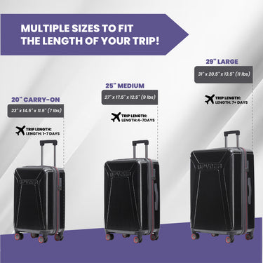 • ENJOY TRAVELING AGAIN: If youre tired of hauling around heavy and bulky luggage bags then our lightweight luggage set is what youve been looking for. Our hardside spinner luggage set comes with a 29" suitcase (32x20x12.75 inches), 25" suitcase (27.25x18x11.5 inches) and 21" carry on suitcase (24.7x10.25x15.25 inches)