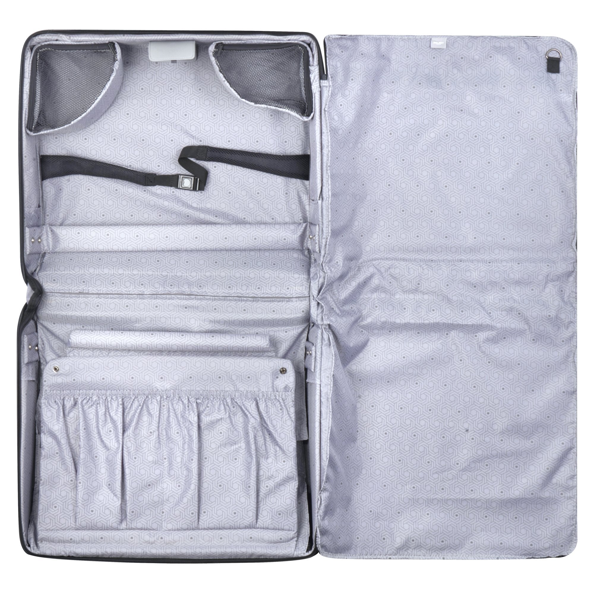 • Book opening design with universal clamping system to secure hangers and extender panel to accommodate longer garments